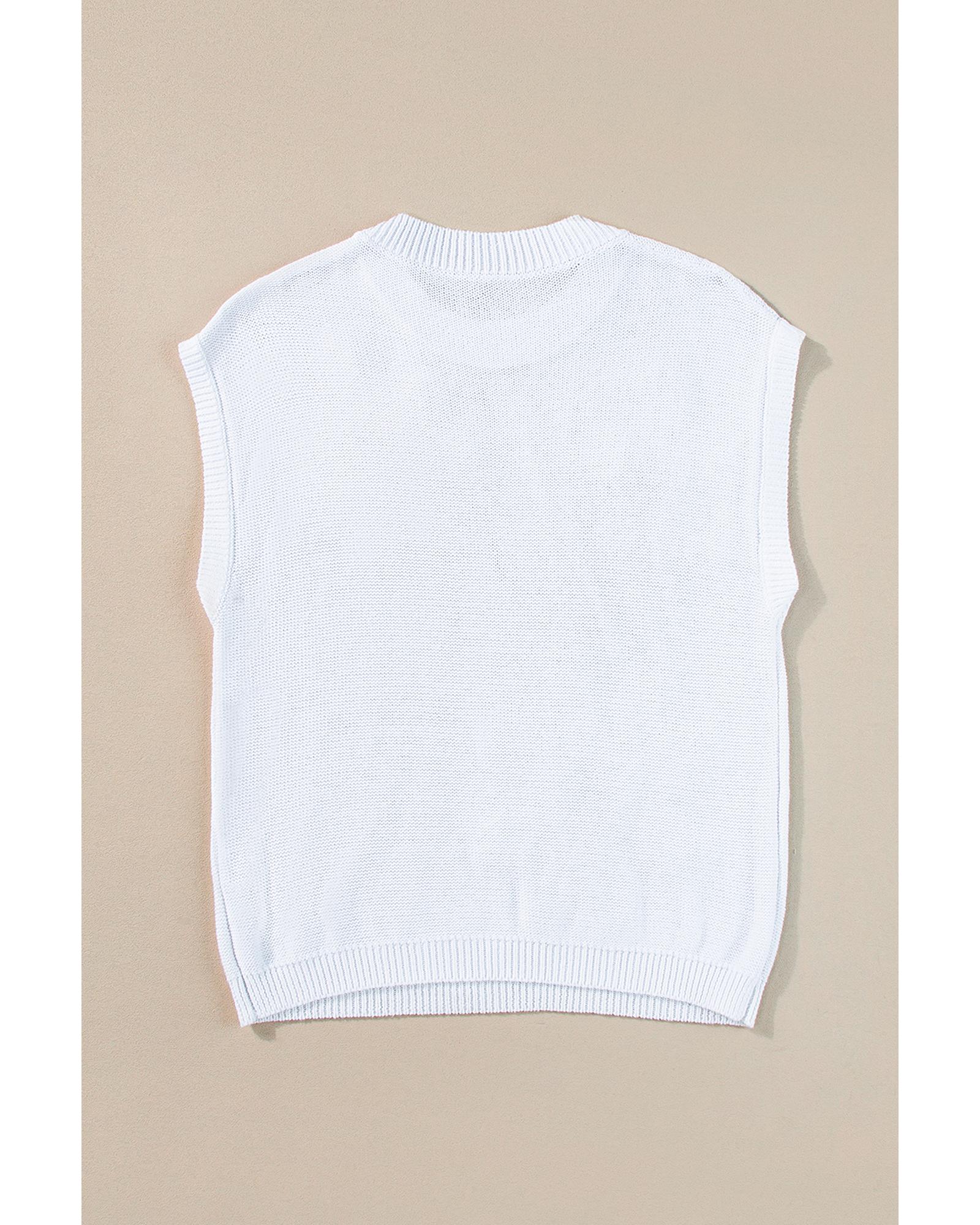 White Colorblock Crochet Knit Ruffled Short Sleeve Sweater Top - XL