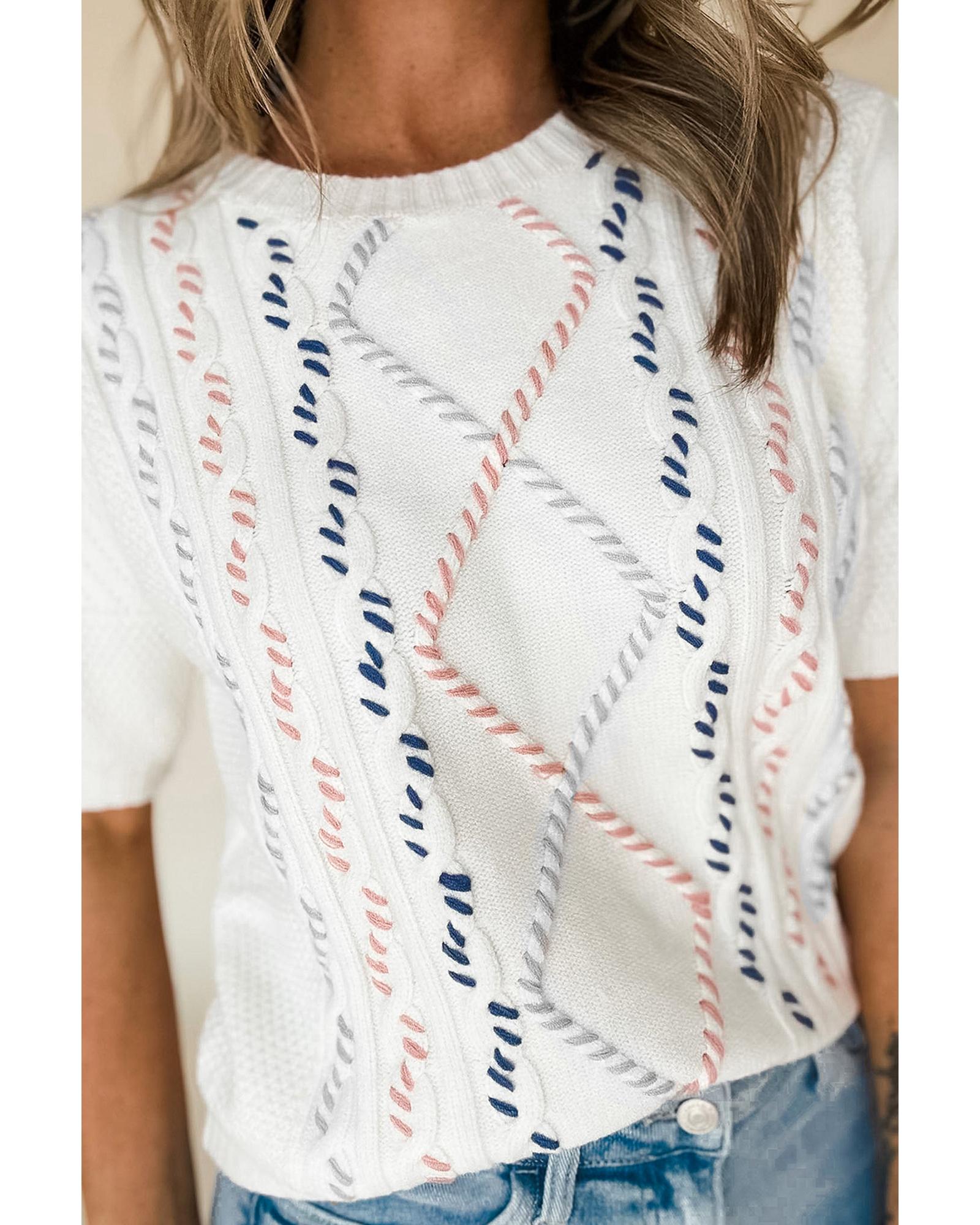 White Multicolor Stitch Detail Cable Knit Short Sleeve Sweater – M