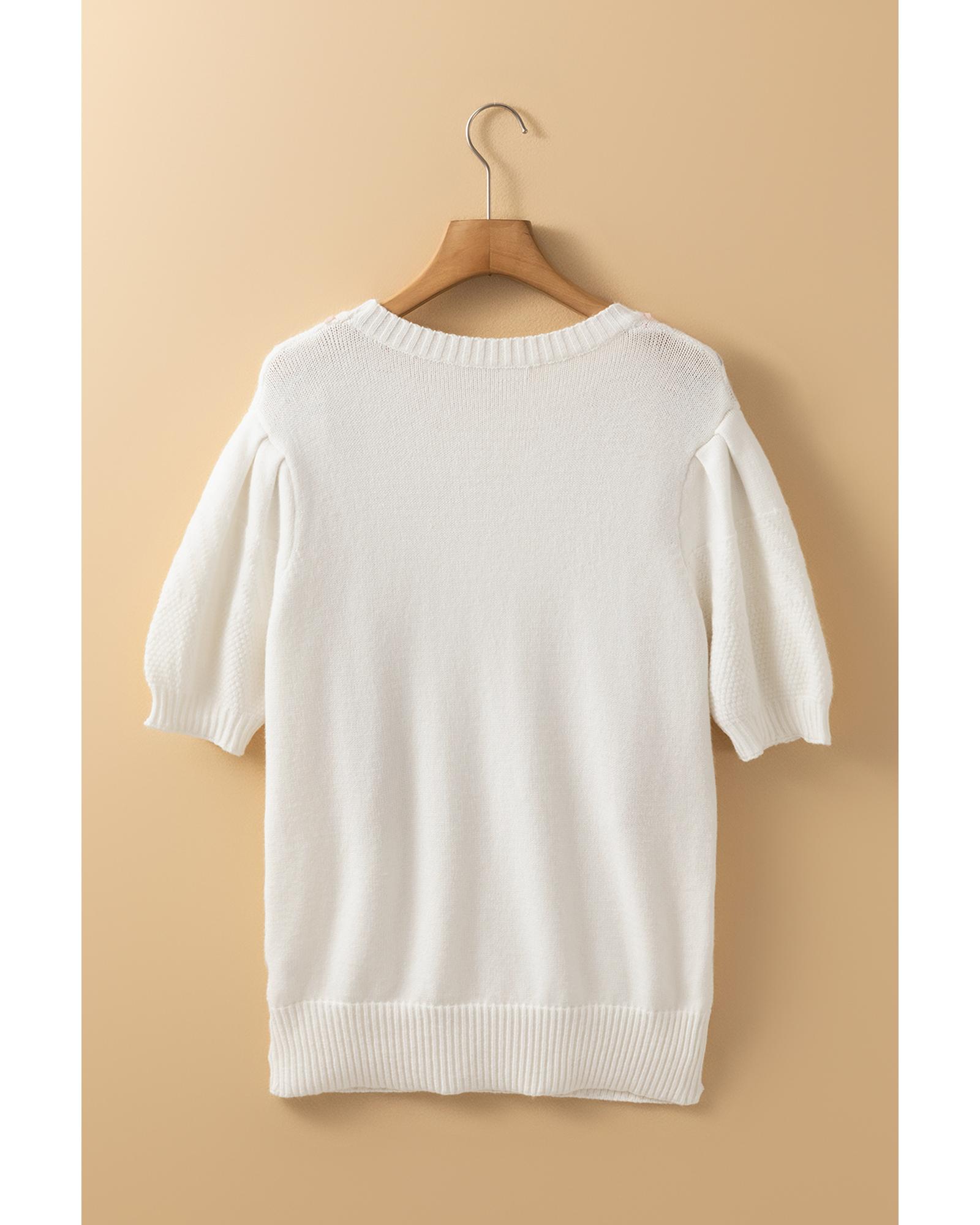 White Multicolor Stitch Detail Cable Knit Short Sleeve Sweater – XL