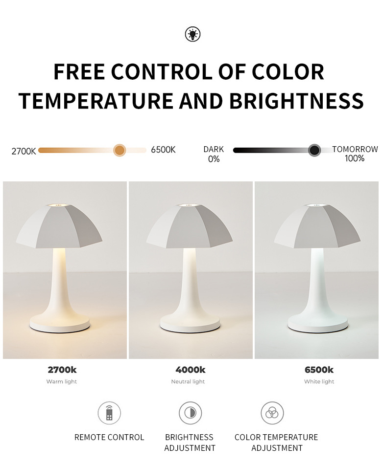 Elevate your space with this Nordic Umbrella Mushroom Table Lamp. Inspired by Danish design, this elegant ambient light features a unique umbrella-shaped shade, perfect for bars, living rooms, or as a sophisticated bedside night light. Crafted from iron and acrylic, it offers stepless dimming and adjustable color temperatures for a customized lighting experience.