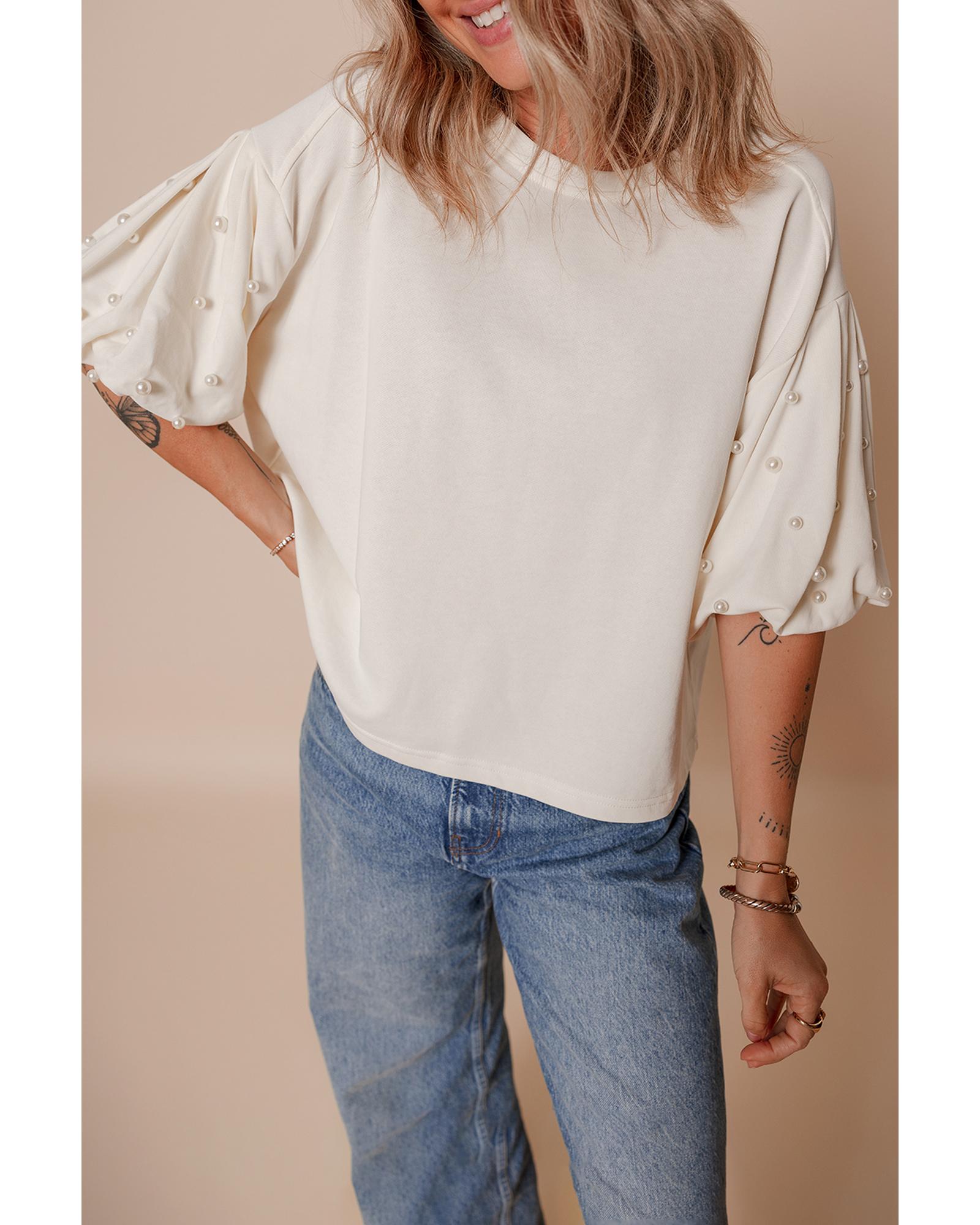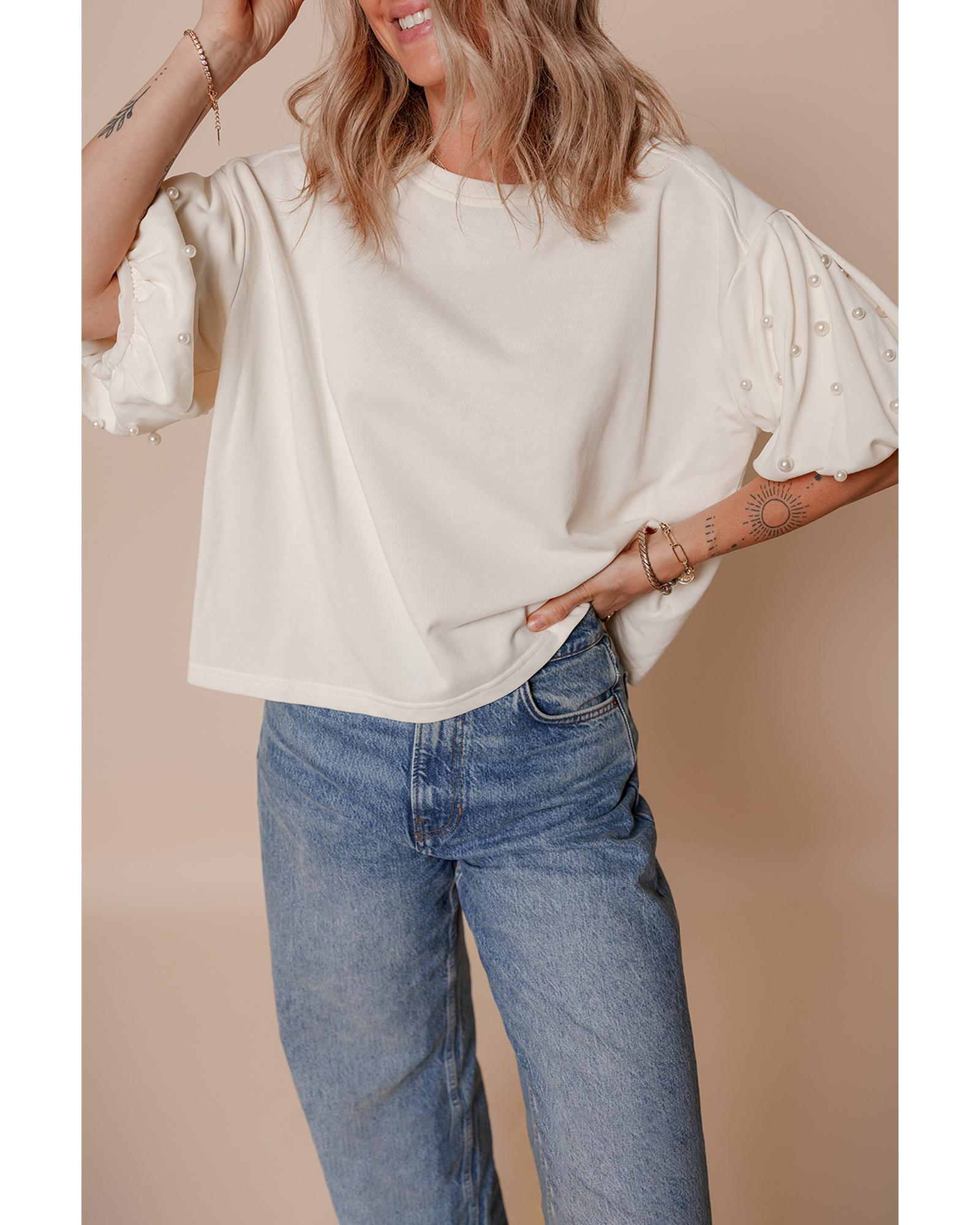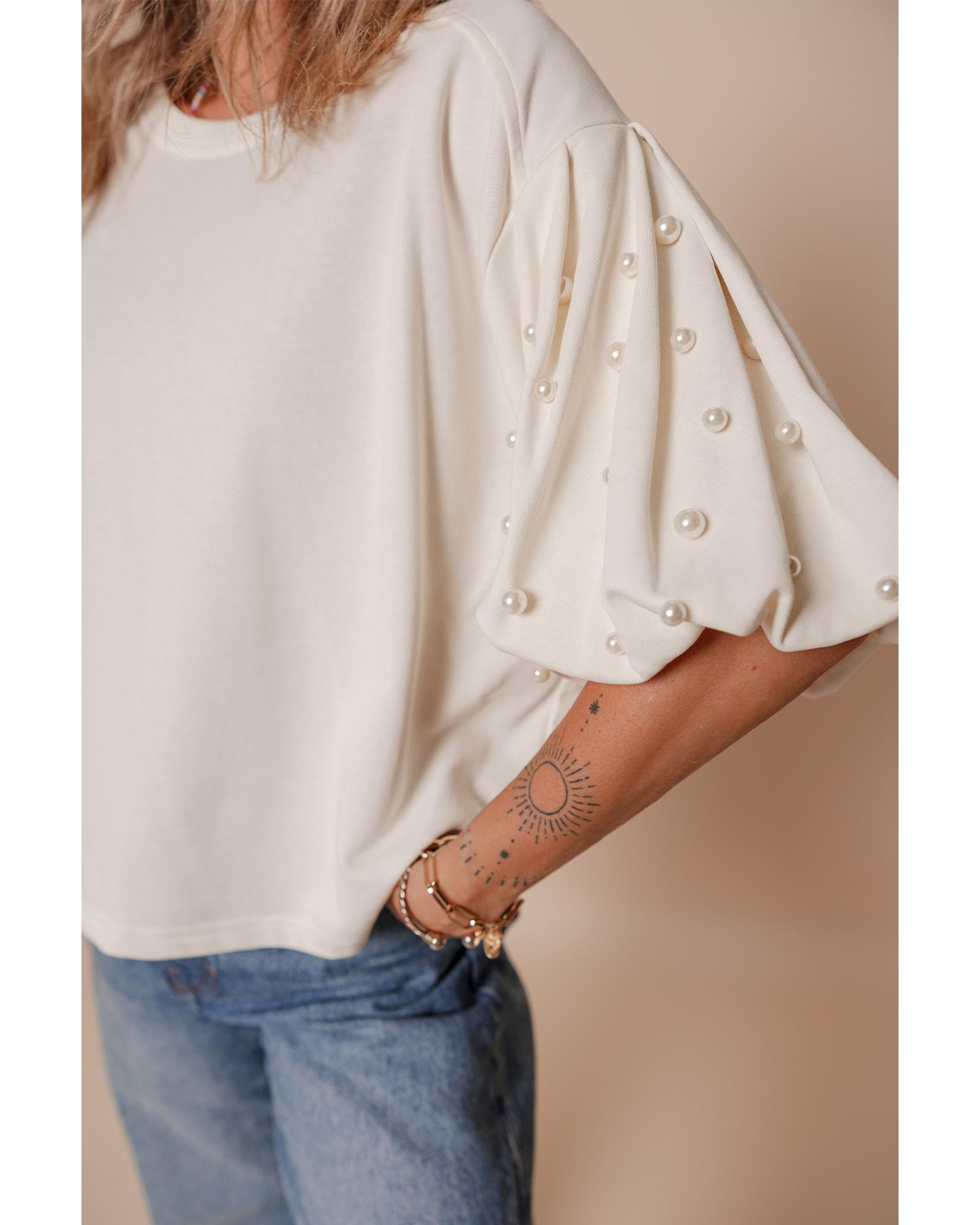 White Pearled Puff Sleeve Round Neck Loose Top – L