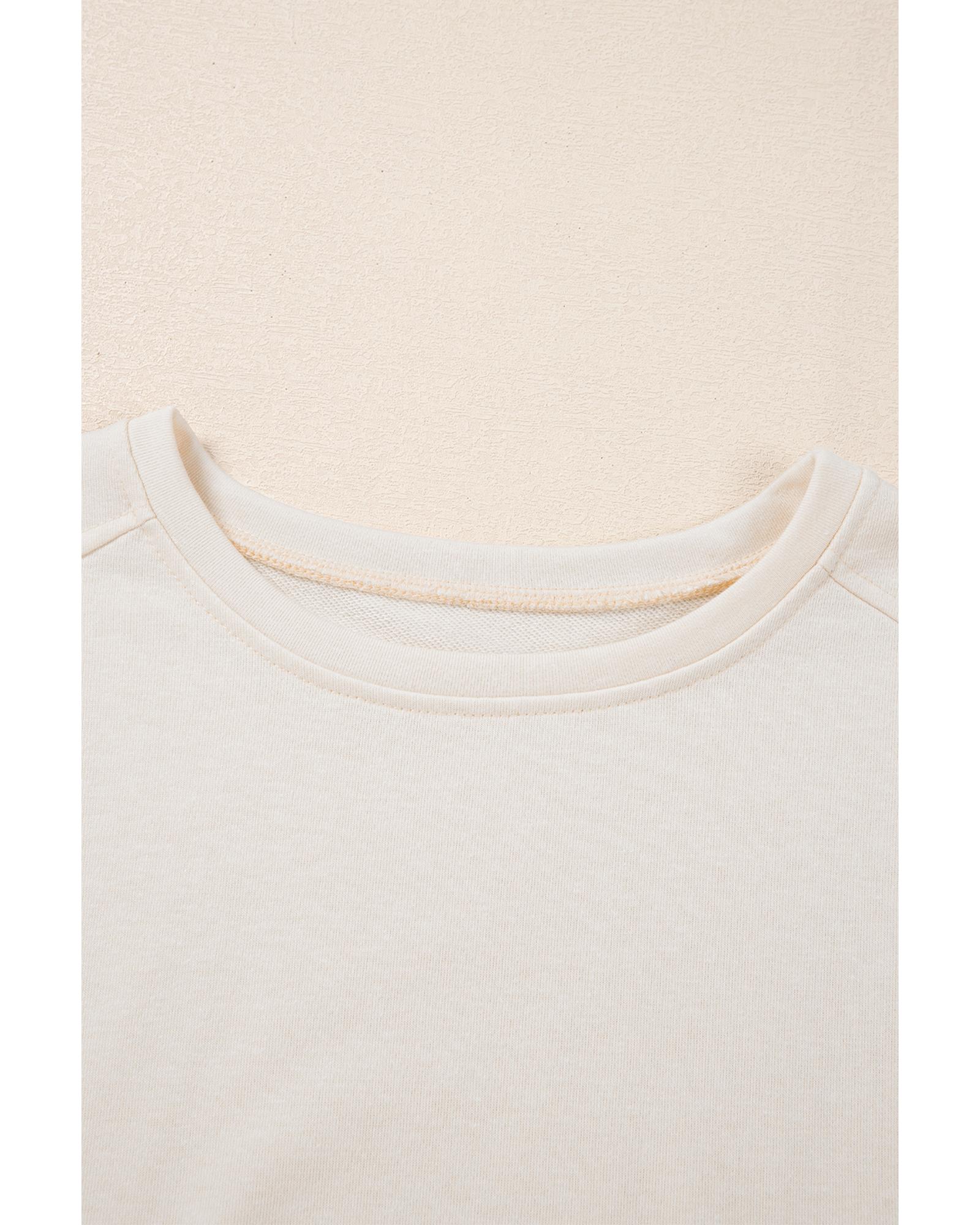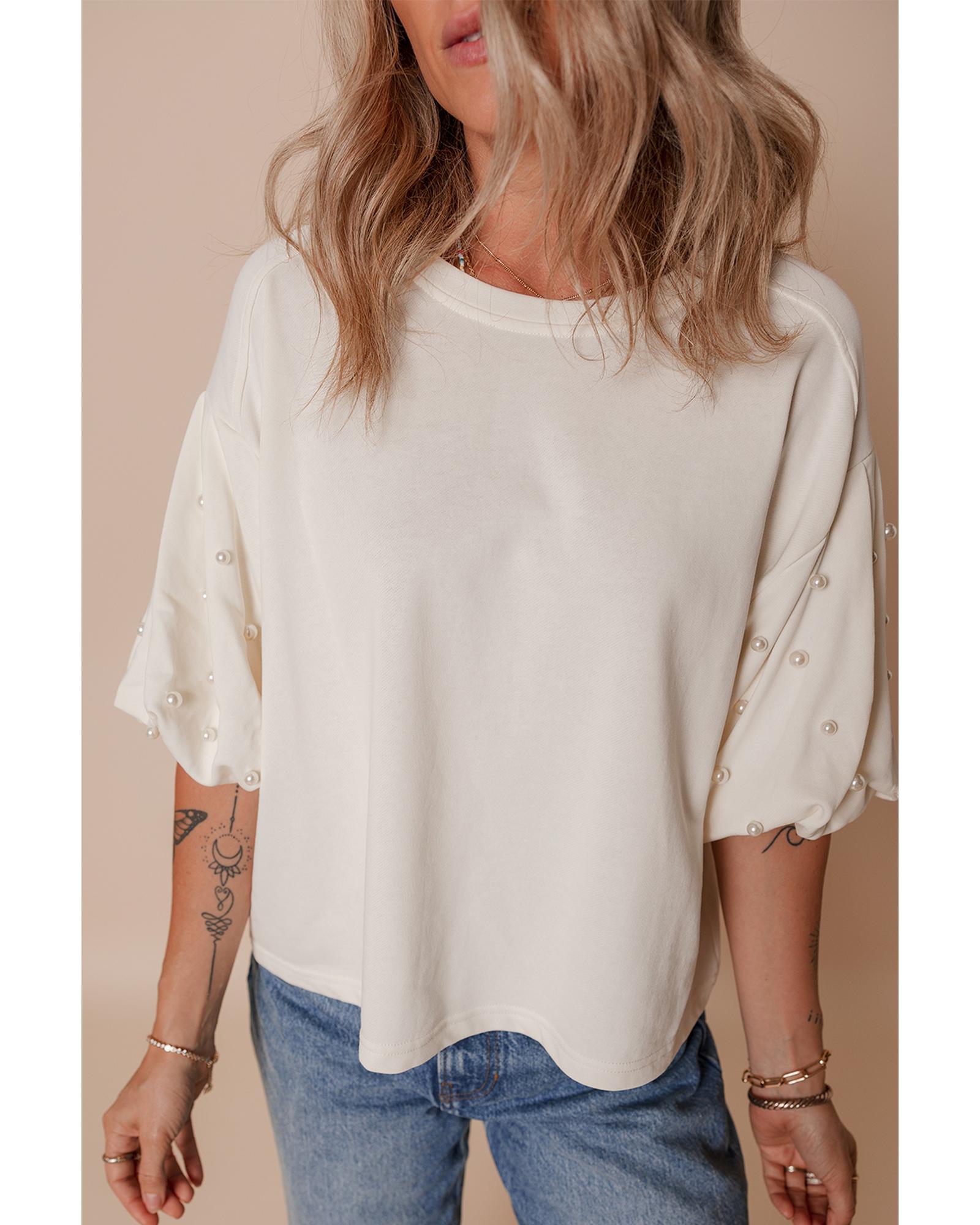 White Pearled Puff Sleeve Round Neck Loose Top – M