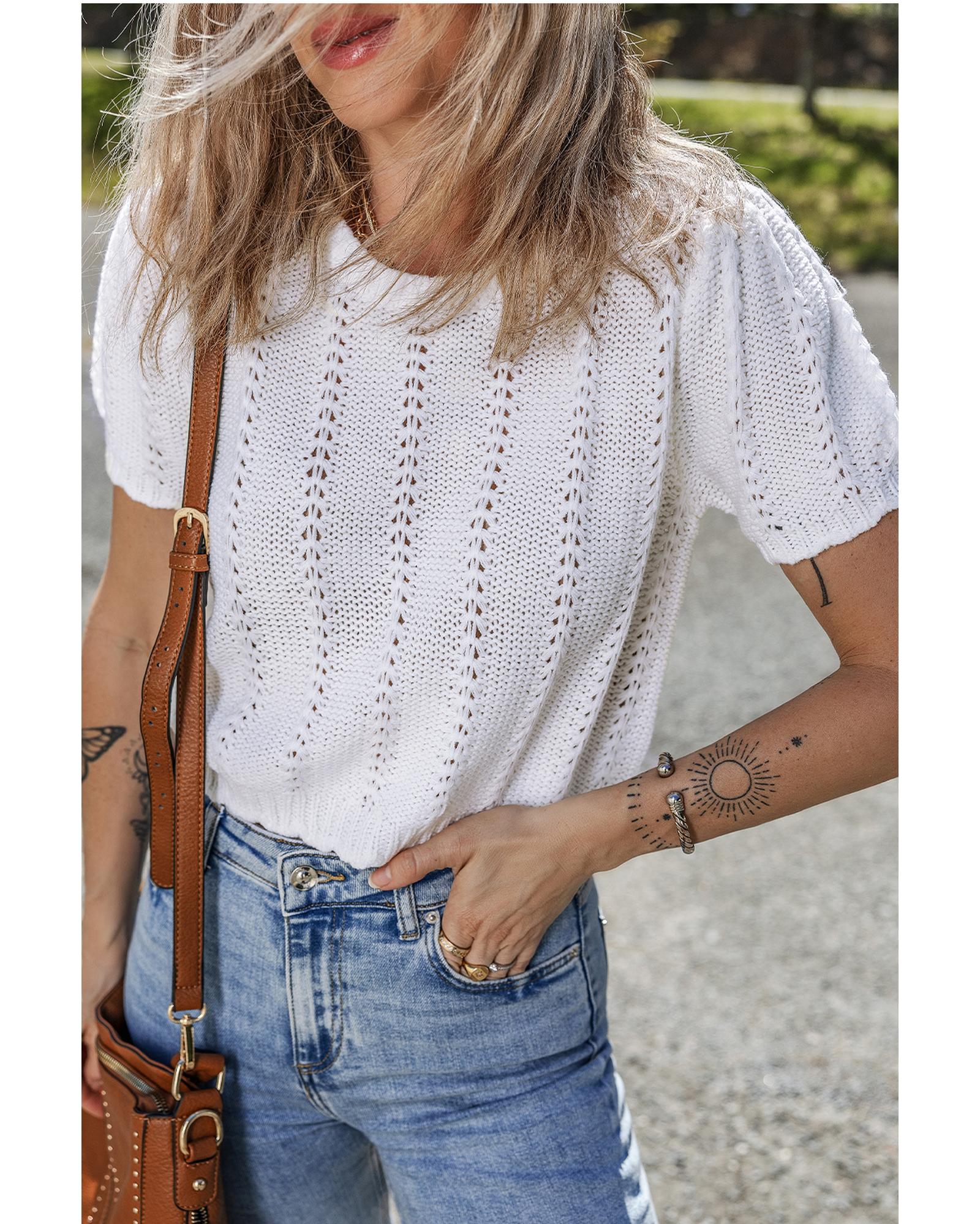 White Pointelle Knit Short Puff Sleeve Crewneck Sweater – XL