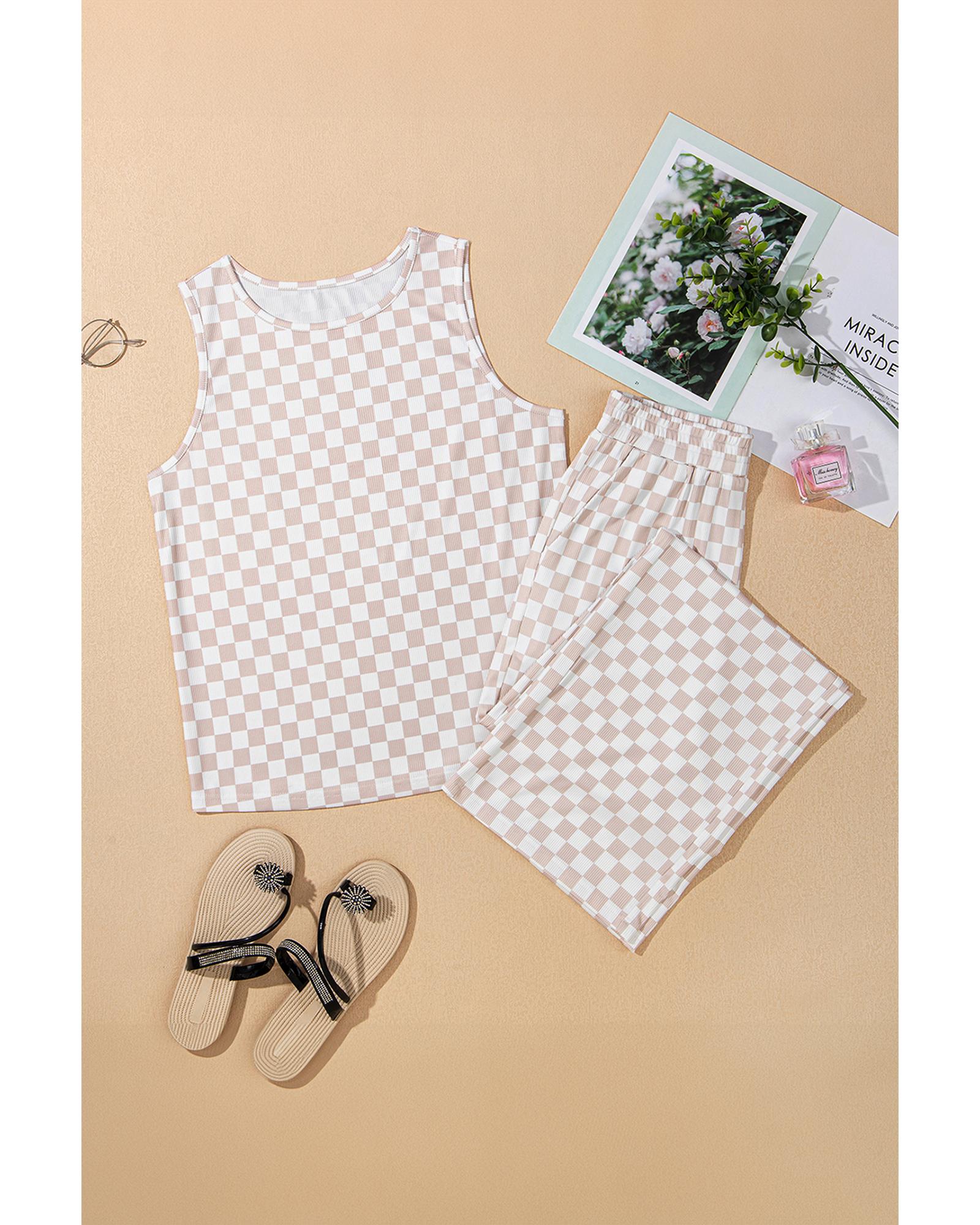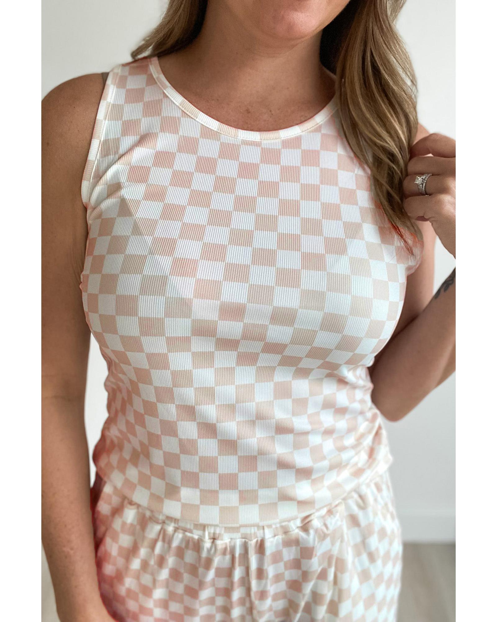 - White Ribbed Texture Checkered Print 2pcs Tank and Pants Set