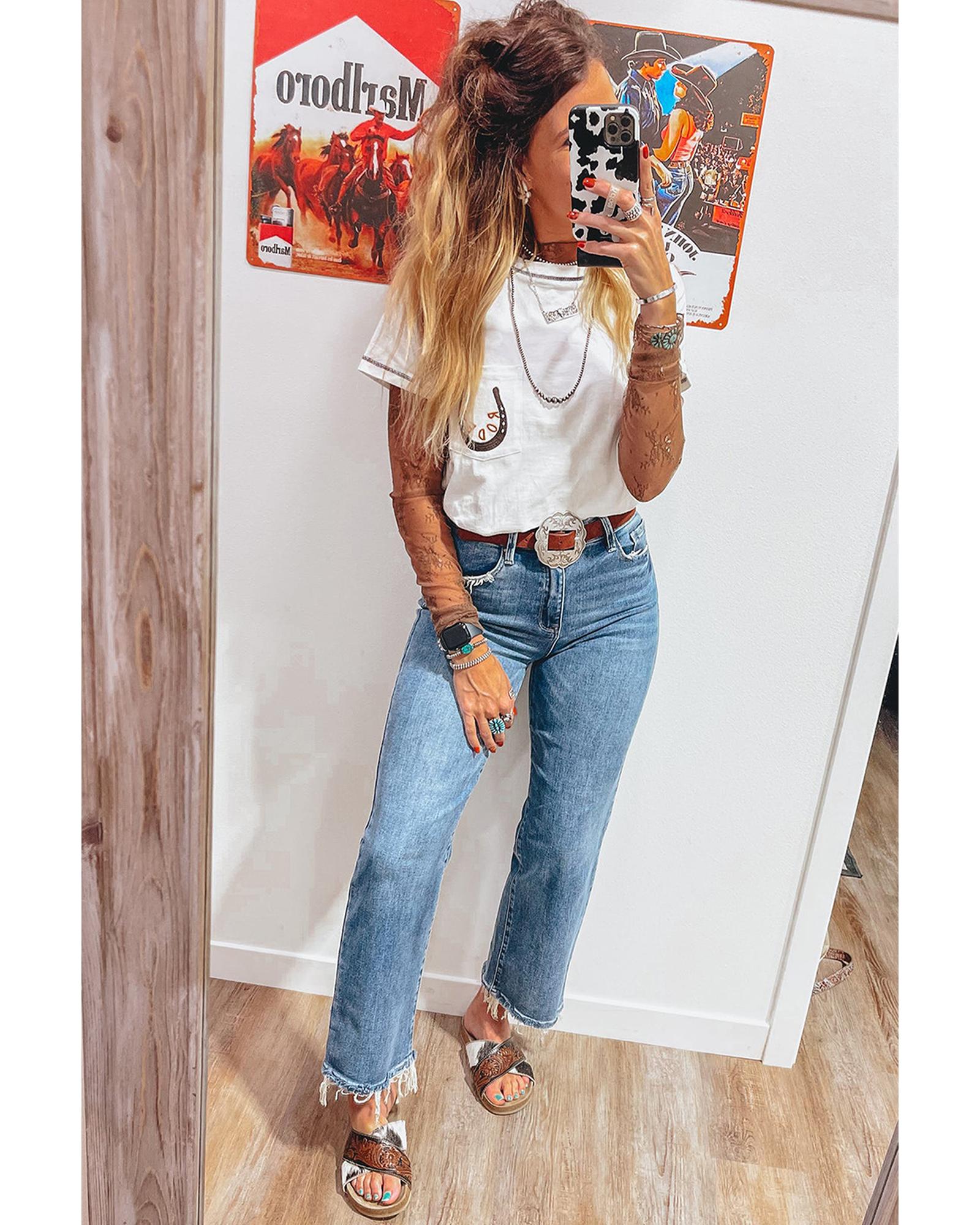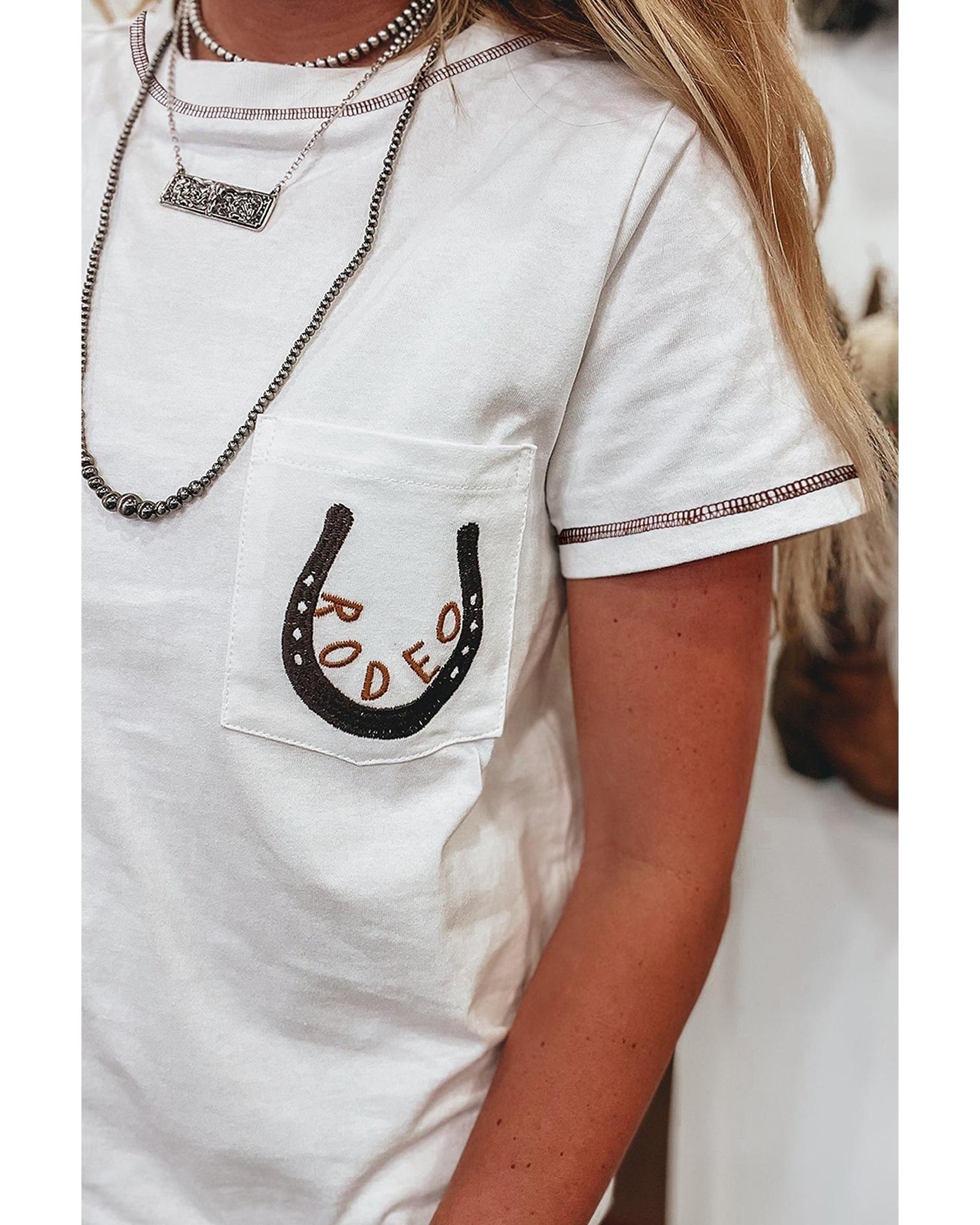 White RODEO Horseshoe Embroidered Patch Pocket T Shirt – L