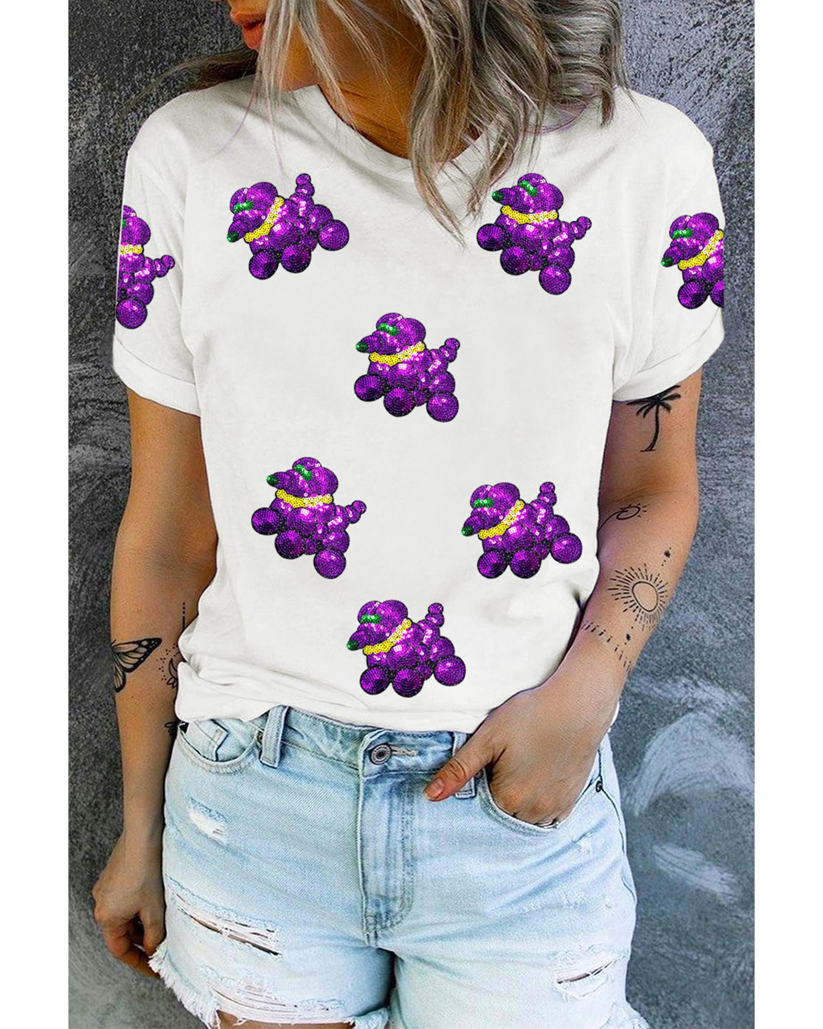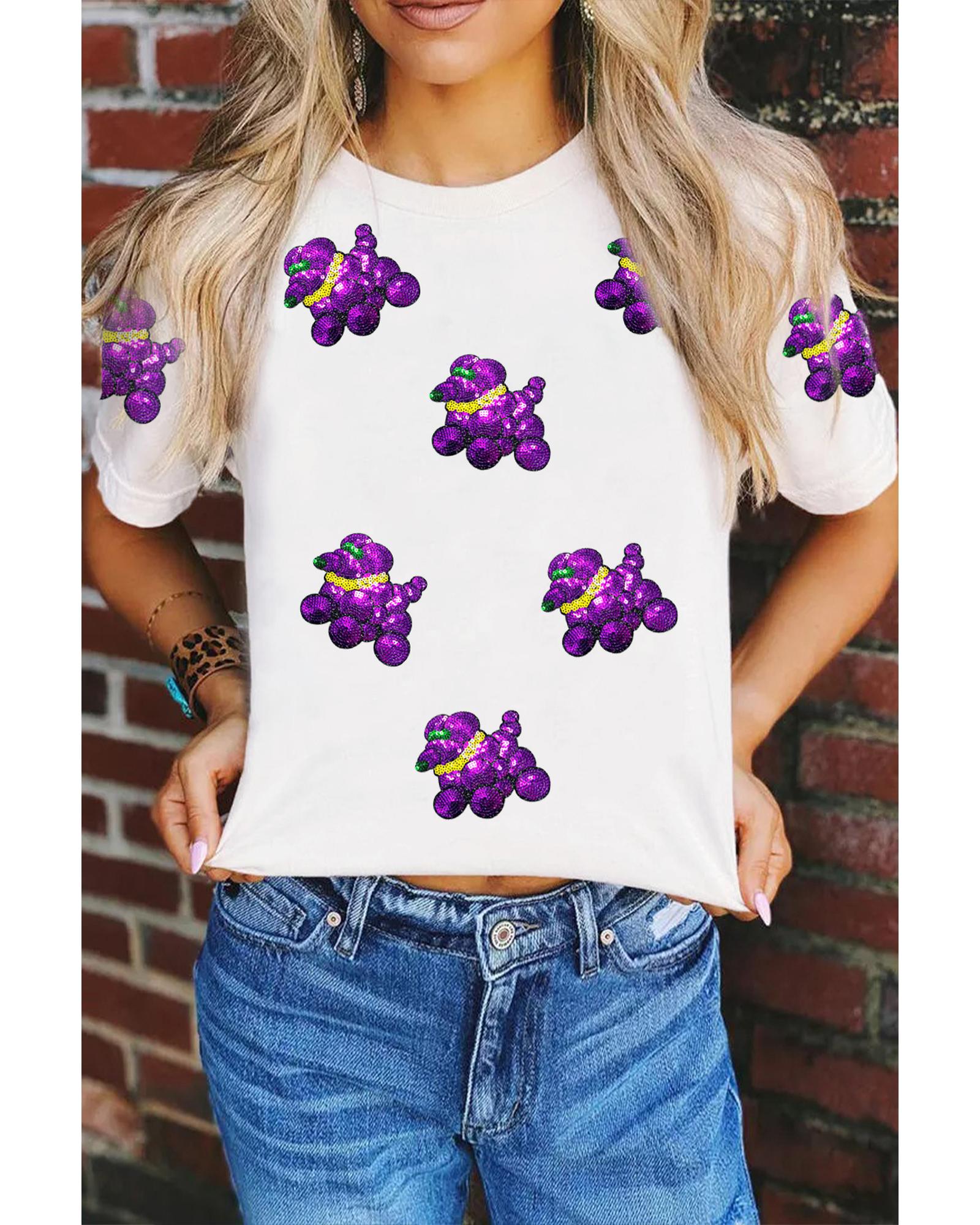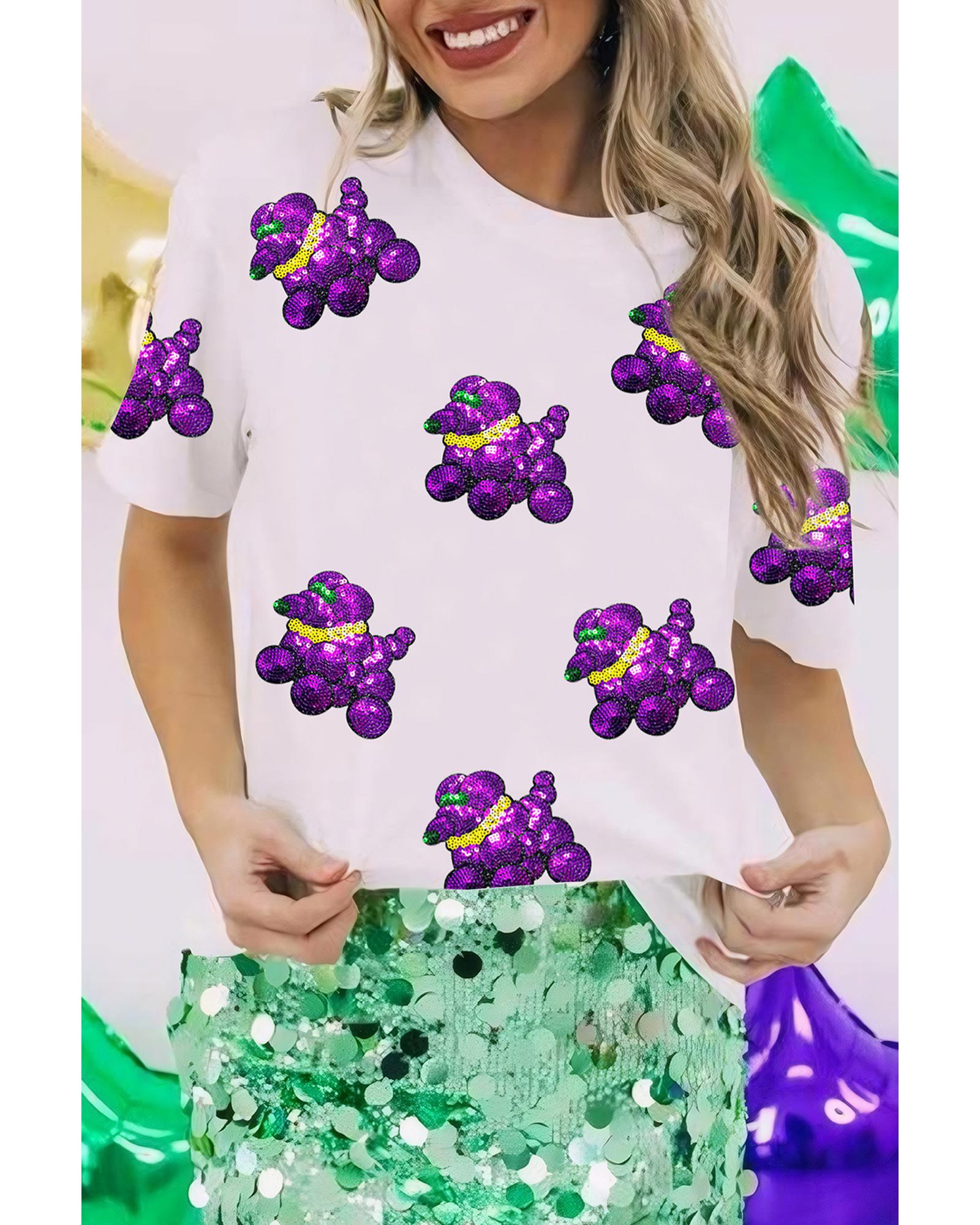 White Sequin Balloon Puppy Graphic Mardi Gras Tee – M