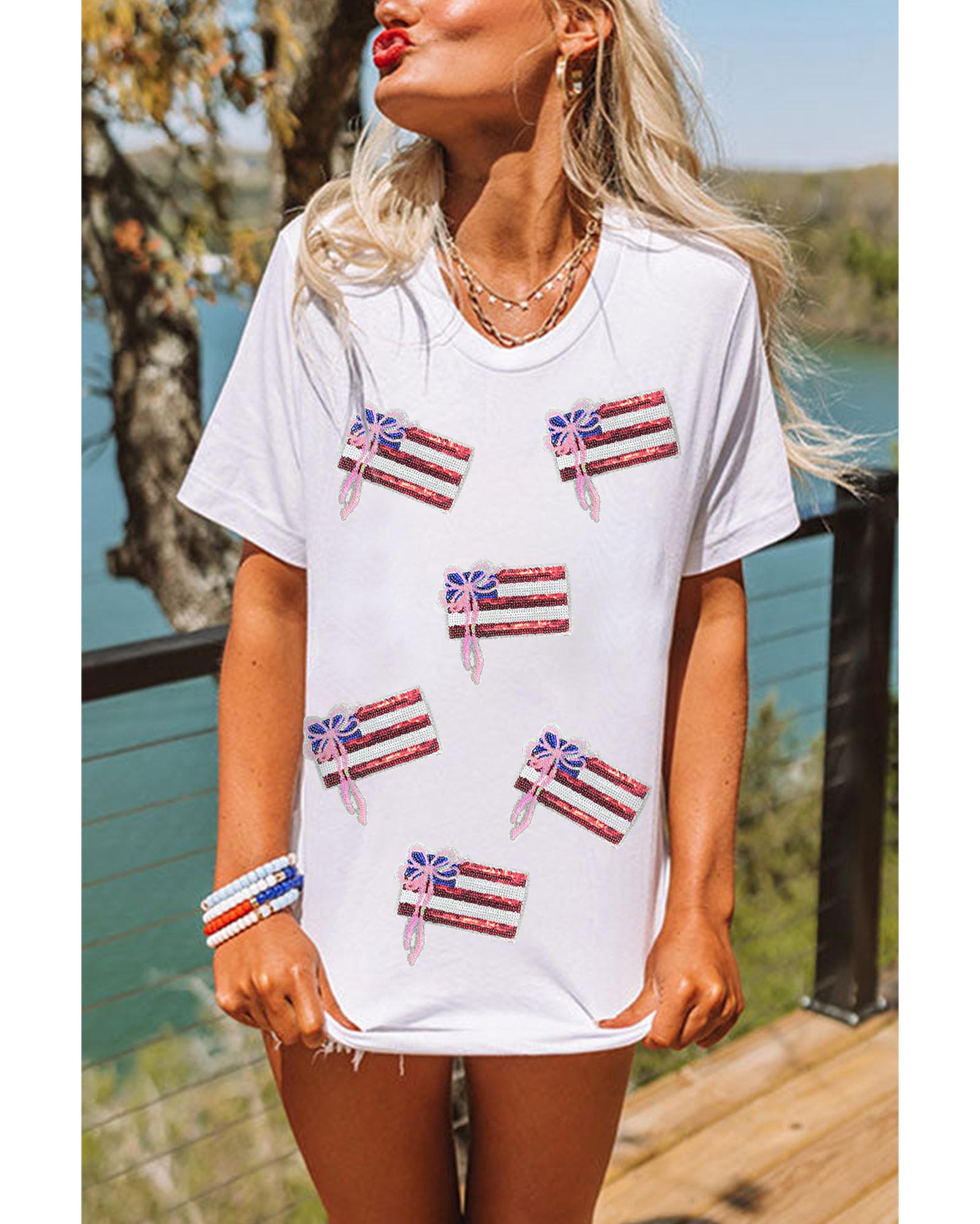 White Sequin Bow American Flag Patched T Shirt – 3XL