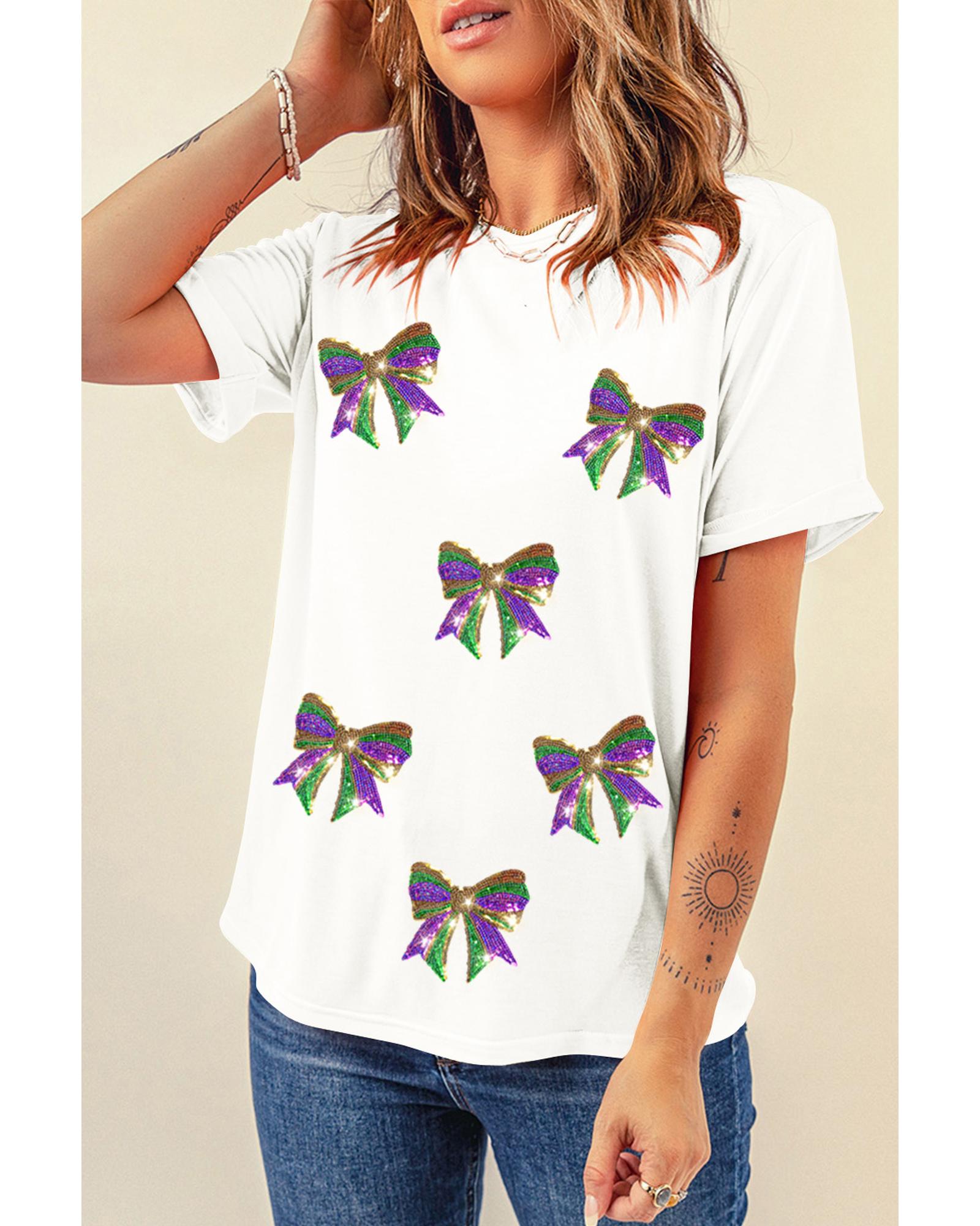 White Sequin Mardi Gras Bow Graphic Crewneck Tee – 2XL