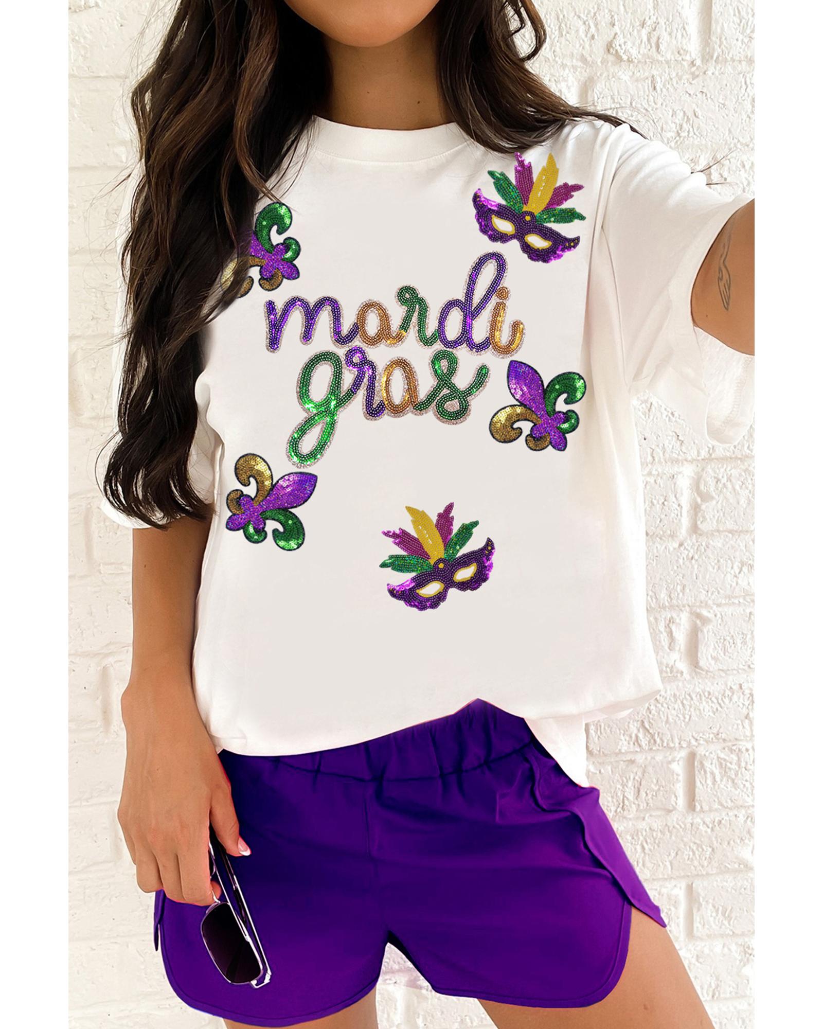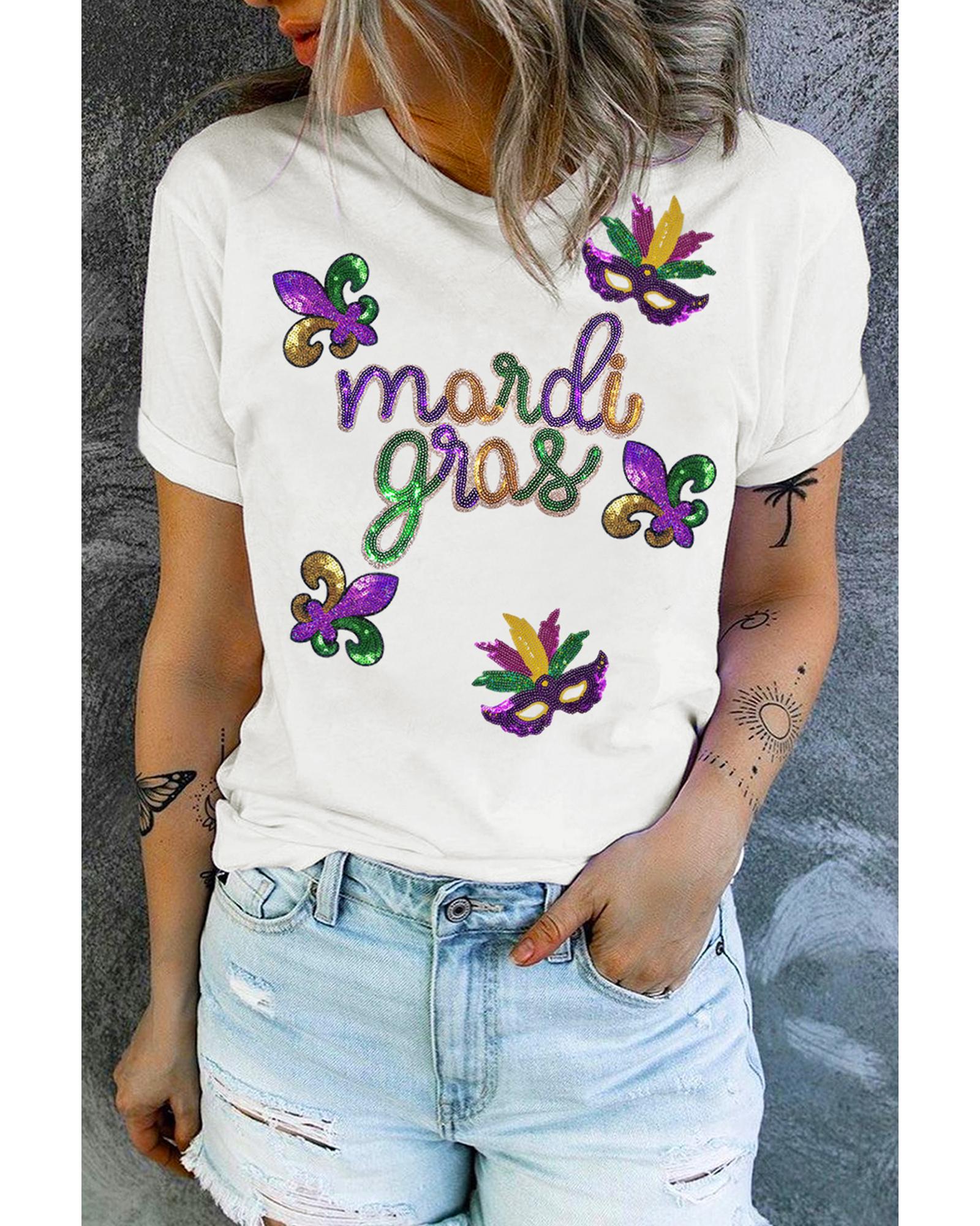- White Sequin Mardi Gras Pattern Graphic Crew Neck Tee