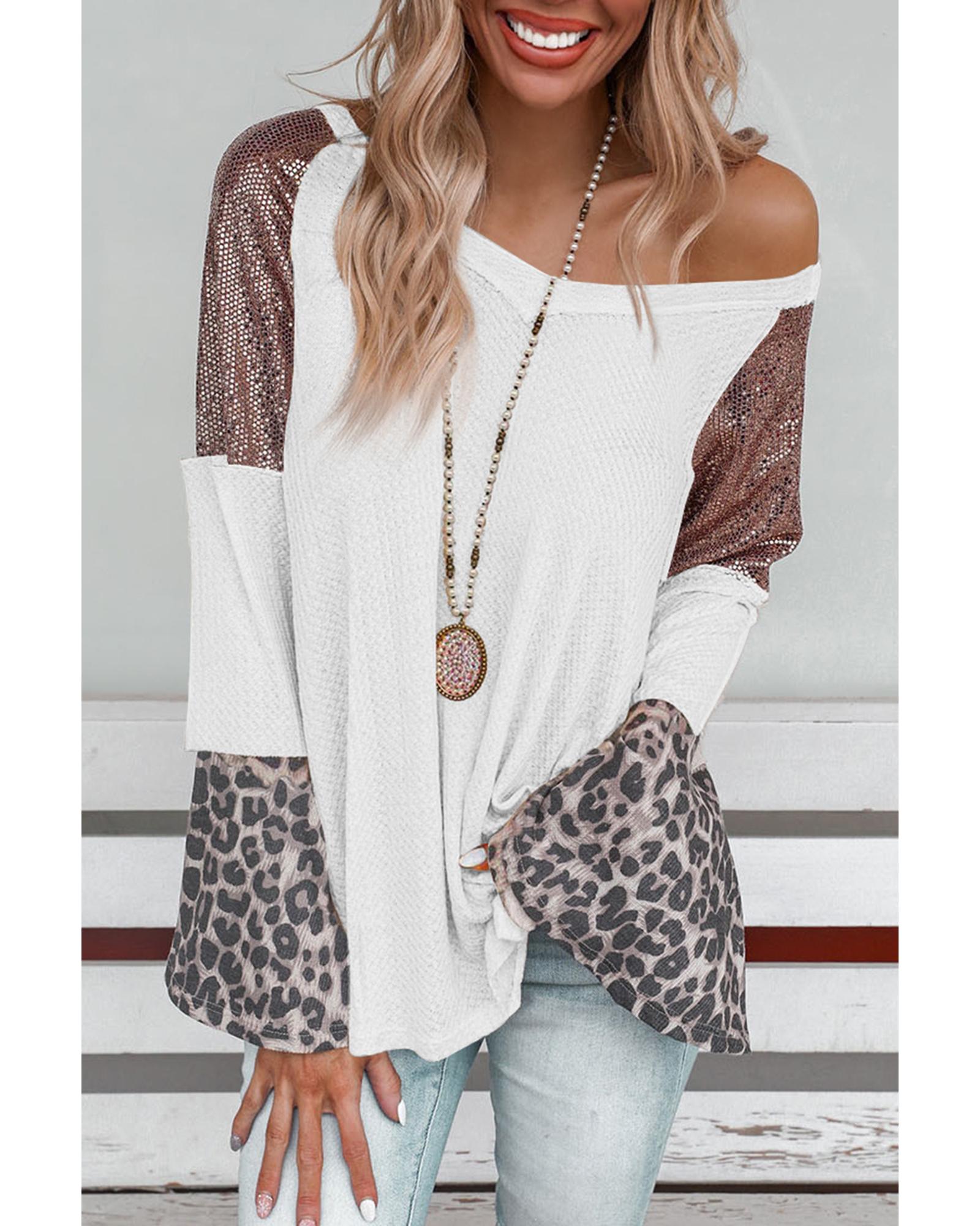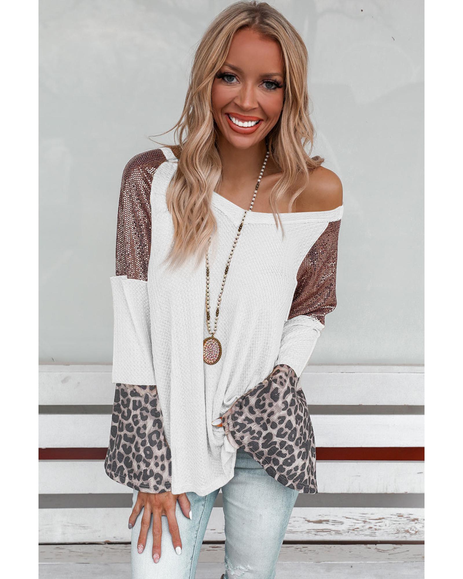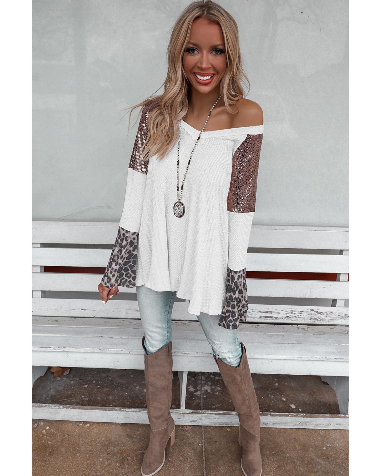 • White Sequin Patchwork Bell Sleeve V Neck Tunic Top