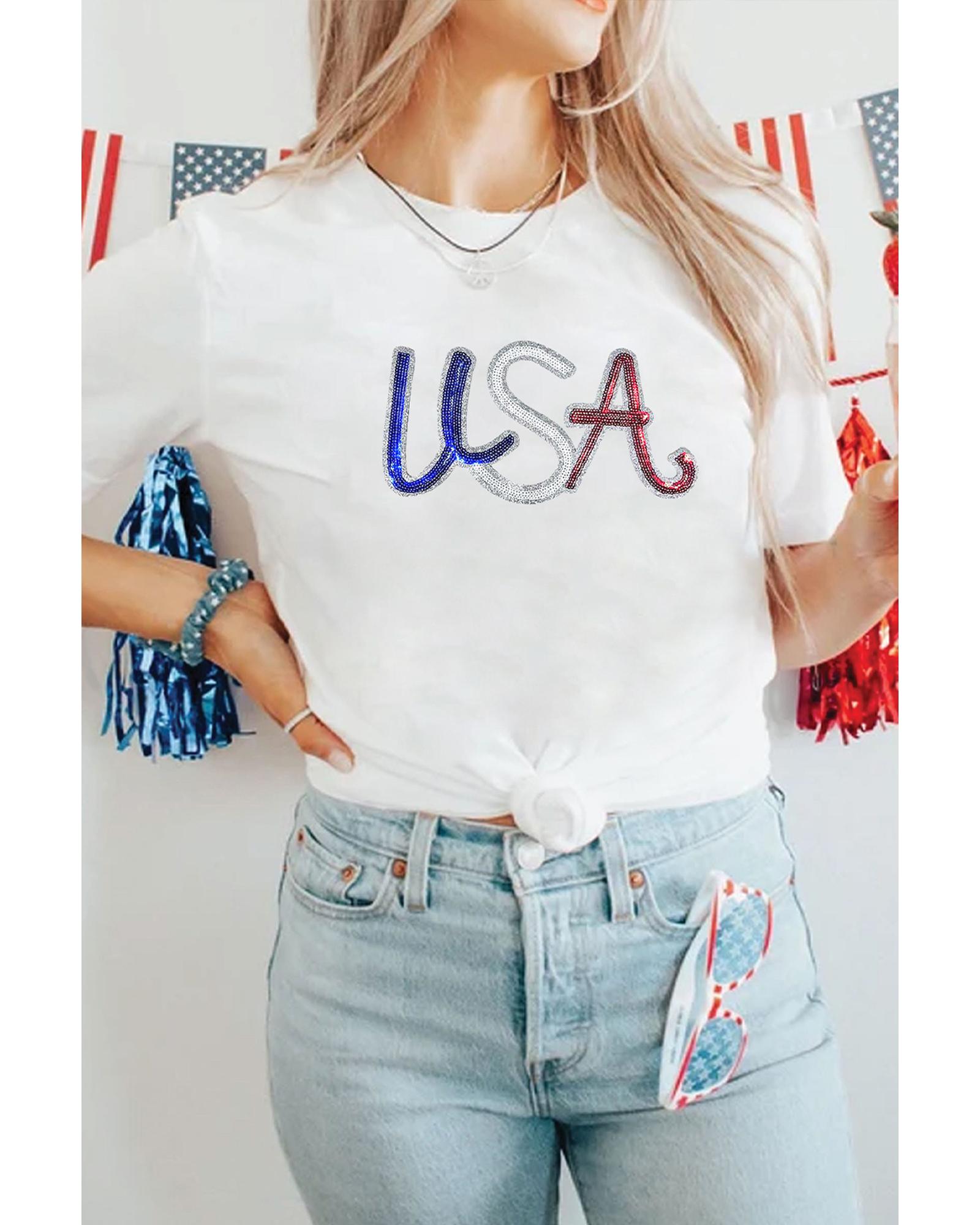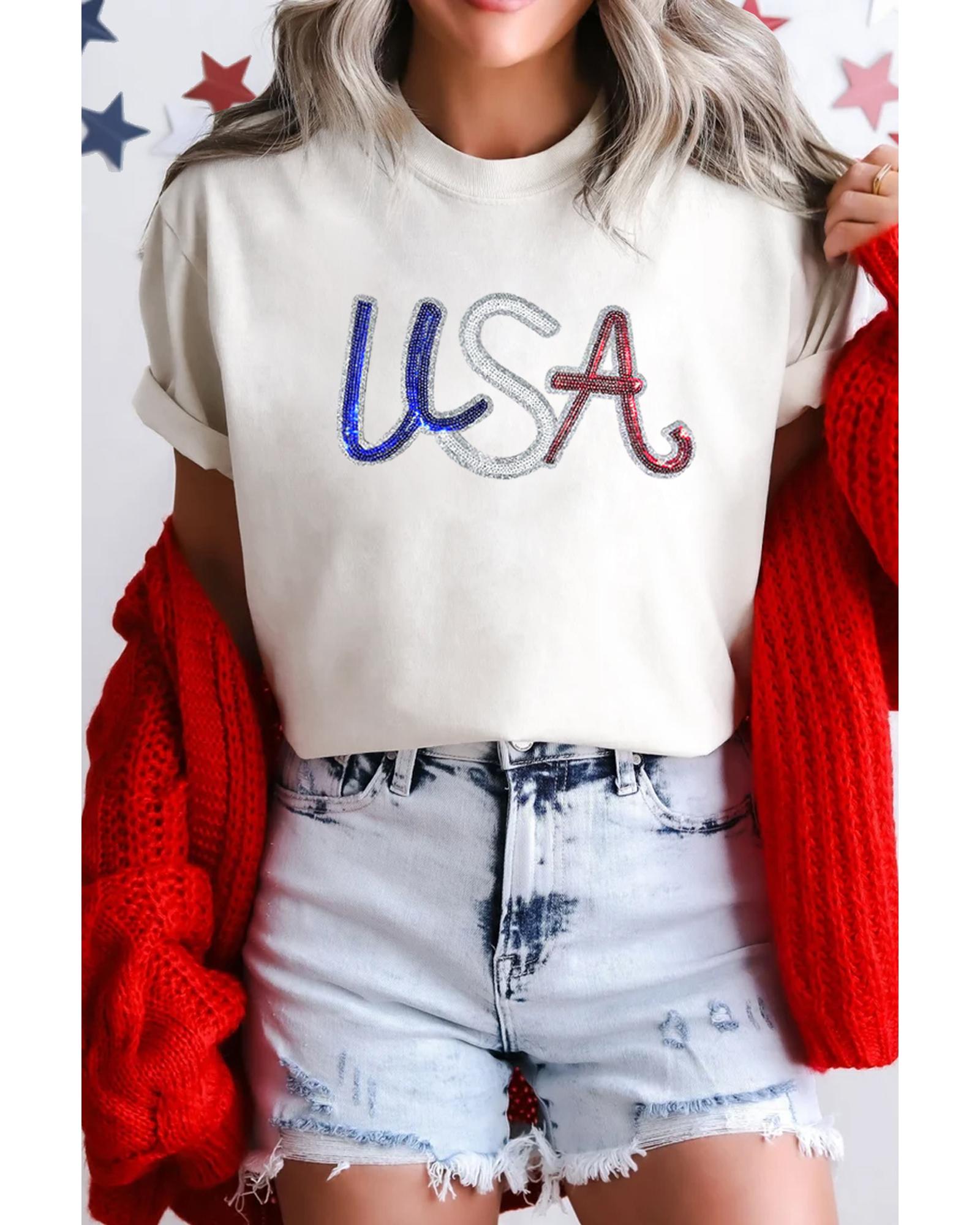 White Sequin USA Graphic Crew Neck Patriotic Tee – 2XL