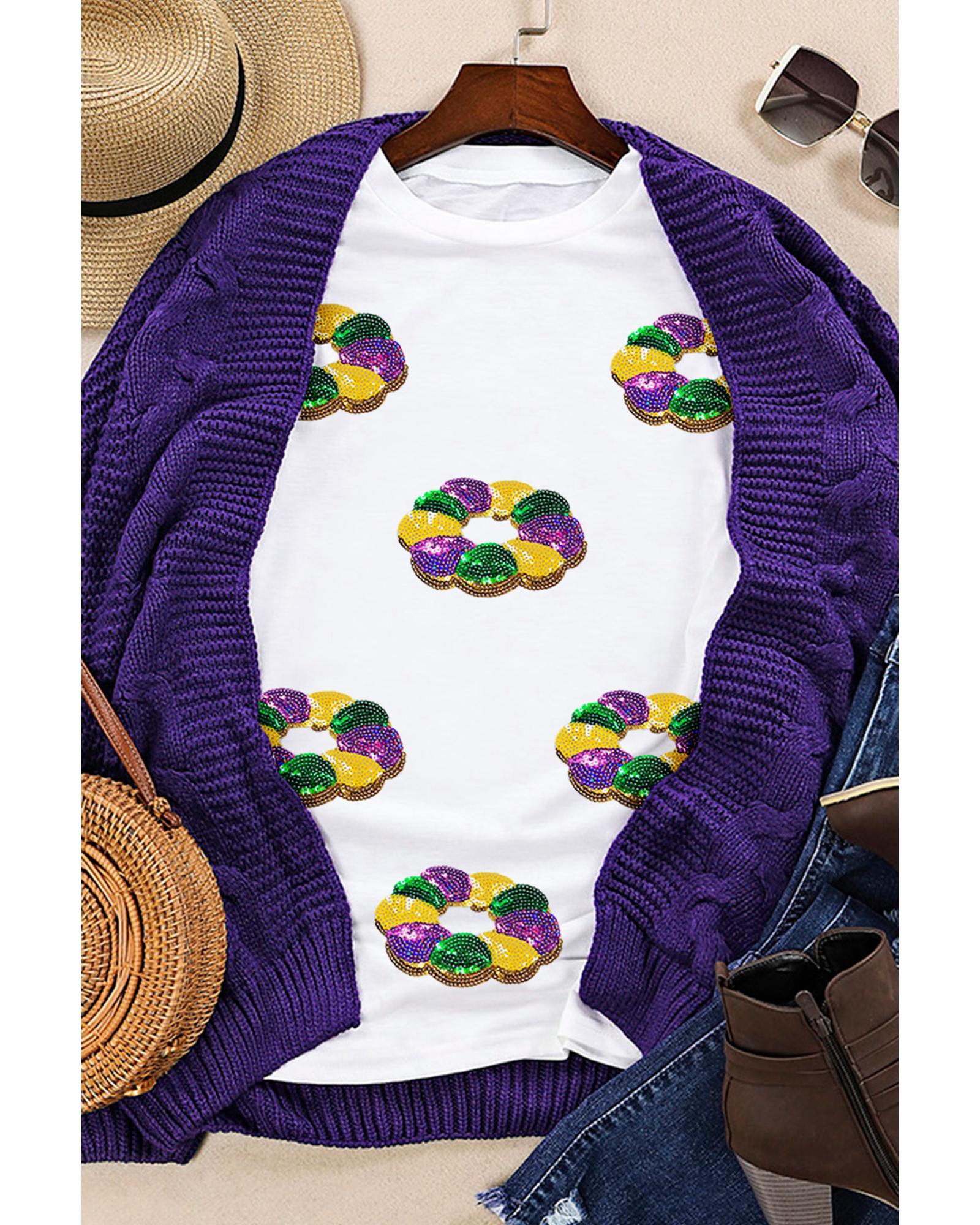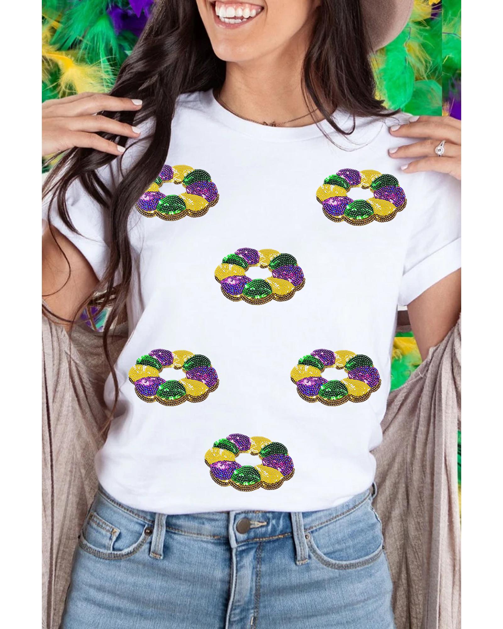 White Sequined Mardi Gras Pattern Crew Neck Short Sleeve Top – 3XL