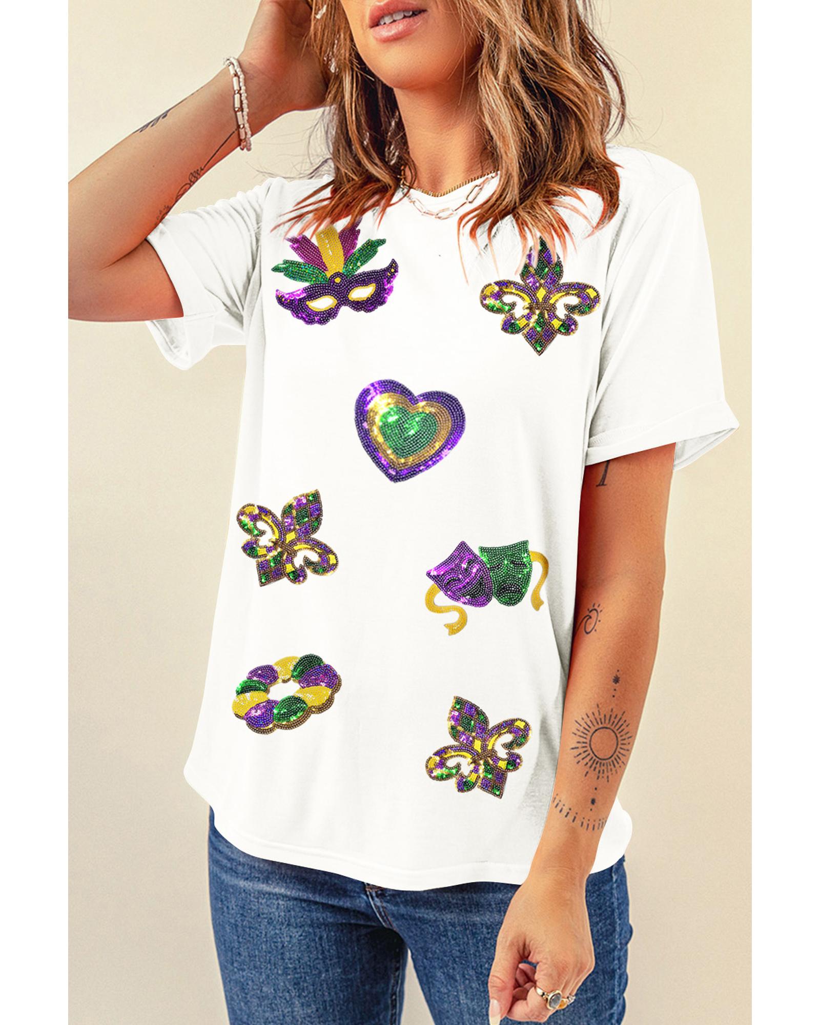 • White Sequined Mardi Gras Symbolic Pattern Casual Tee