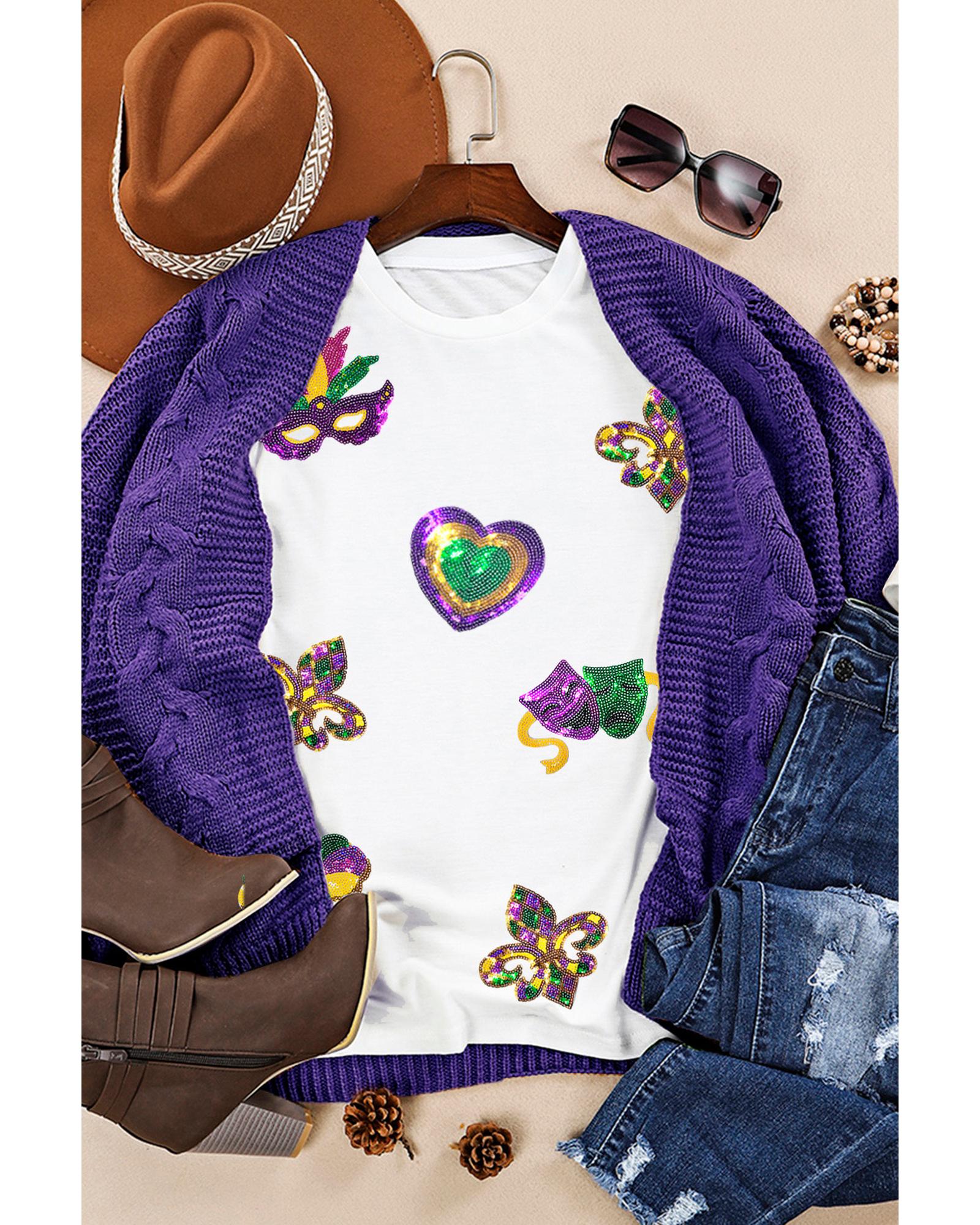 • White Sequined Mardi Gras Symbolic Pattern Casual Tee