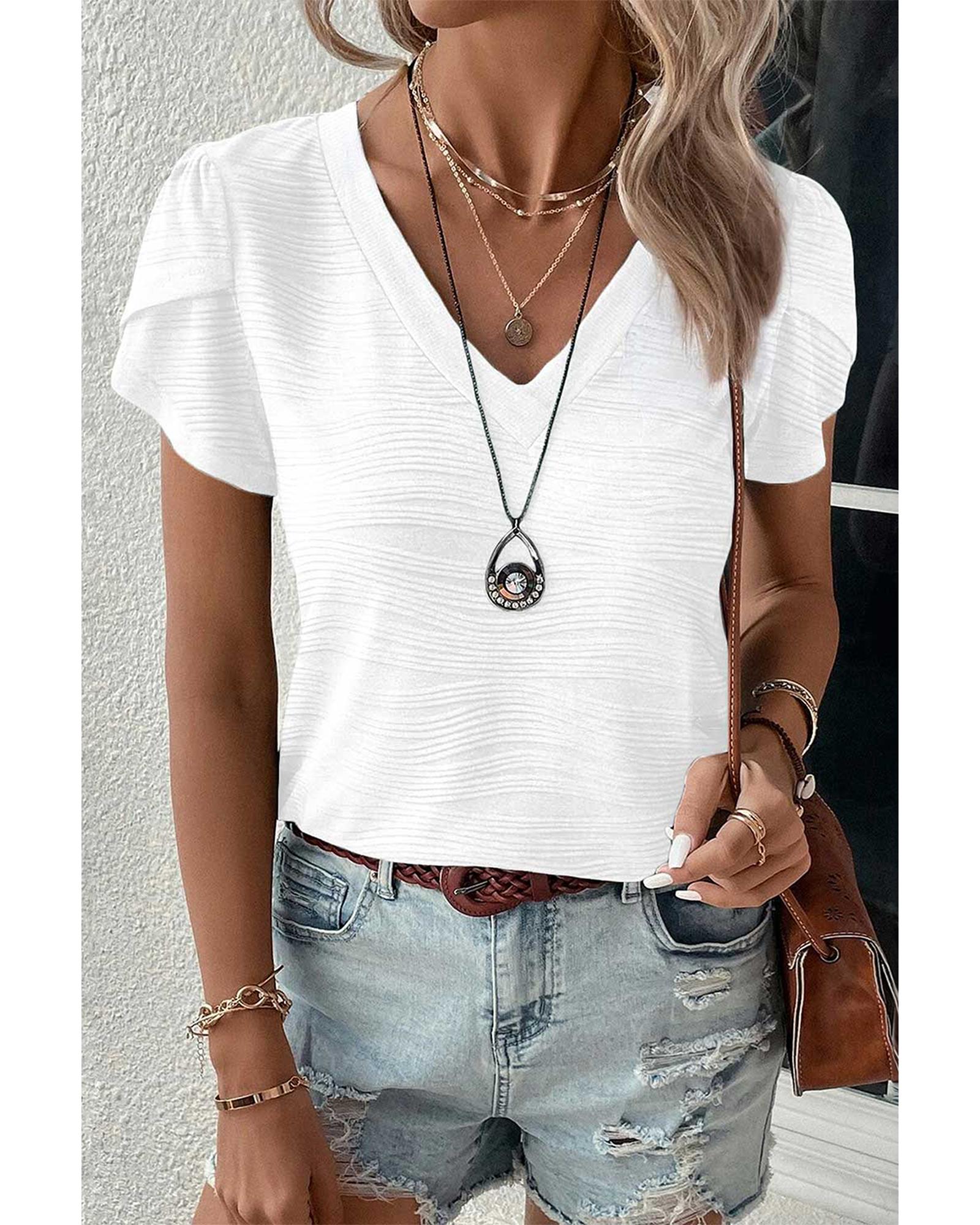 White Solid Color Textured V Neck Short Sleeve Top – S