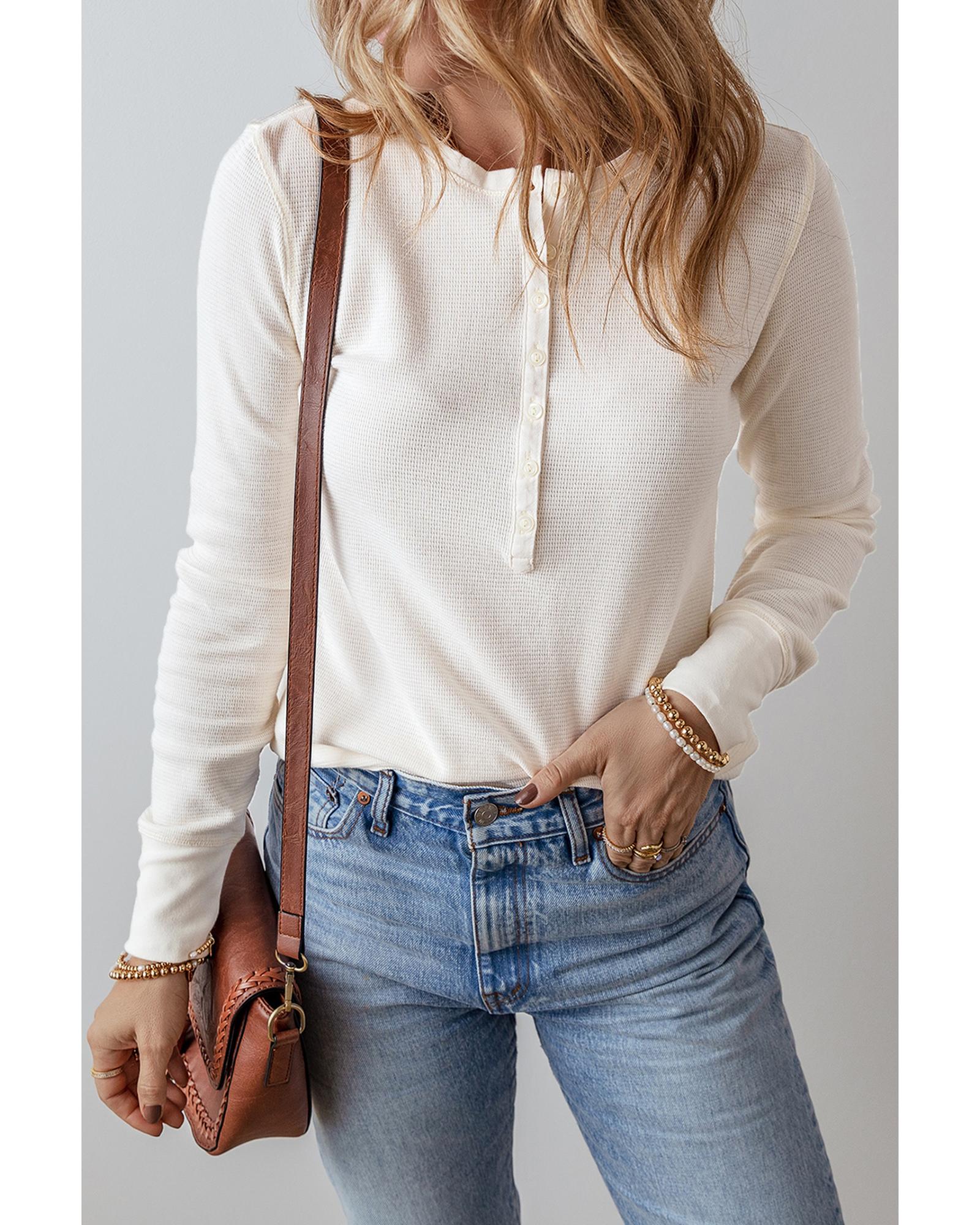 White Solid Color Waffle Half Button Long Sleeve Top – L