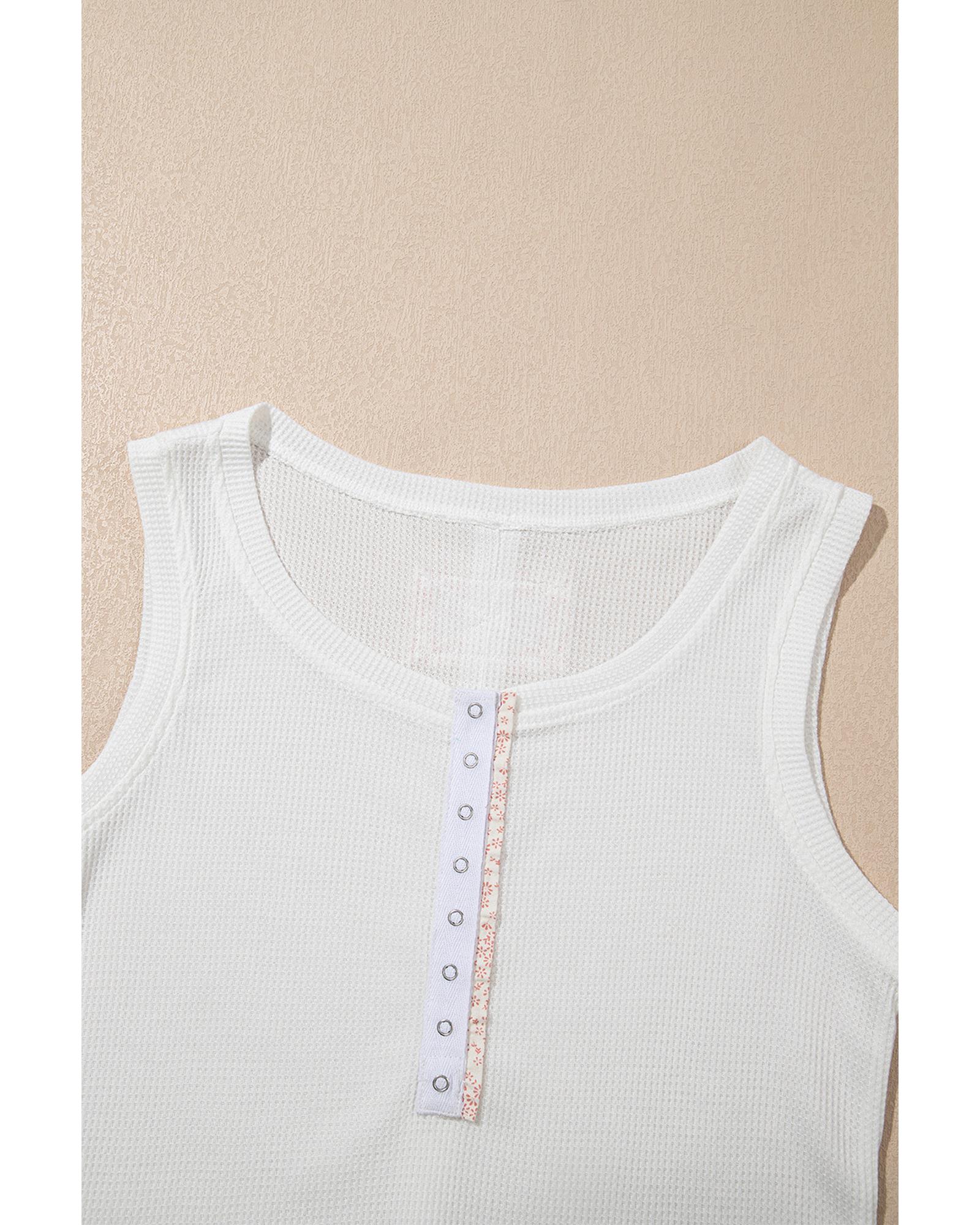 White Solid Color Waffle Knit Half Buttons Tank Top – L