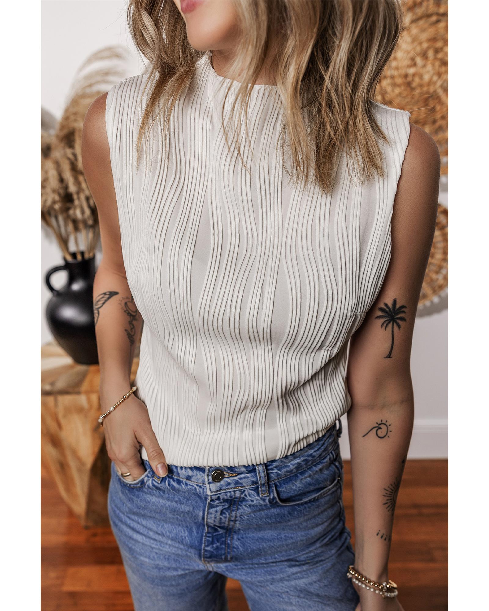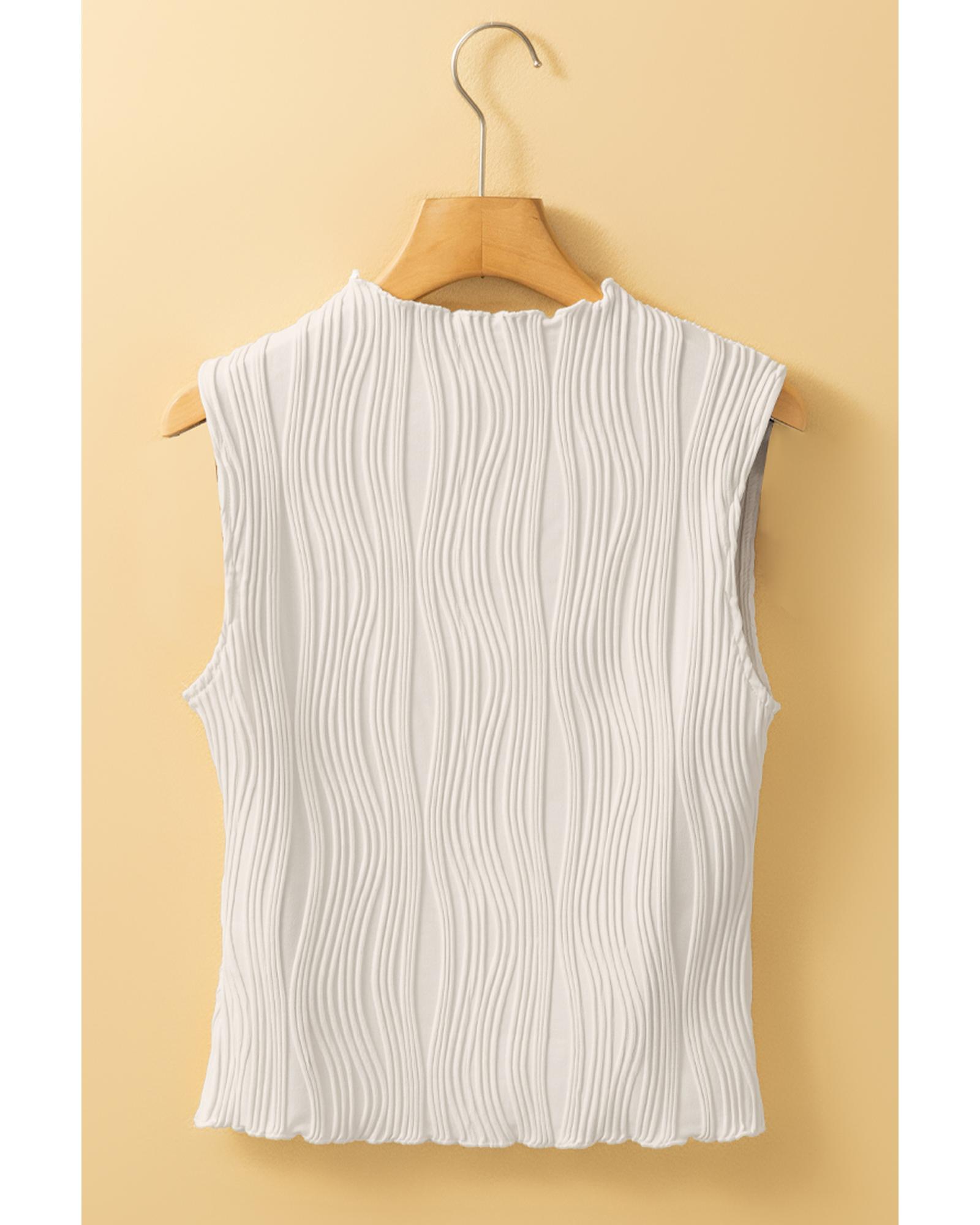 White Solid Color Wavy Textured Round Neck Tank Top – S