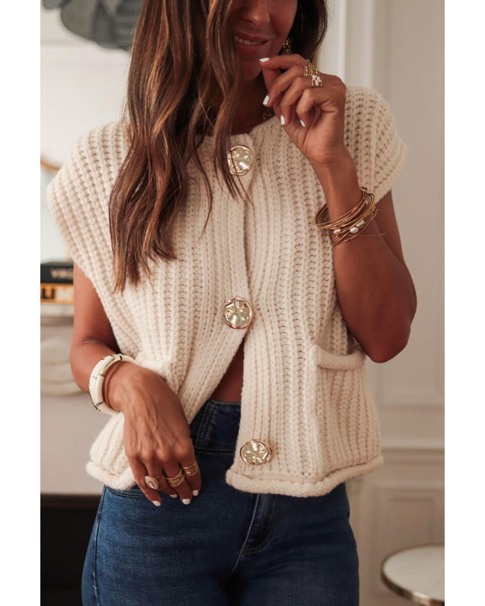 White Solid Textured Knit Side Pockets Buttoned Sweater Vest – S