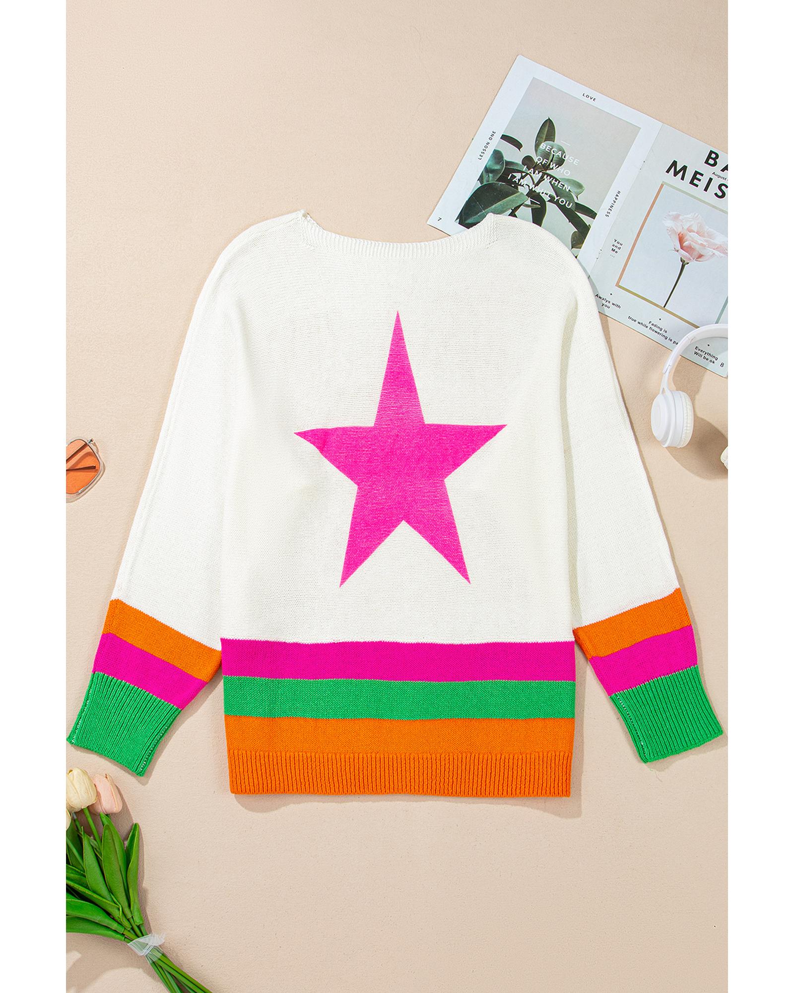White Star Pattern Colorblock Striped Edge Drop Shoulder Sweater – S