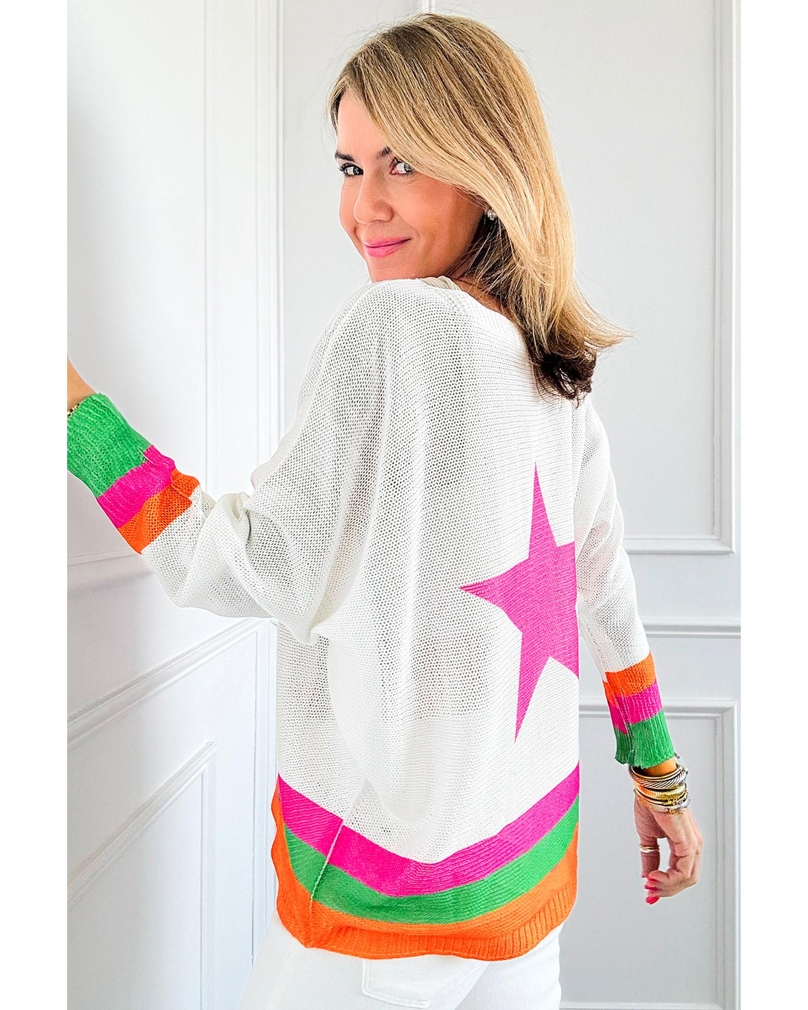 White Star Pattern Colorblock Striped Edge Drop Shoulder Sweater – XL