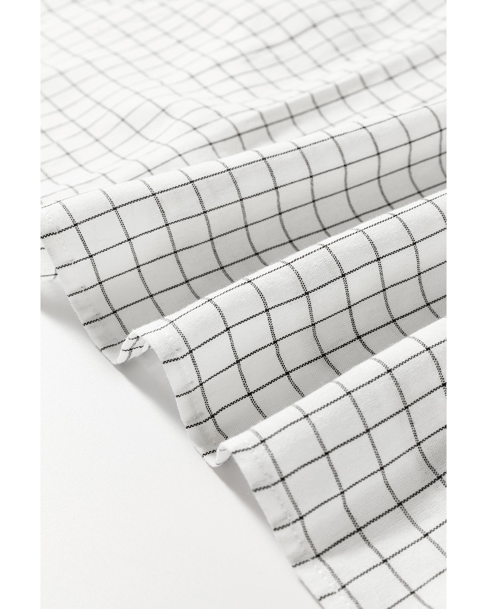 White Stripe Checkered Frilled V Neck Bracelet Sleeve Babydoll Dress - M