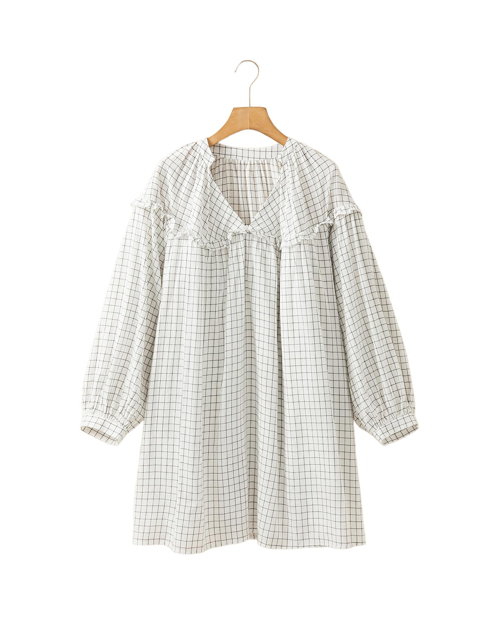White Stripe Checkered Frilled V Neck Bracelet Sleeve Babydoll Dress – L