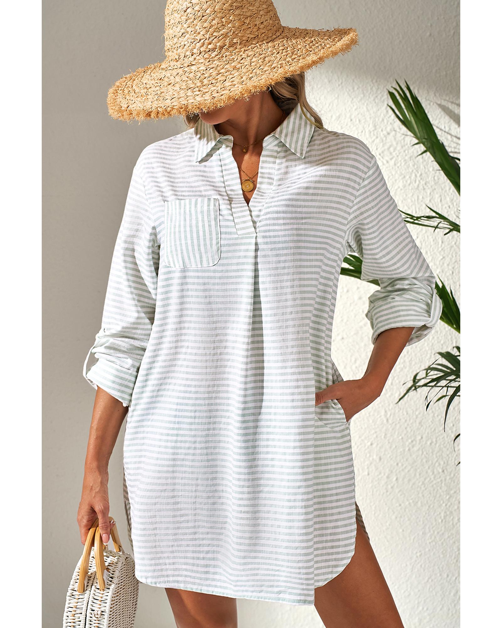 White Stripe Collared V Neck Chest Pocket Long Sleeve Beach Cover up – L
