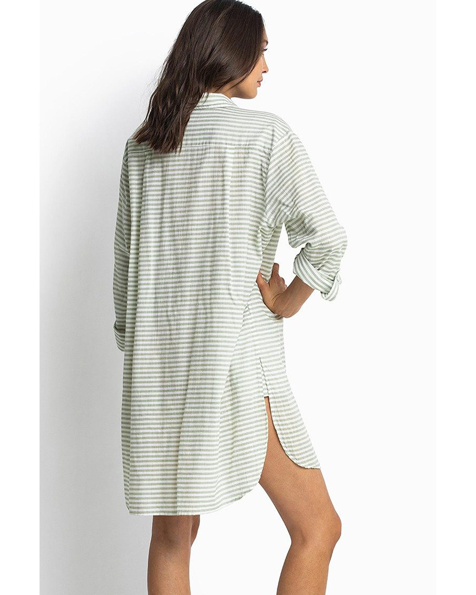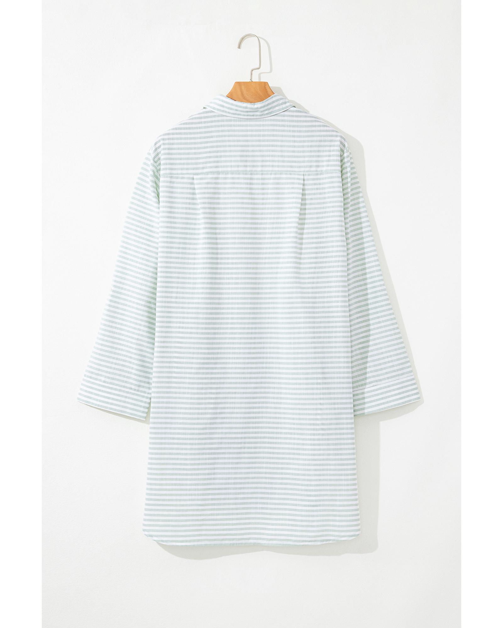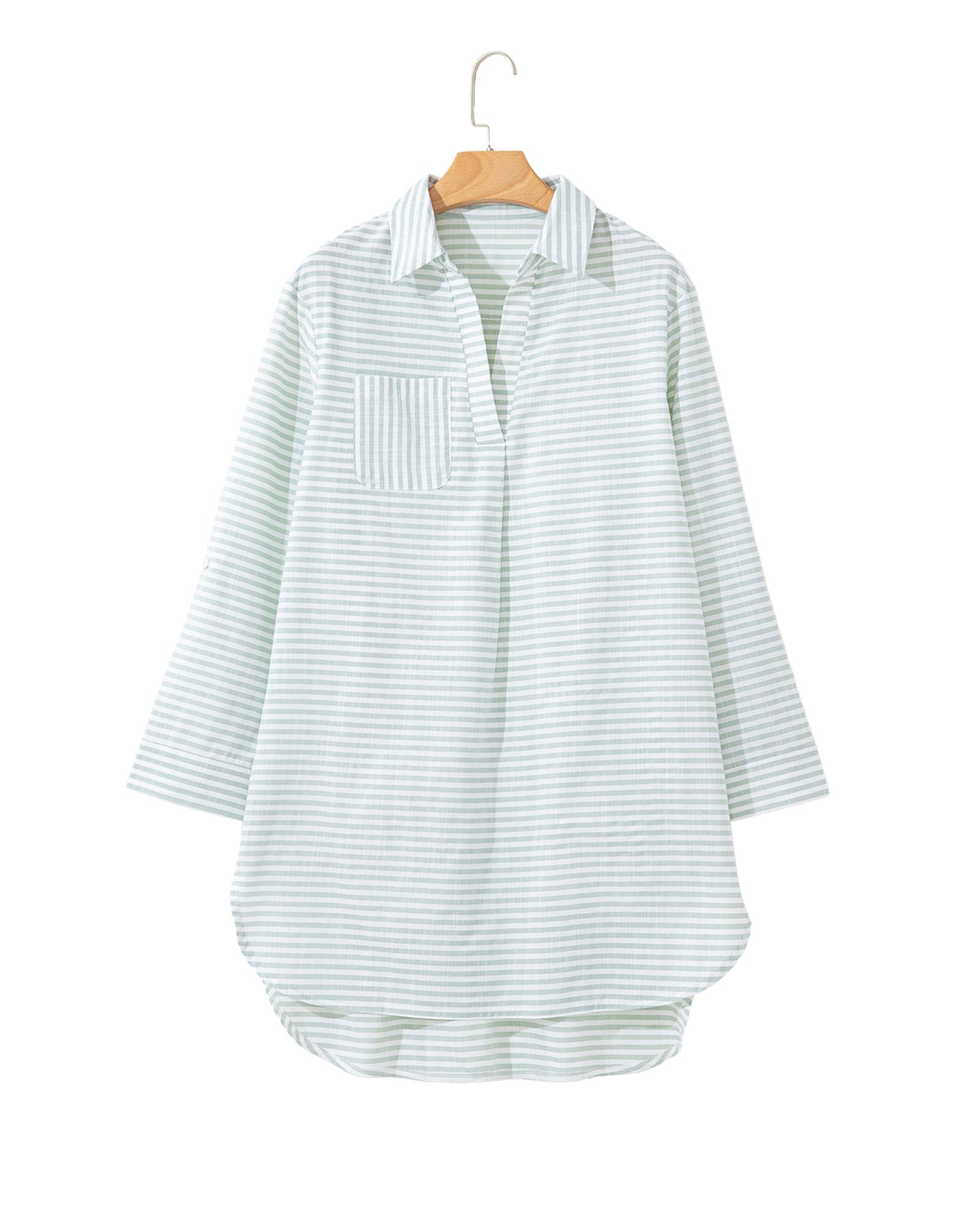 White Stripe Collared V Neck Chest Pocket Long Sleeve Beach Cover up – S