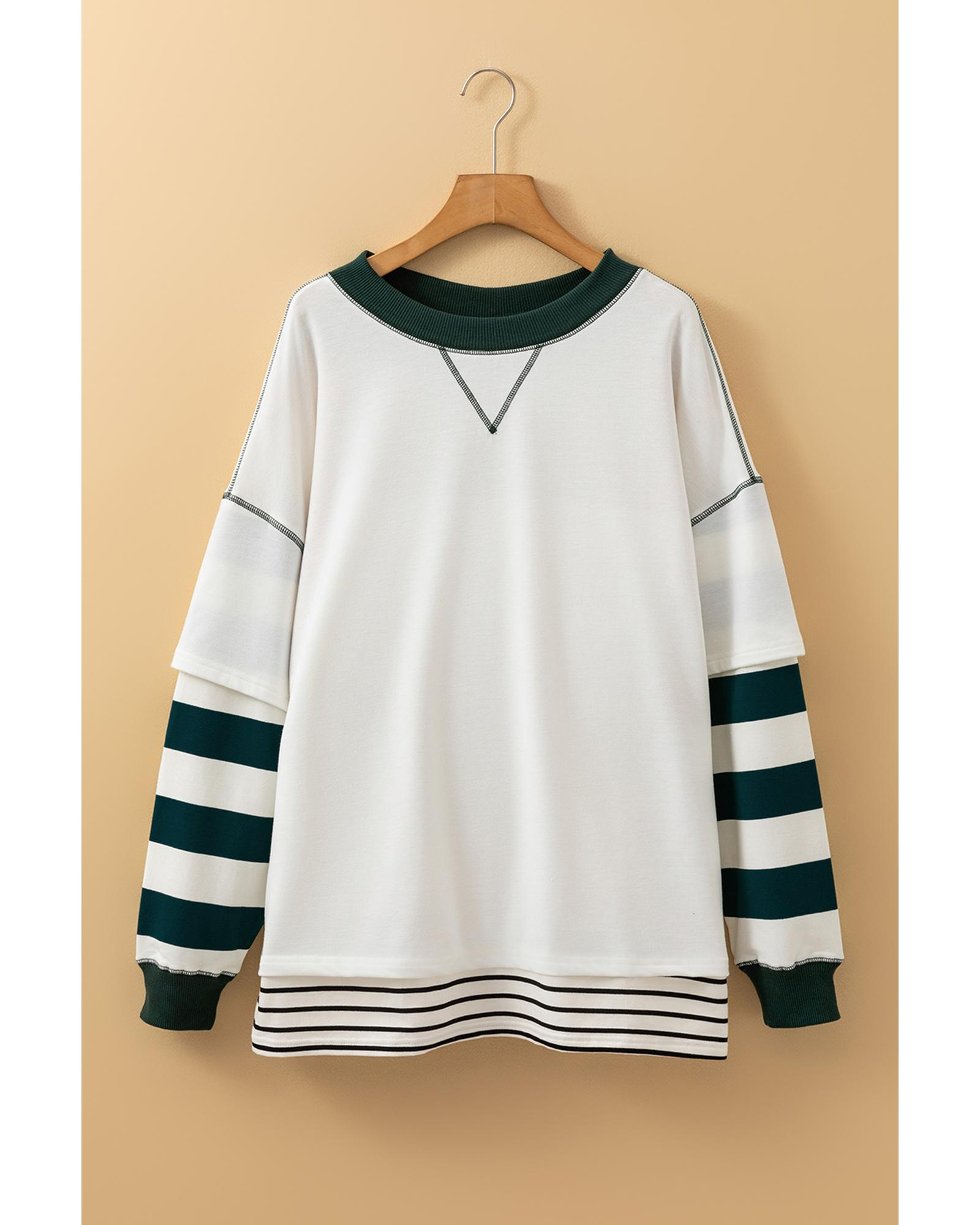 White Stripe Colorblock Sleeve Exposed Seam Fake-2-Piece Sweatshirt – L