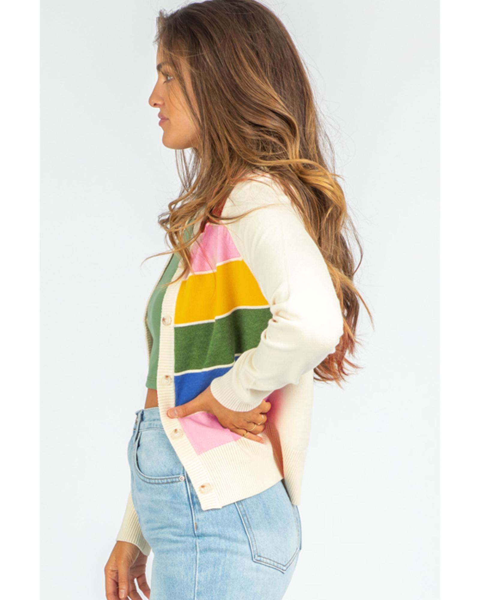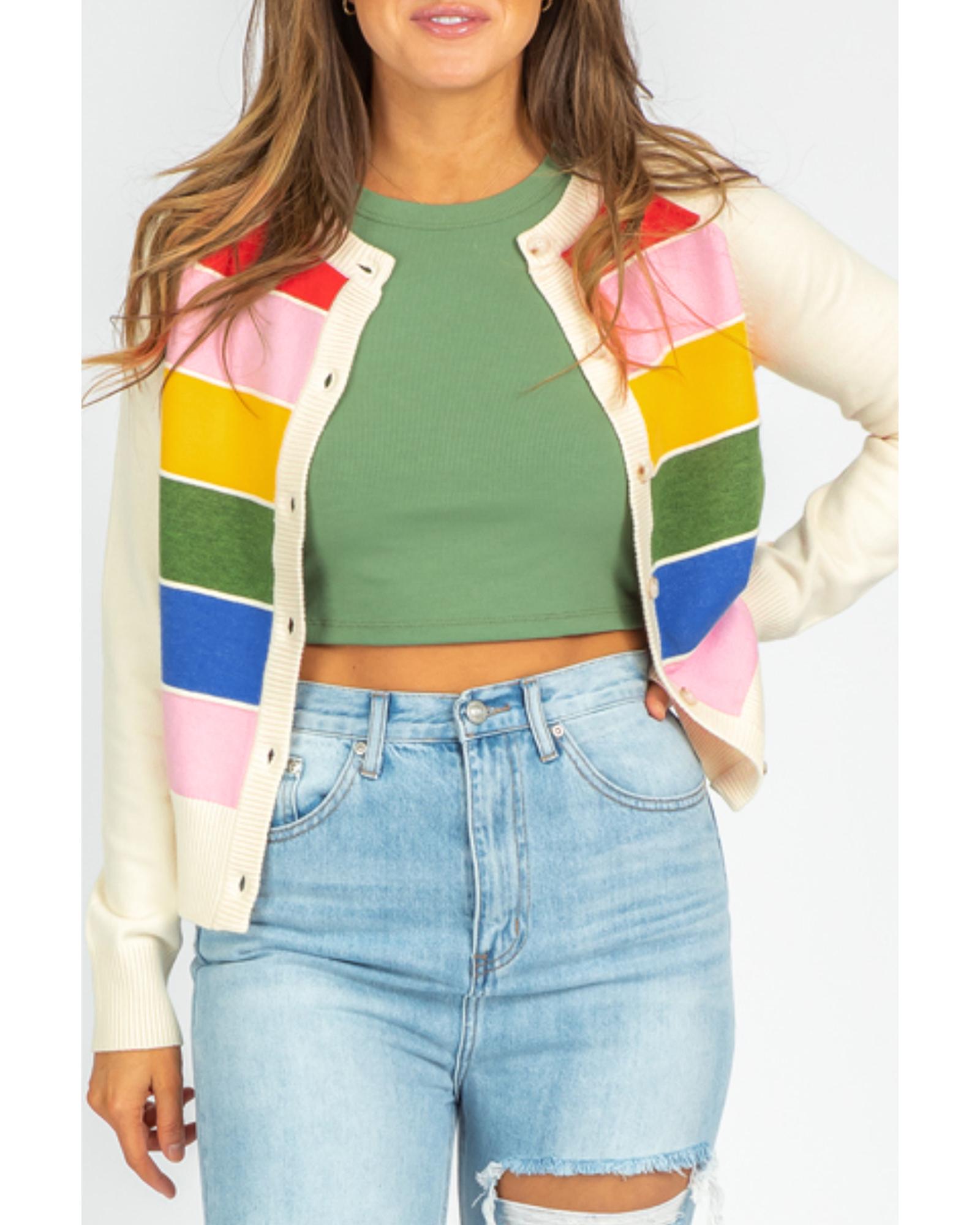 White Stripe Colorful Pattern Button Front Sweater Cardigan – S