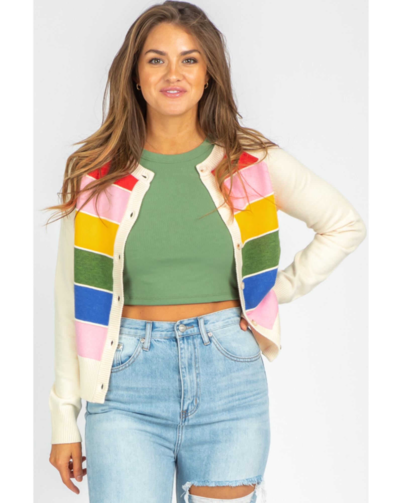 White Stripe Colorful Pattern Button Front Sweater Cardigan – XL