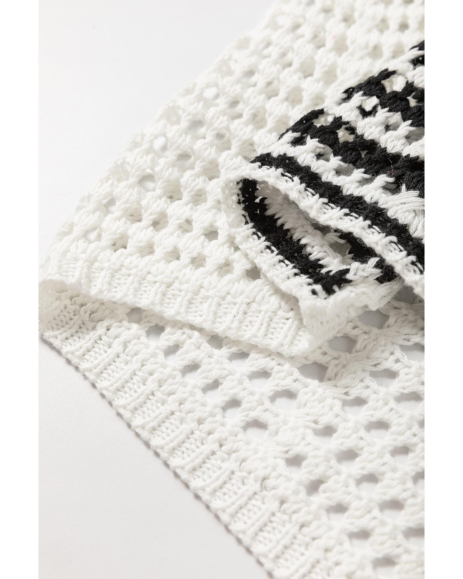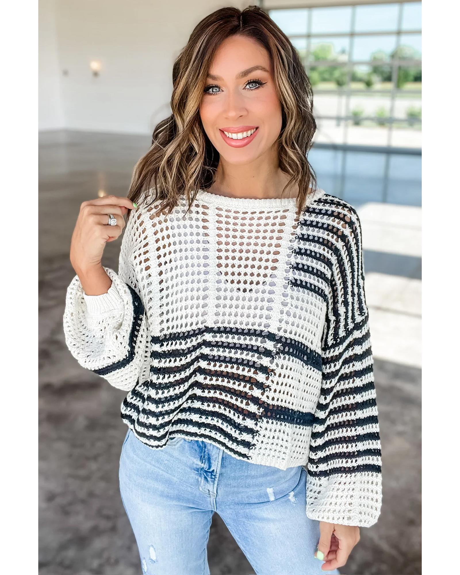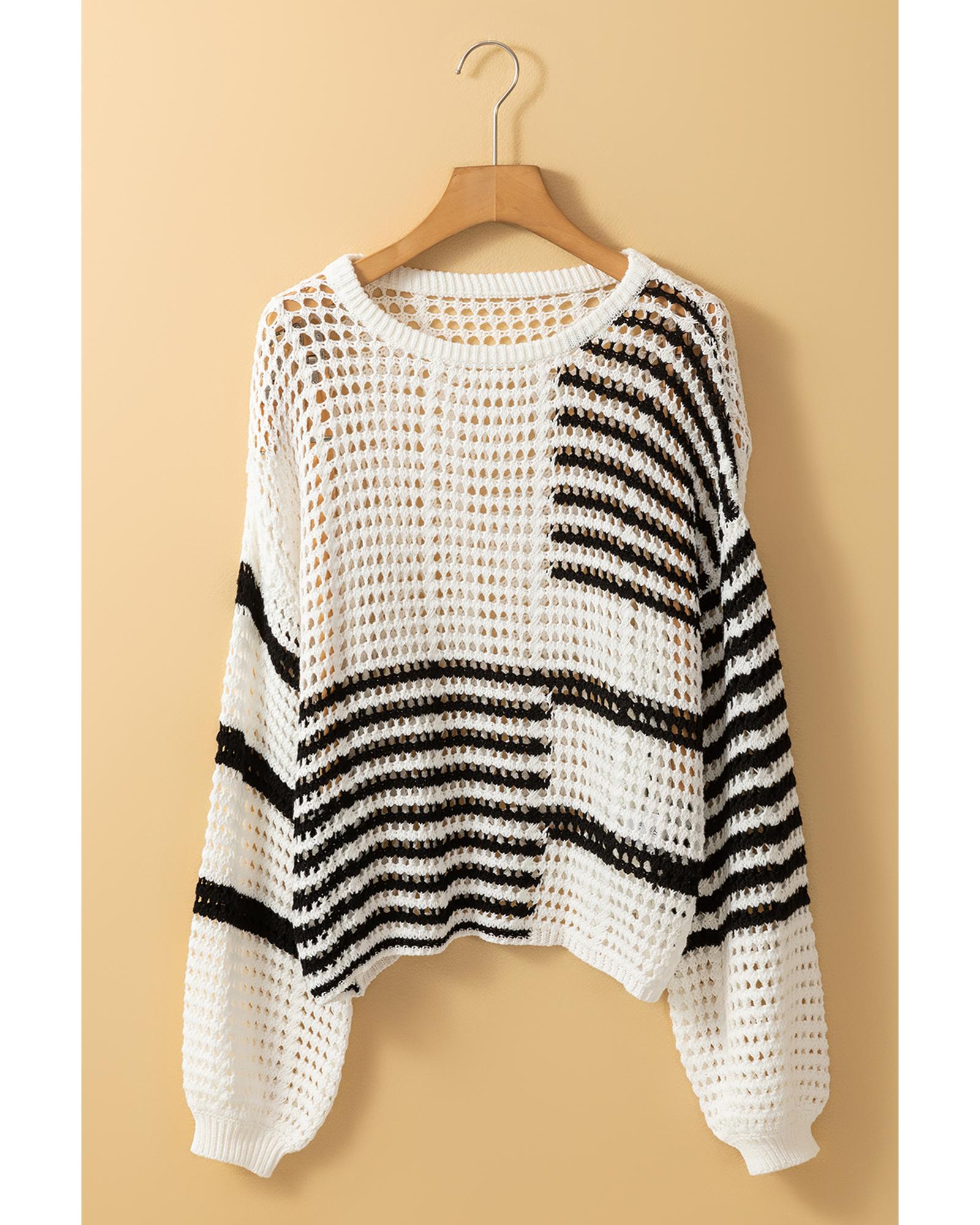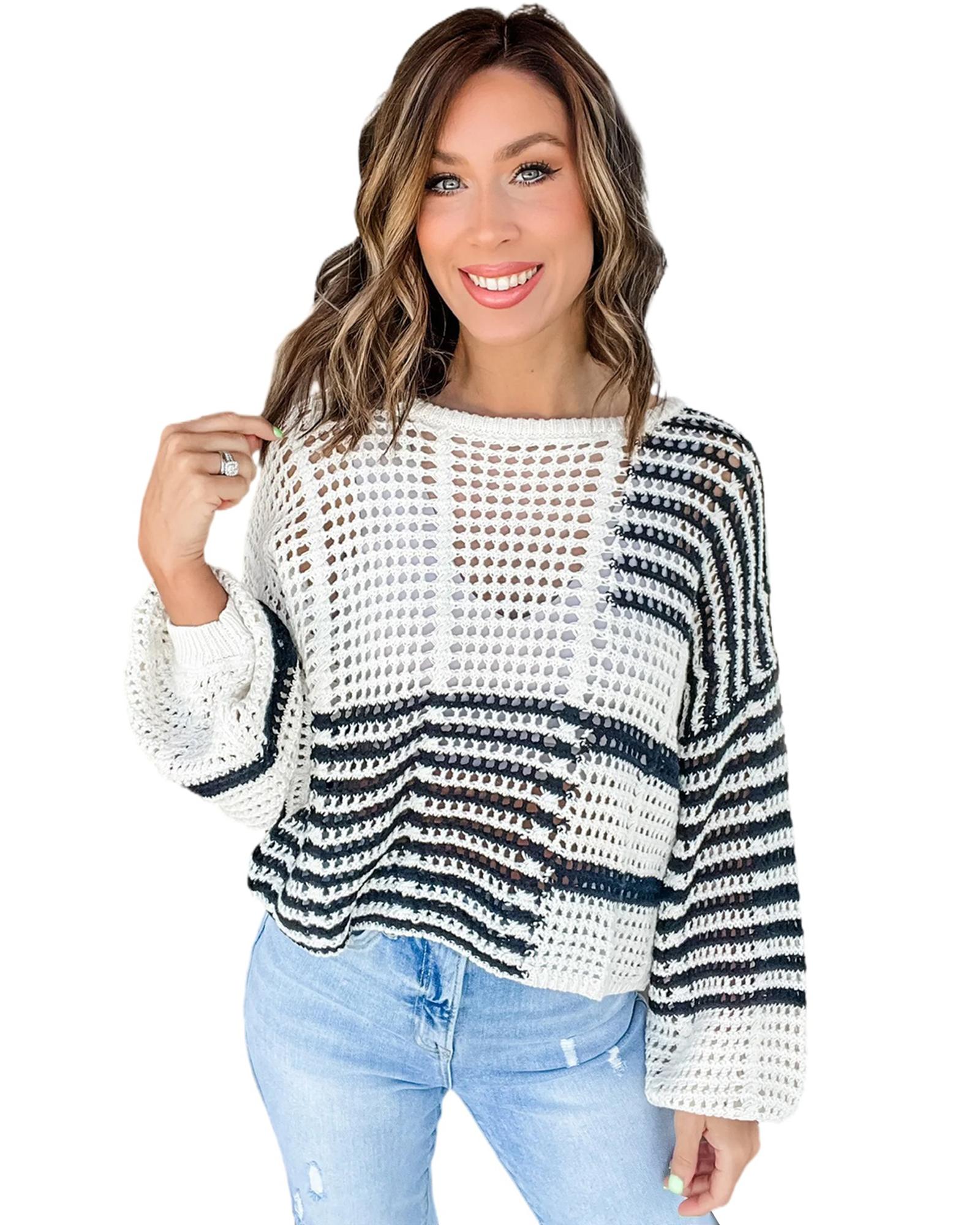 White Stripe Contrast Striped Crochet Puff Sleeve Sweater – L