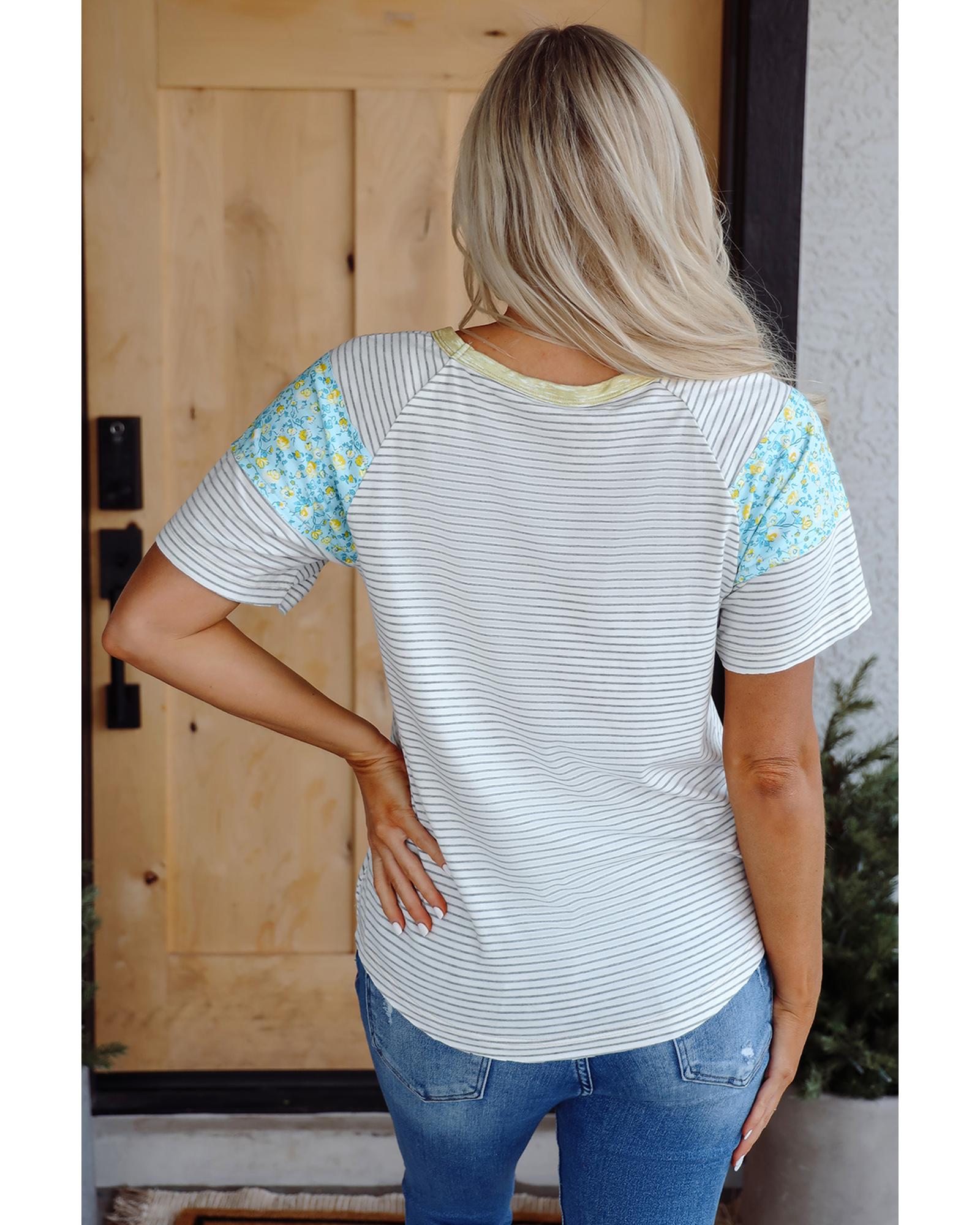 White Stripe Floral Insert Sleeves Contrast Round Neck Tee – XL