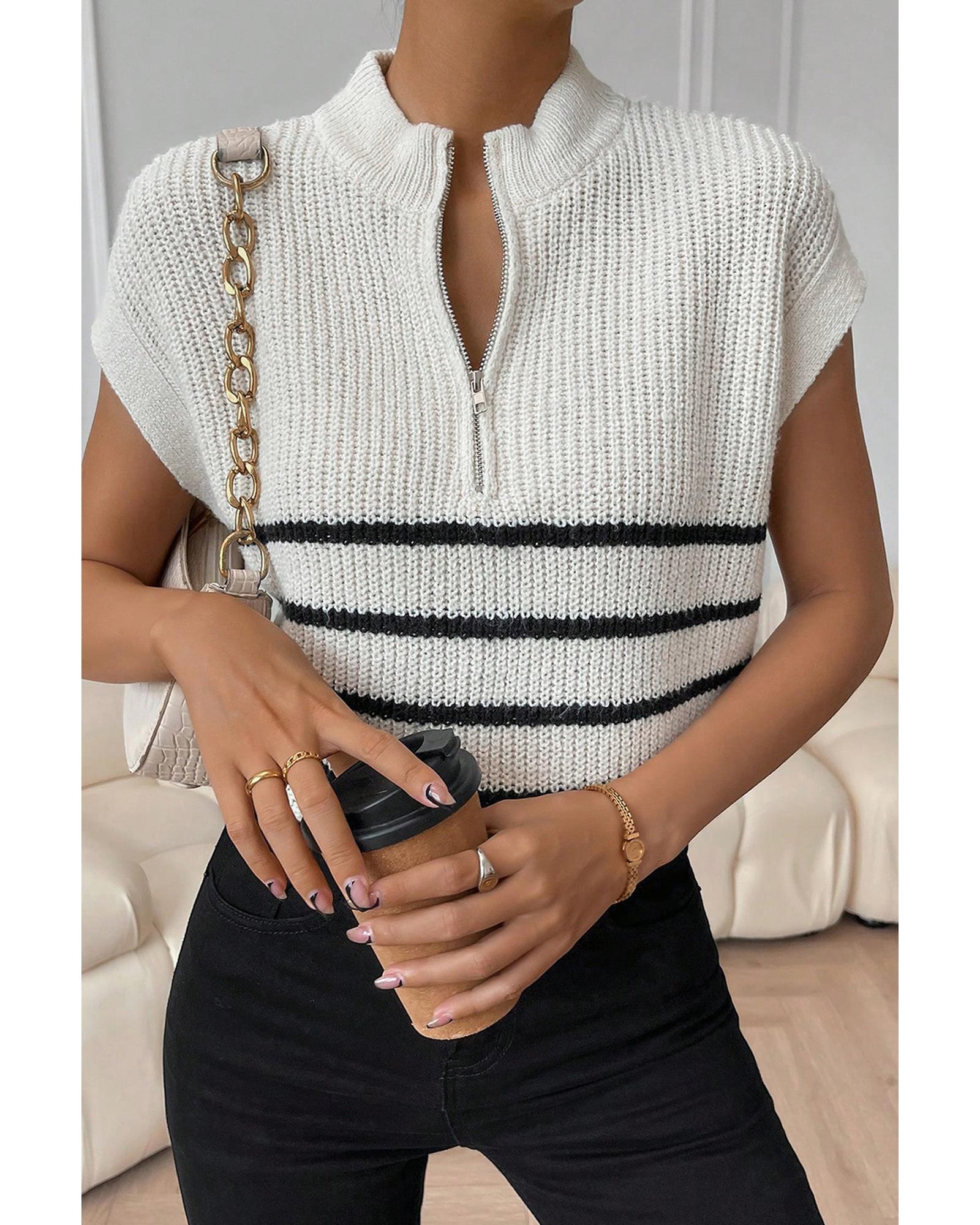 White Stripe Half Zip Split Stand Neck Sweater T-shirt – L