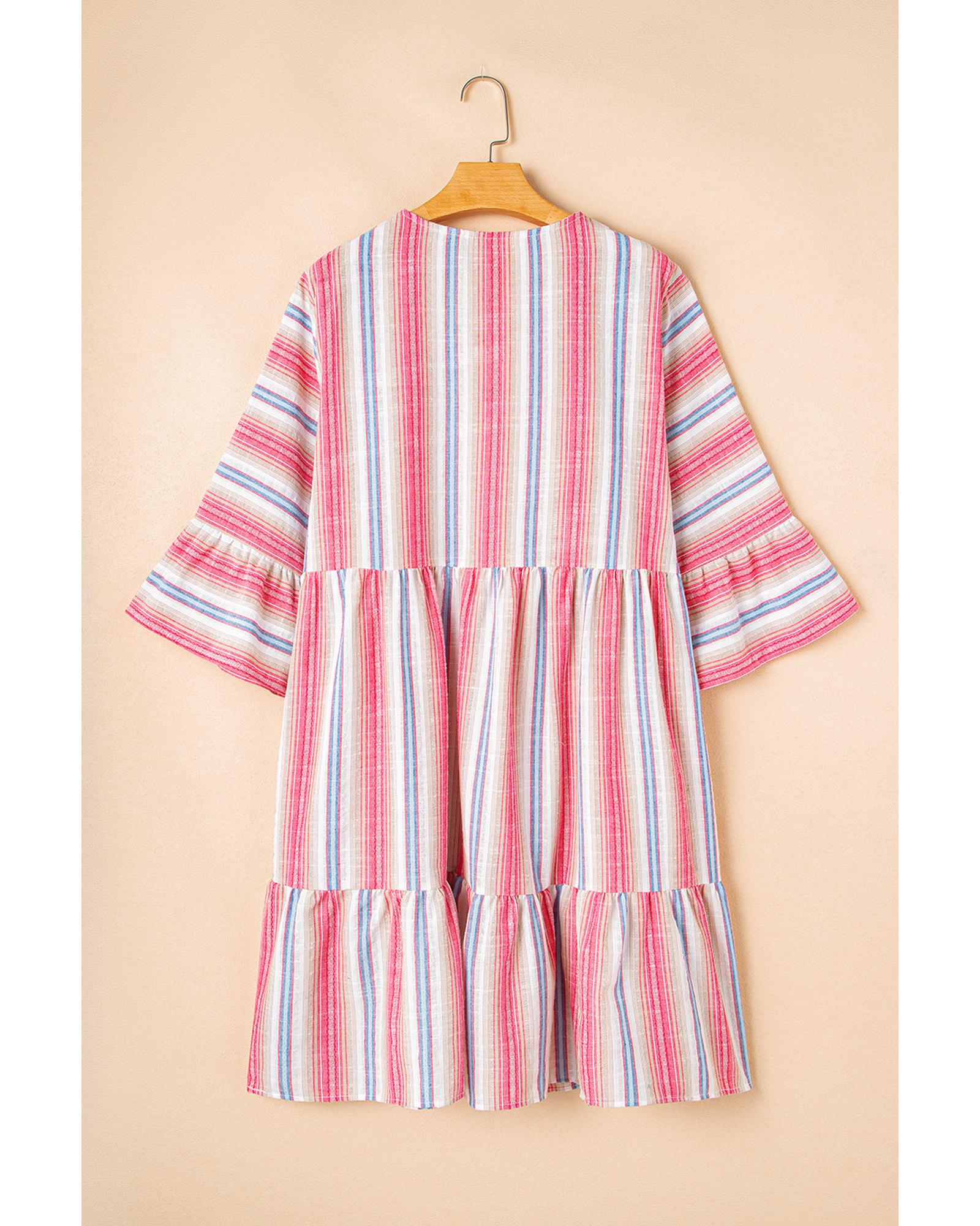 - White Stripe Plus Size Embroidered Detail Flared 3/4 Sleeve V Neck Dress