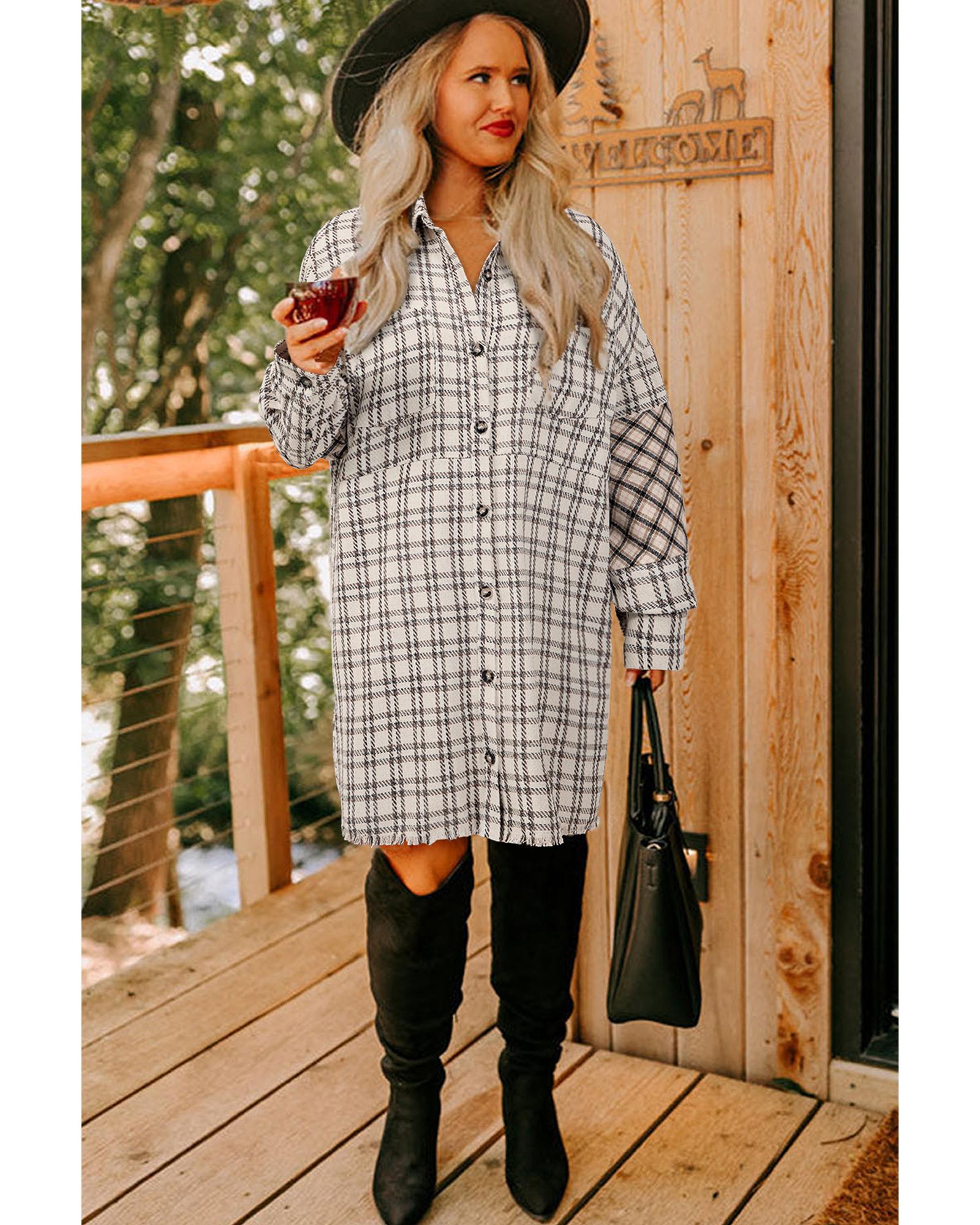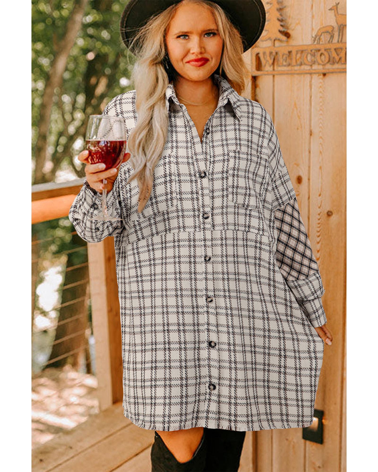 White Stripe Plus Size Plaid Buttoned Raw Hem Tunic Shirt Dress – 3X