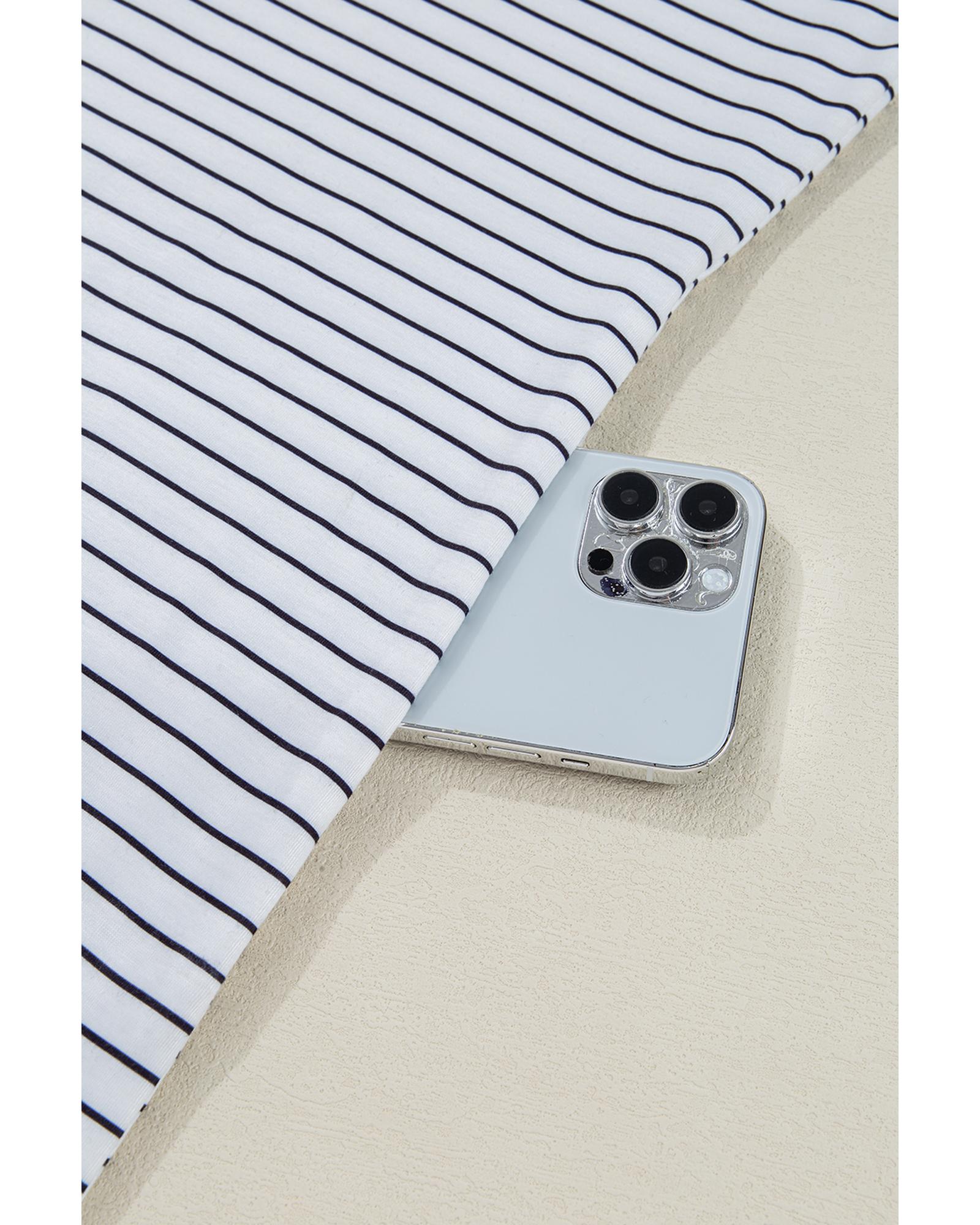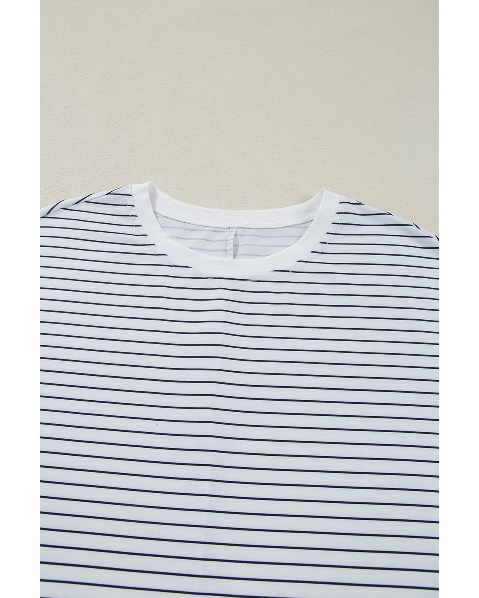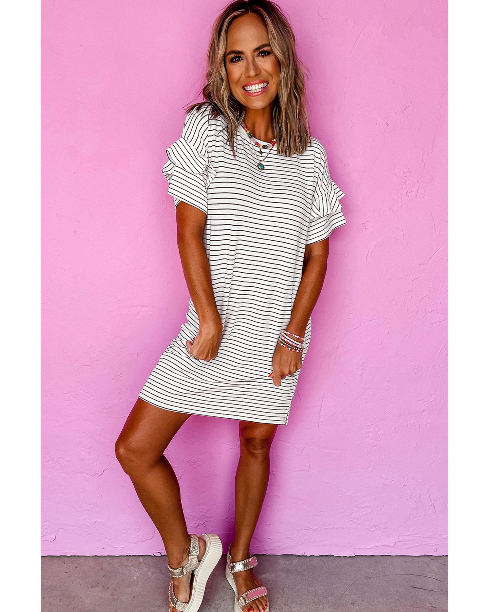 White Stripe Ruffled Short Sleeve Crew Neck T Shirt Shift Mini Dress – L