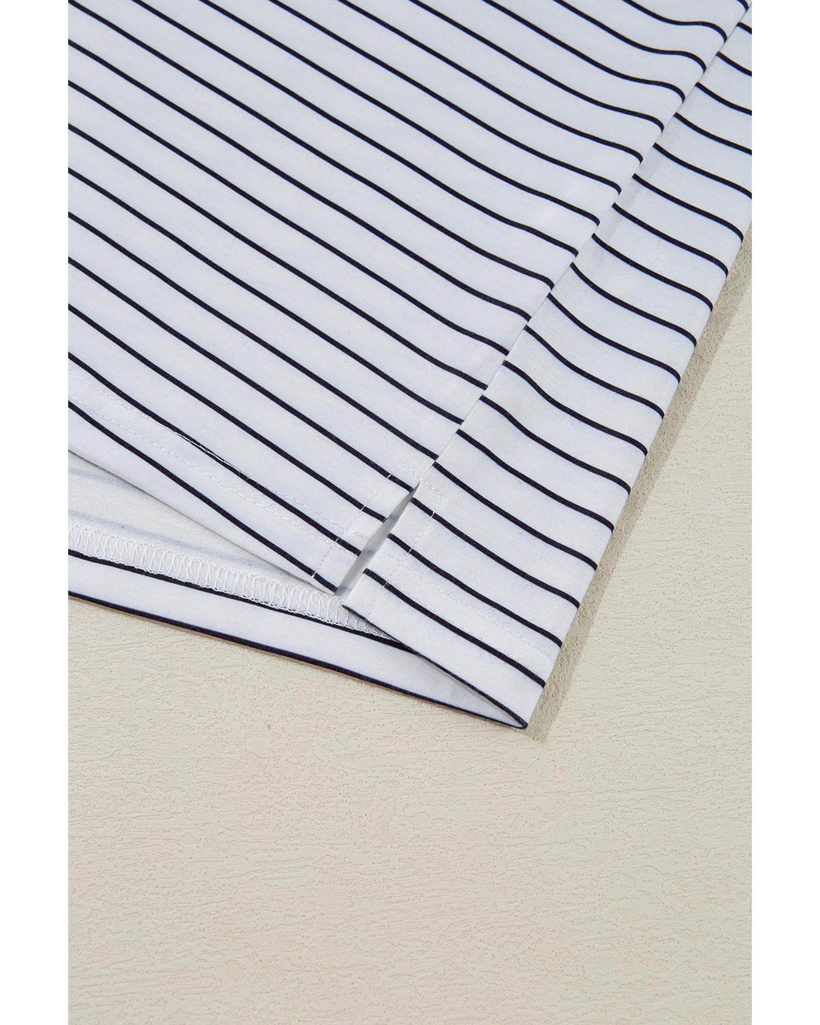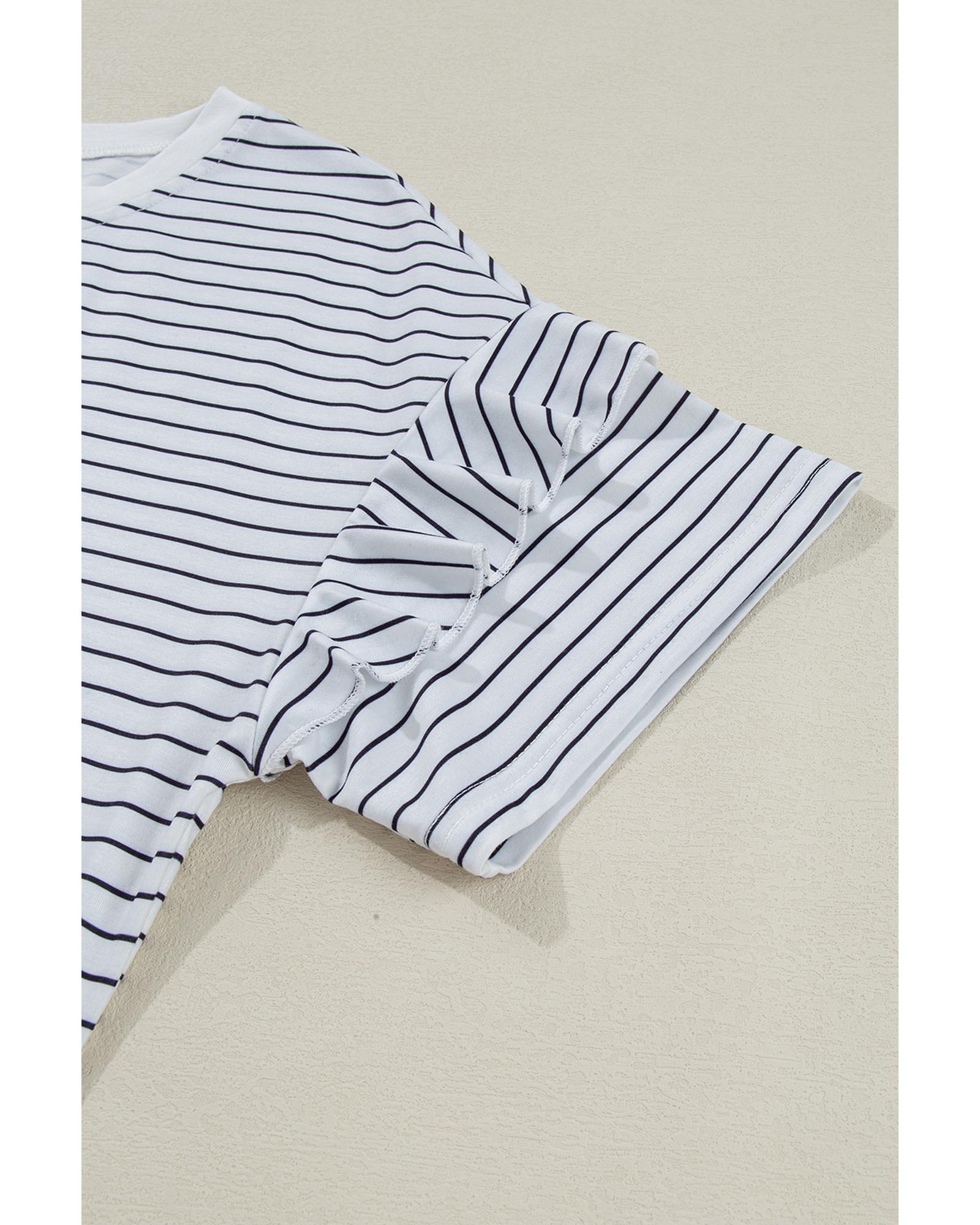 White Stripe Ruffled Short Sleeve Crew Neck T Shirt Shift Mini Dress – M