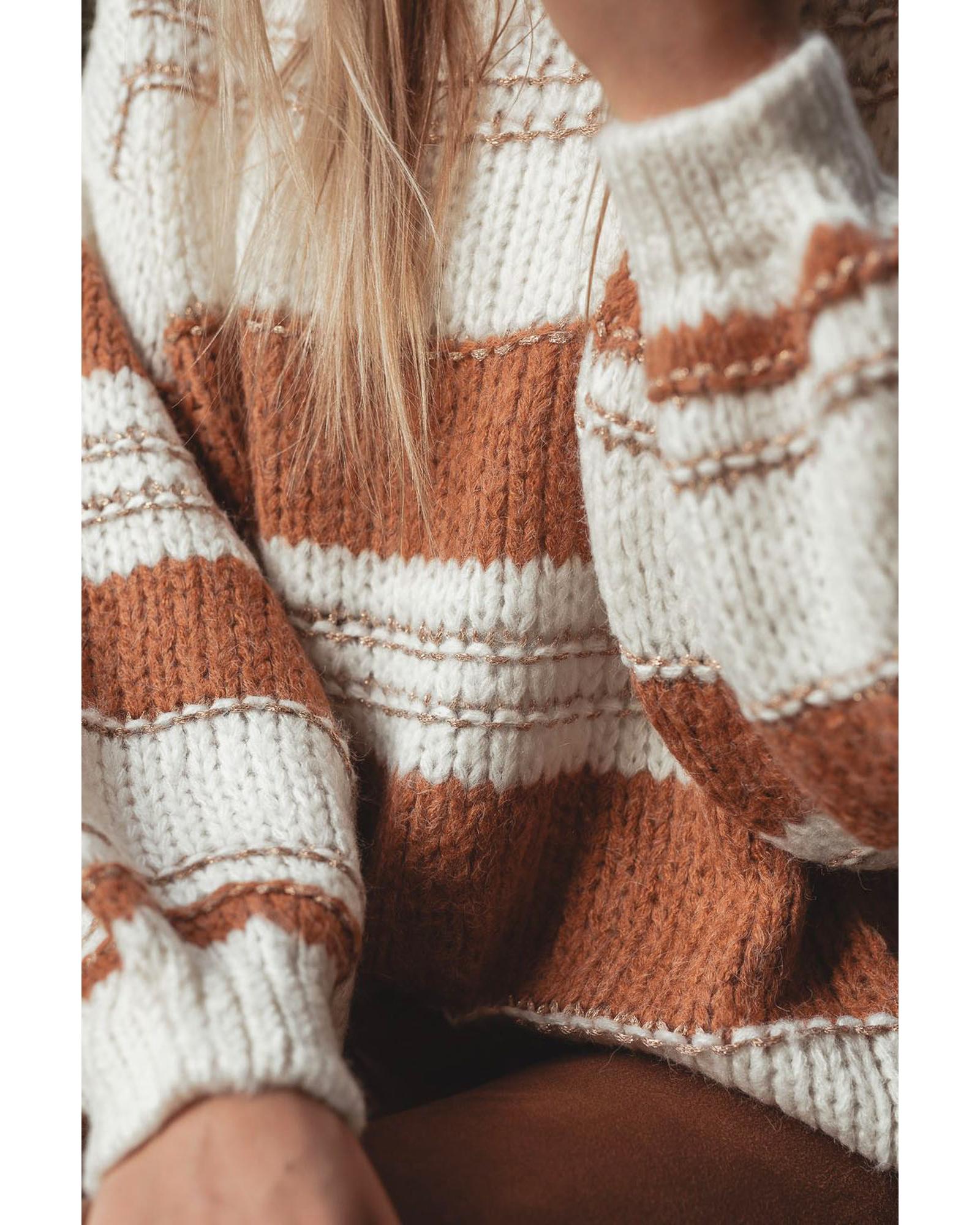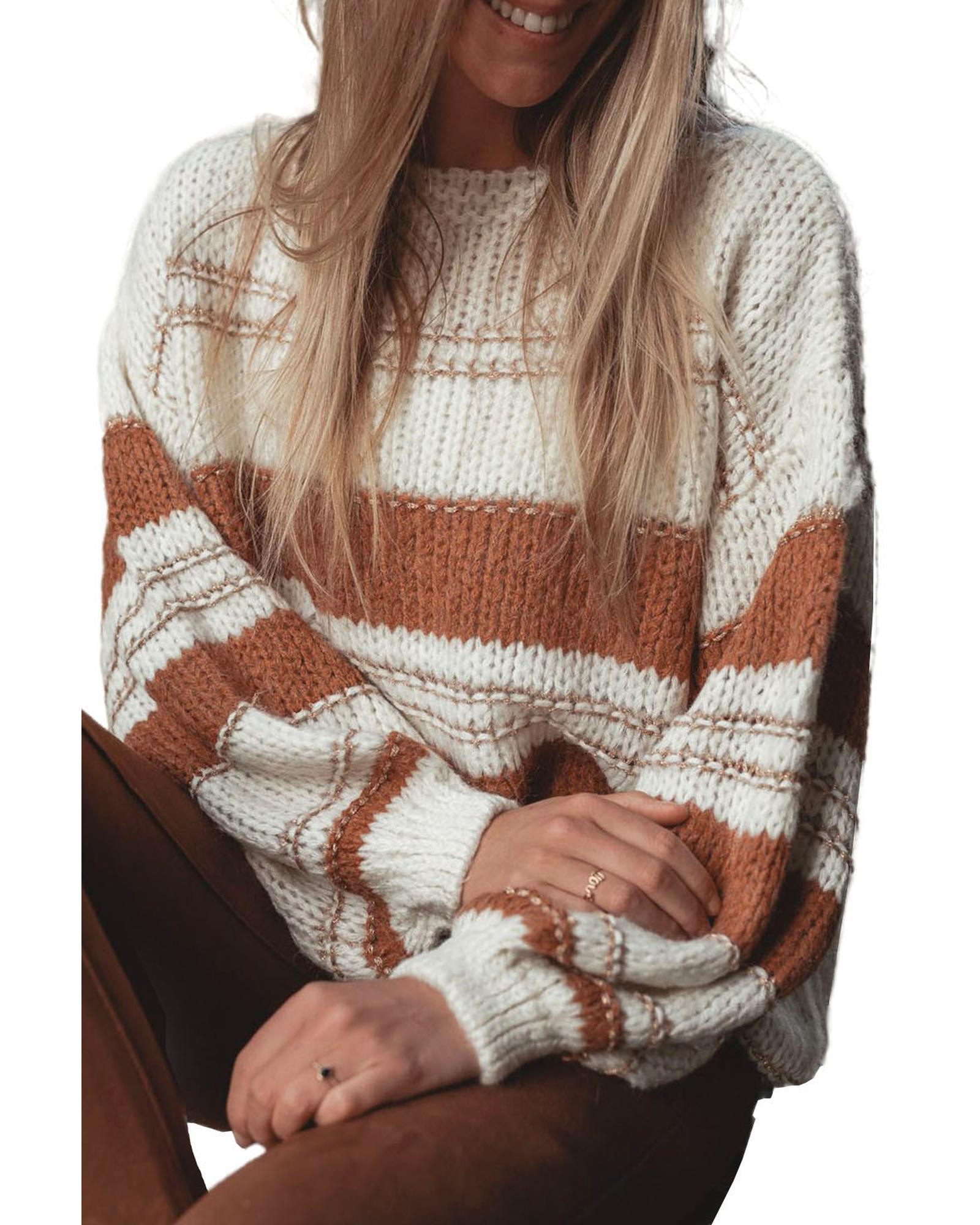 White Striped Knit Puff Sleeve Casual Sweater – L