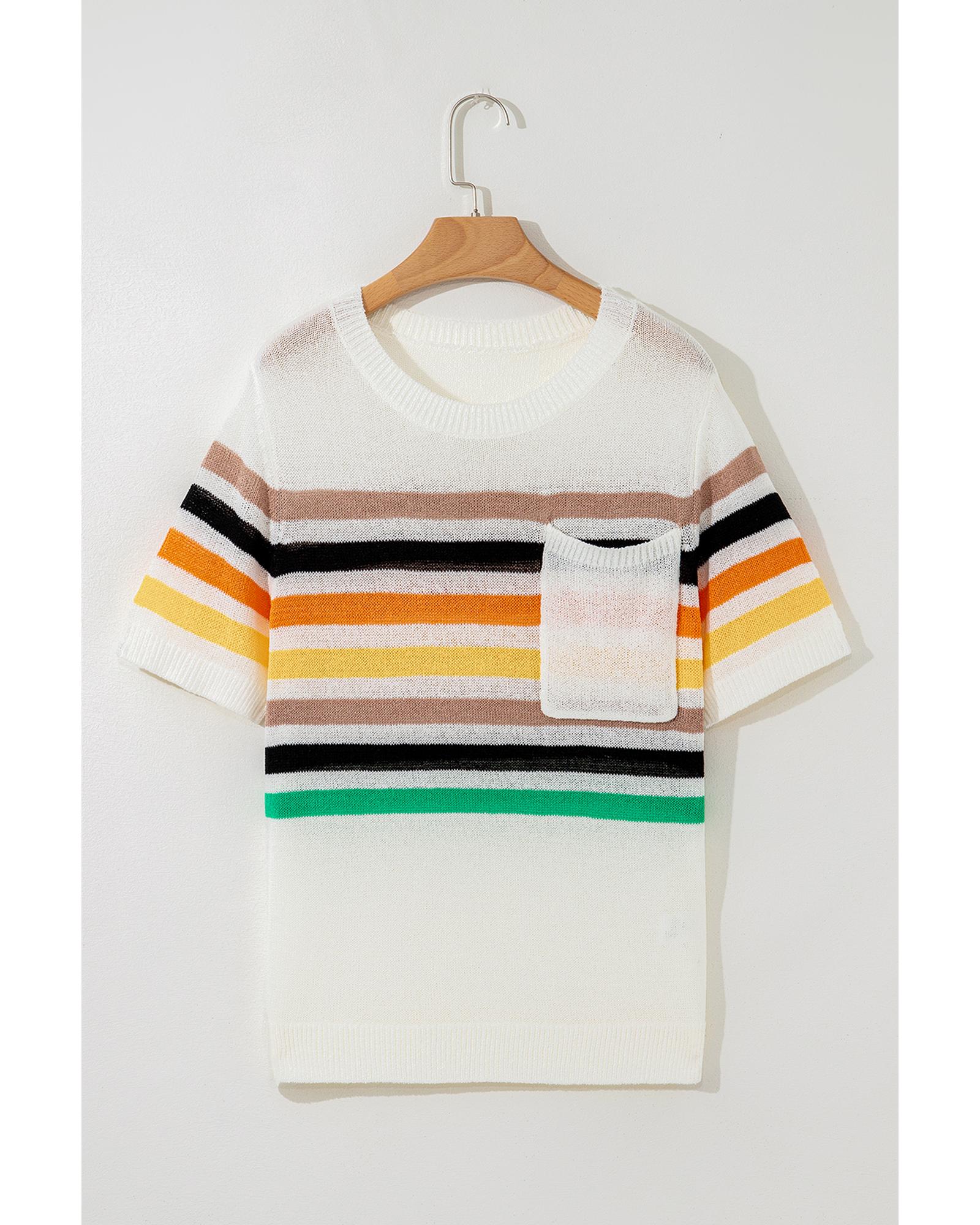 - White Striped Pocketed Loose Fit Crewneck Knitted T