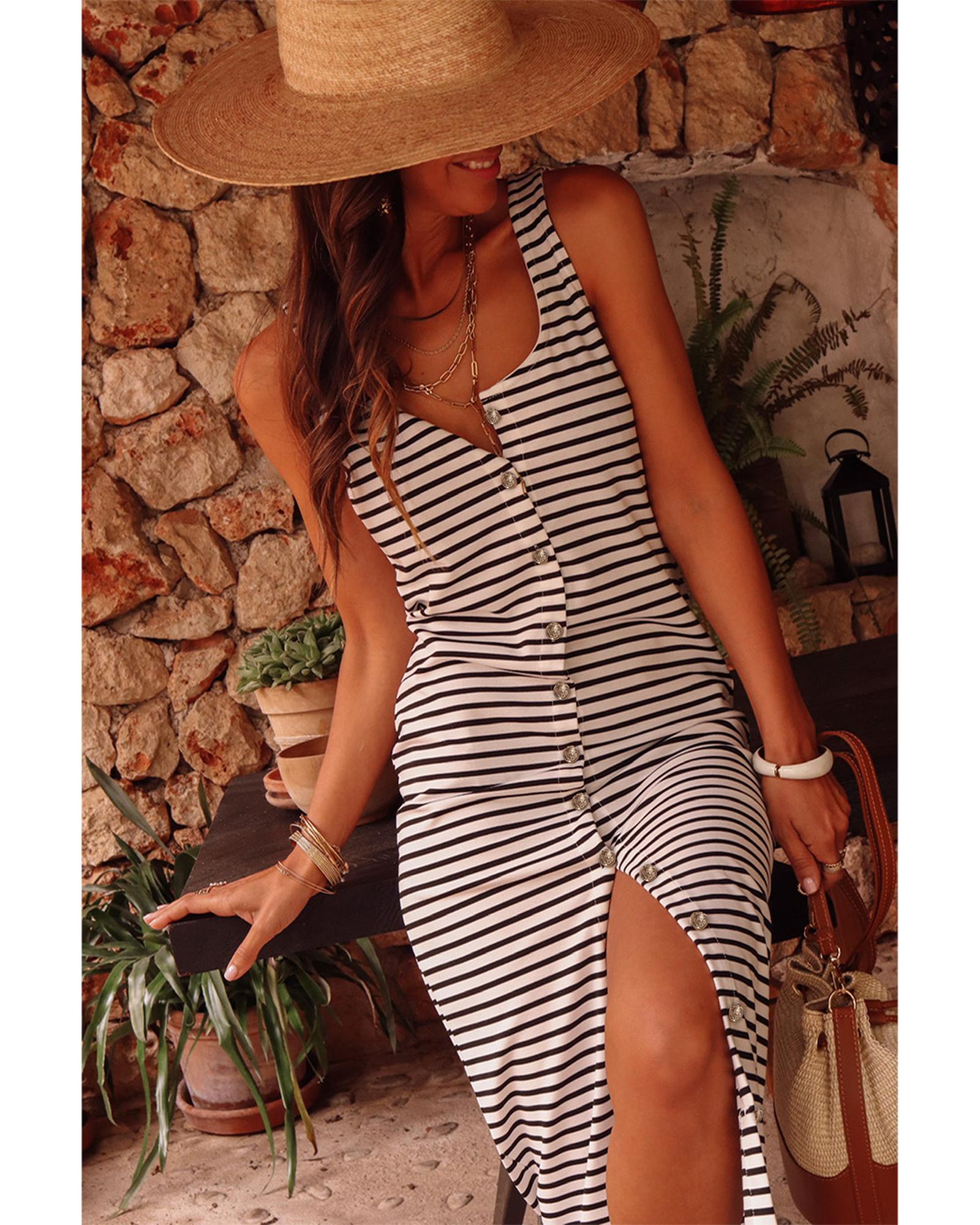 White Striped Print Sleeveless Buttoned Maxi Dress – S