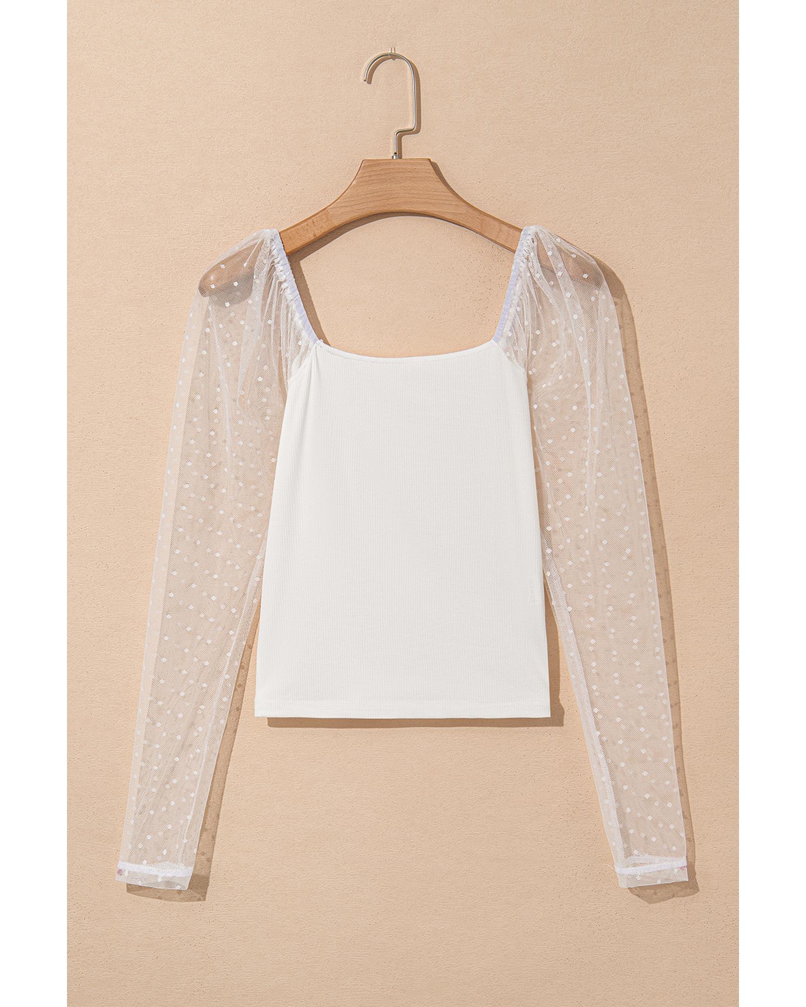 White Swiss Dot Mesh Long Sleeve Square Neck Slim Top – XL