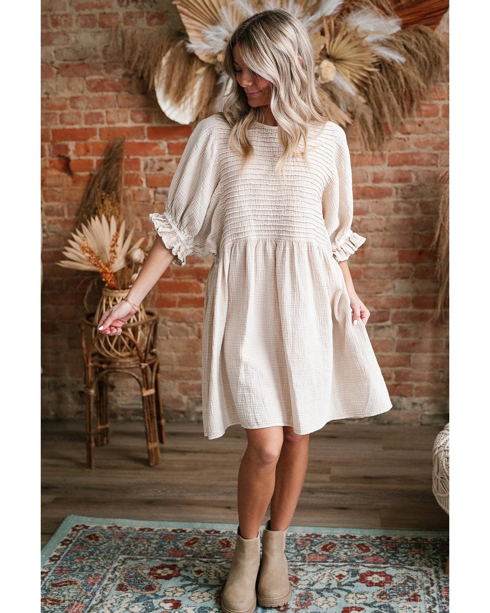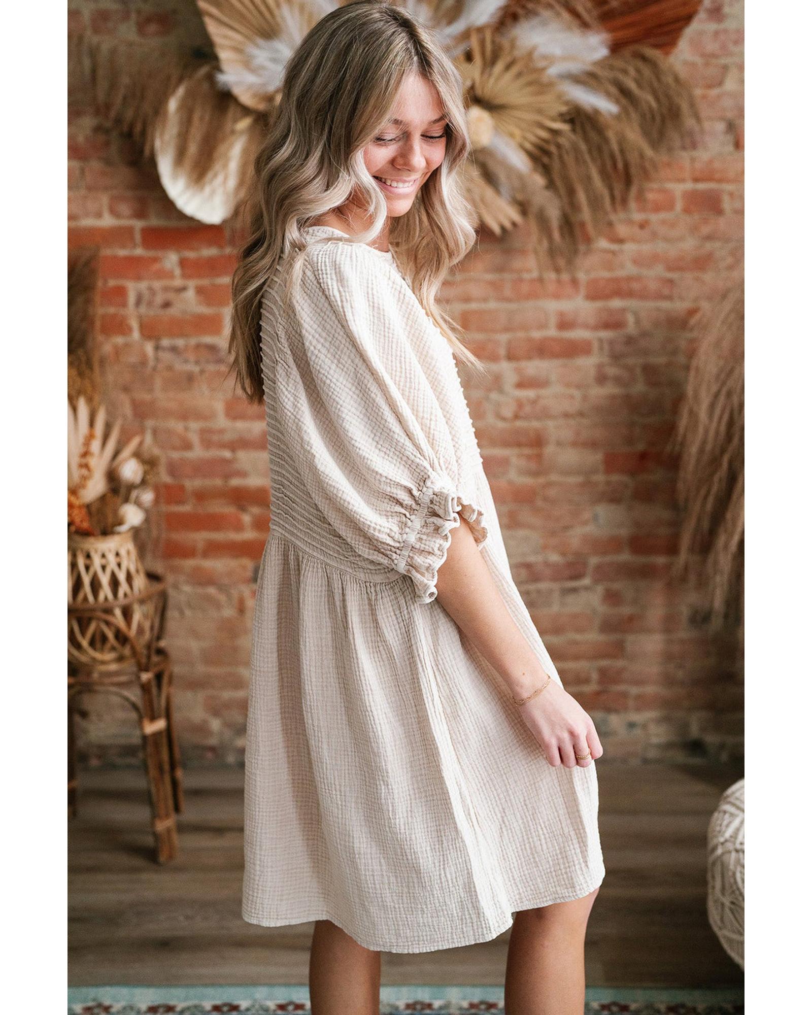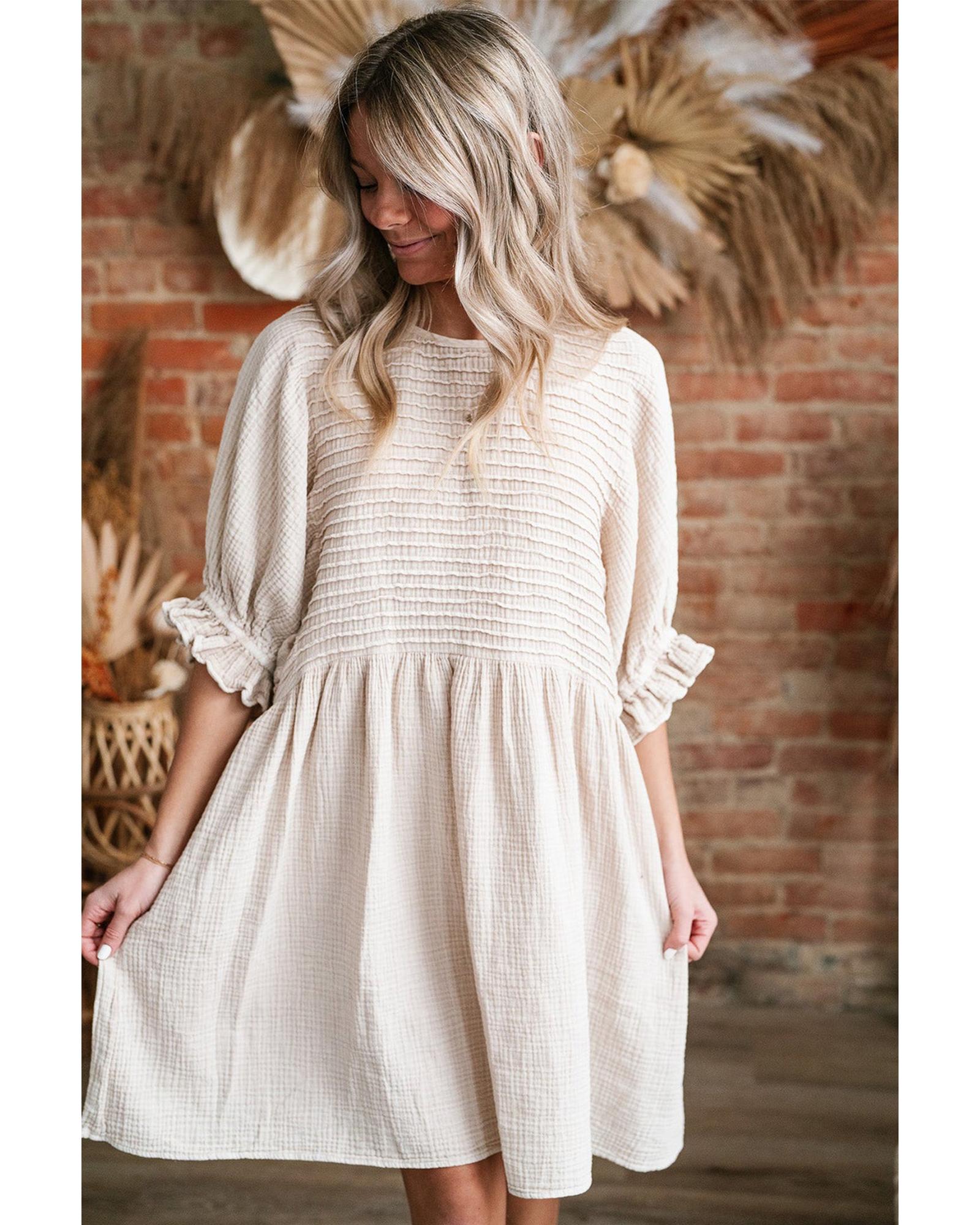 - White Textured Ruffled Puff Sleeve Loose Dress