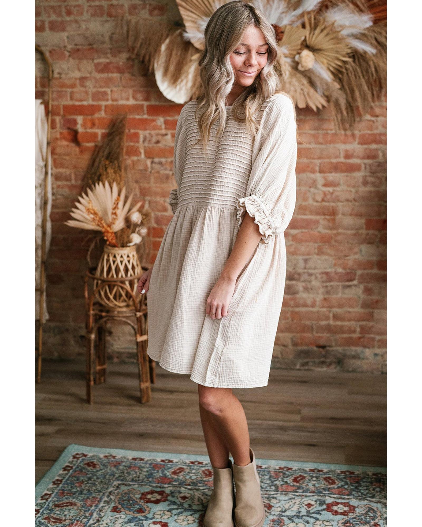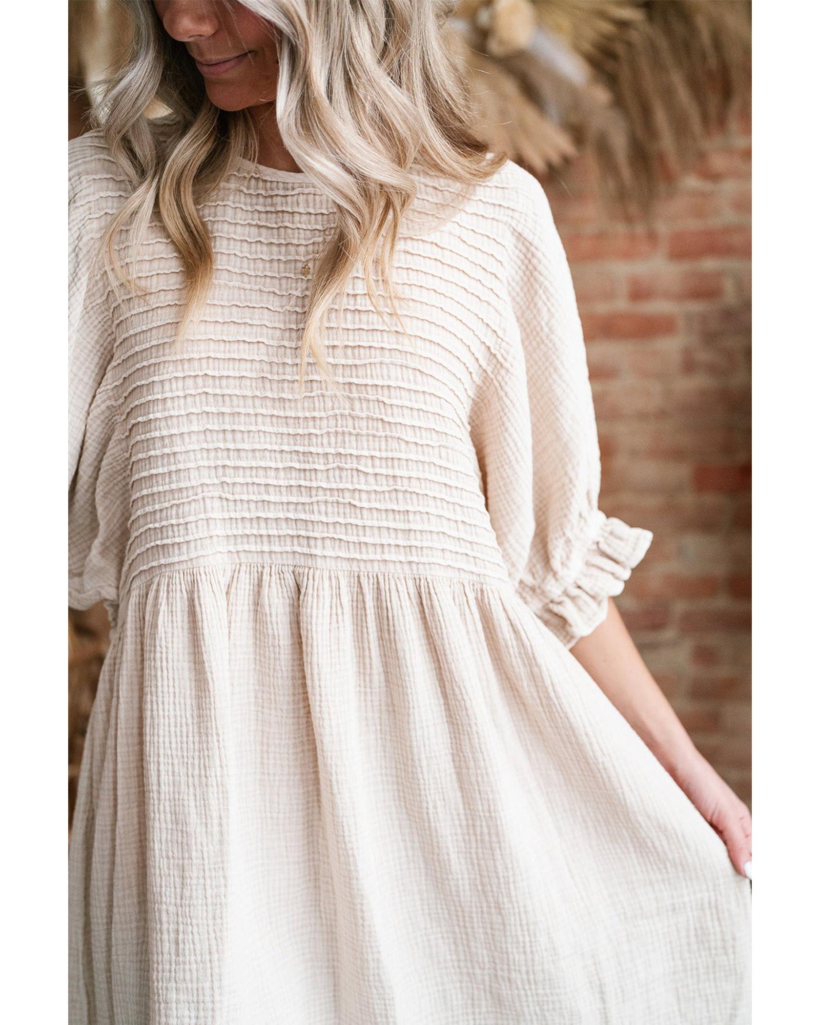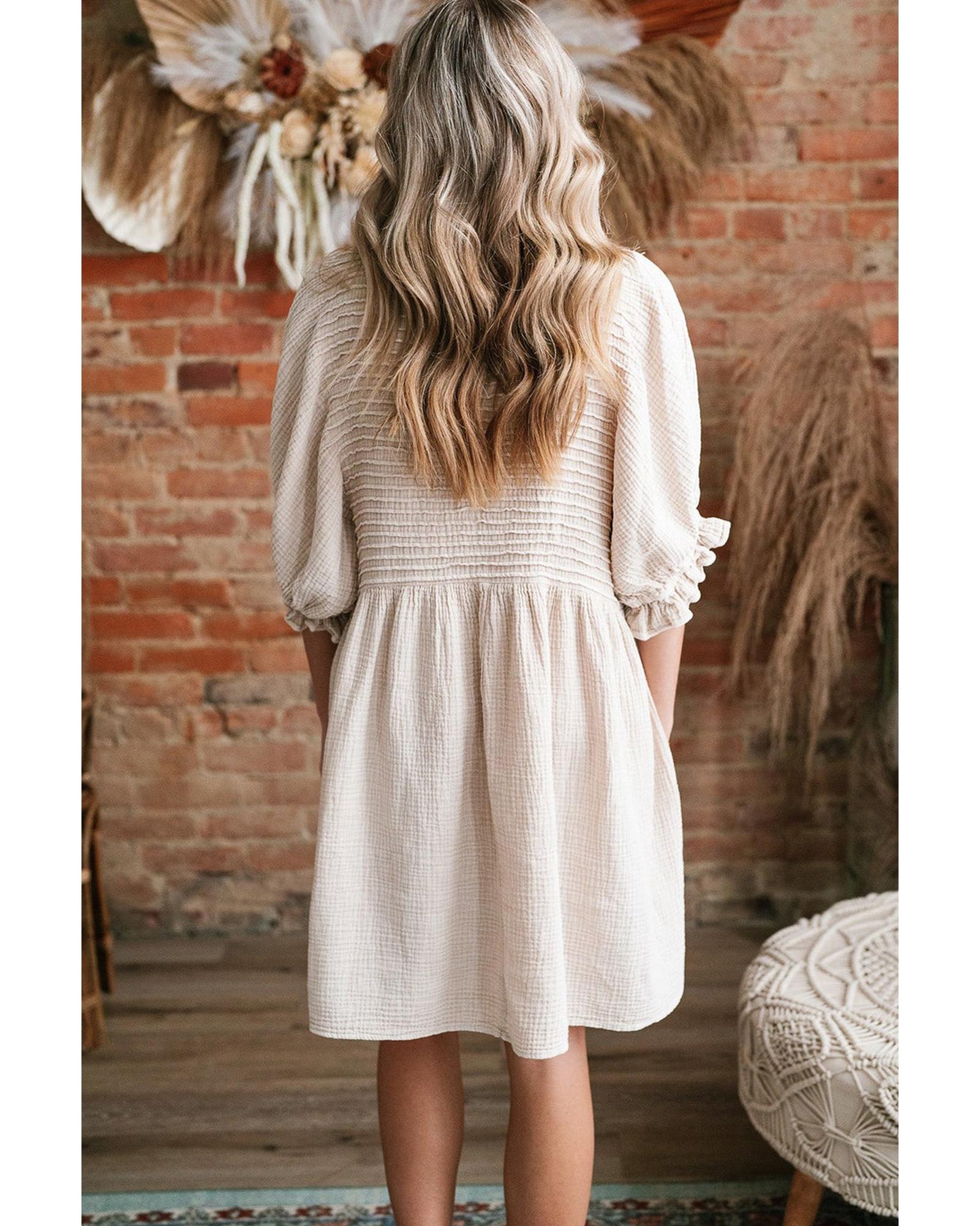 - White Textured Ruffled Puff Sleeve Loose Dress