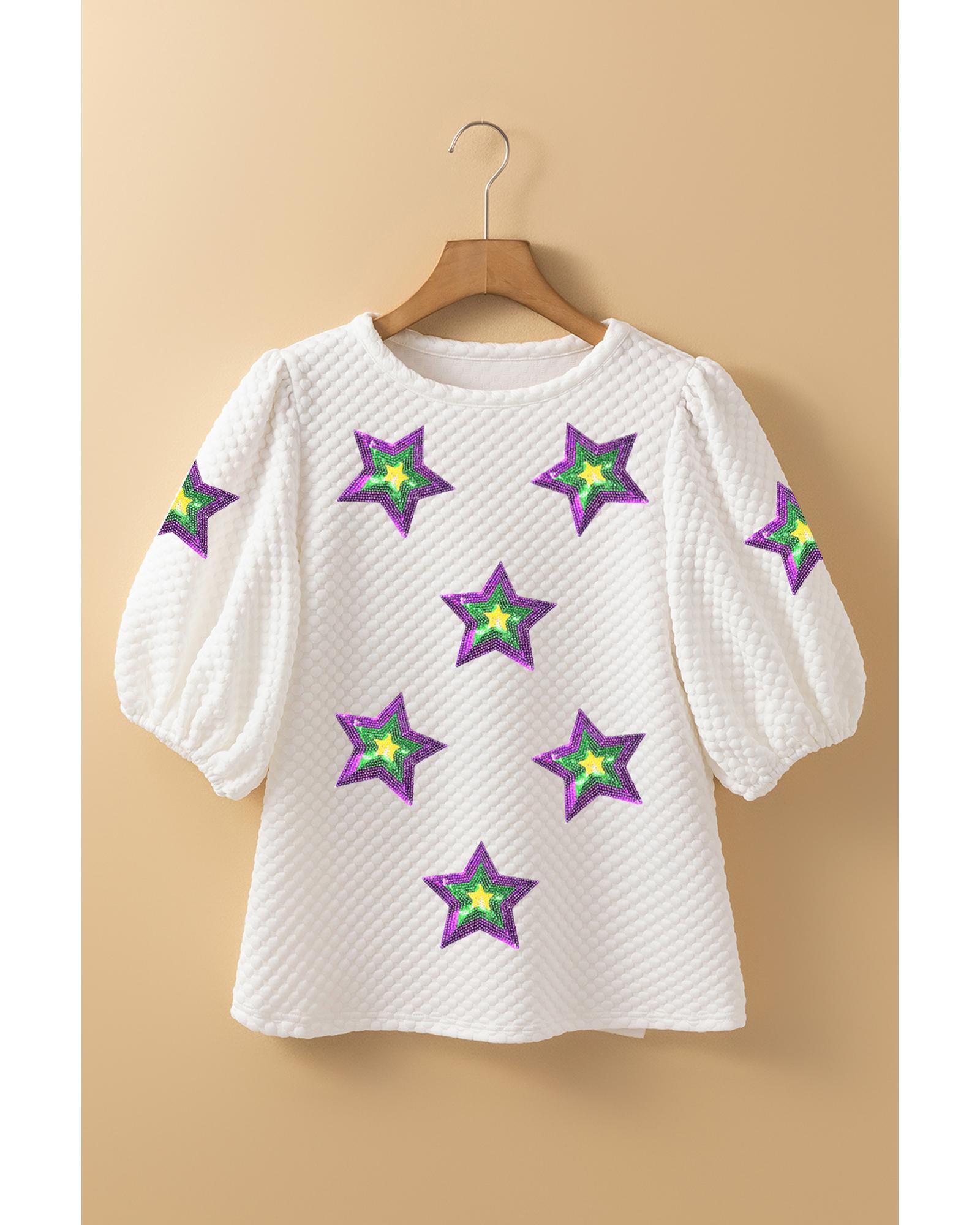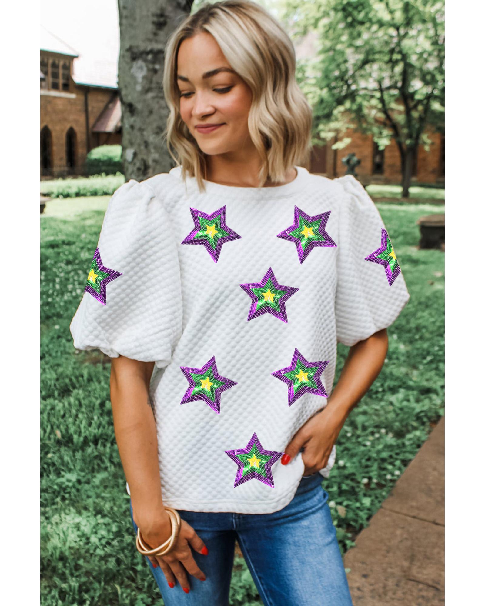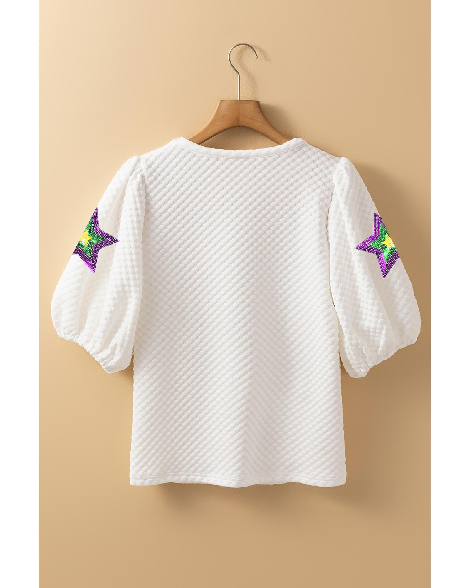 - White Textured Sequin Mardi Gras Star Graphic Puff Sleeve Blouse