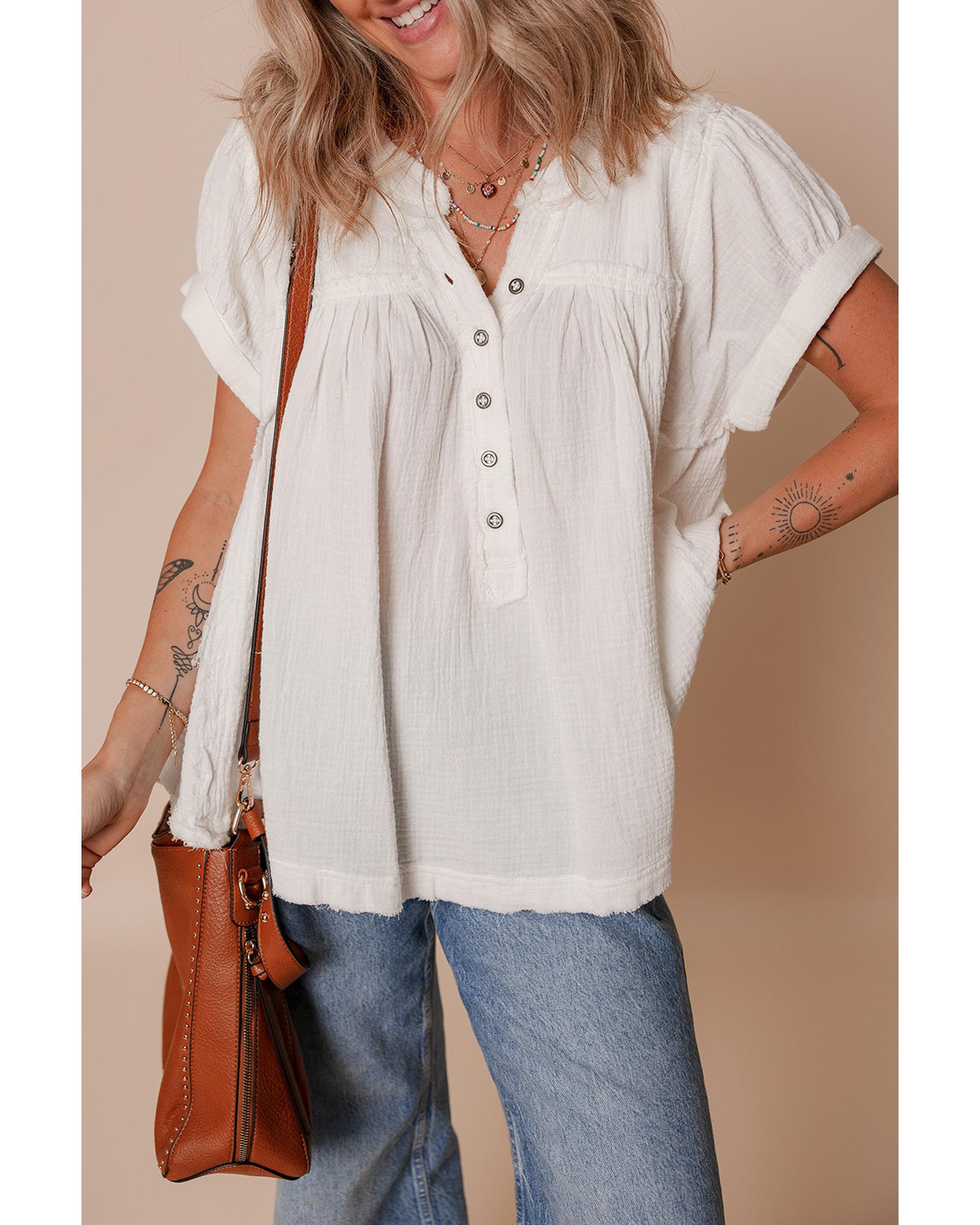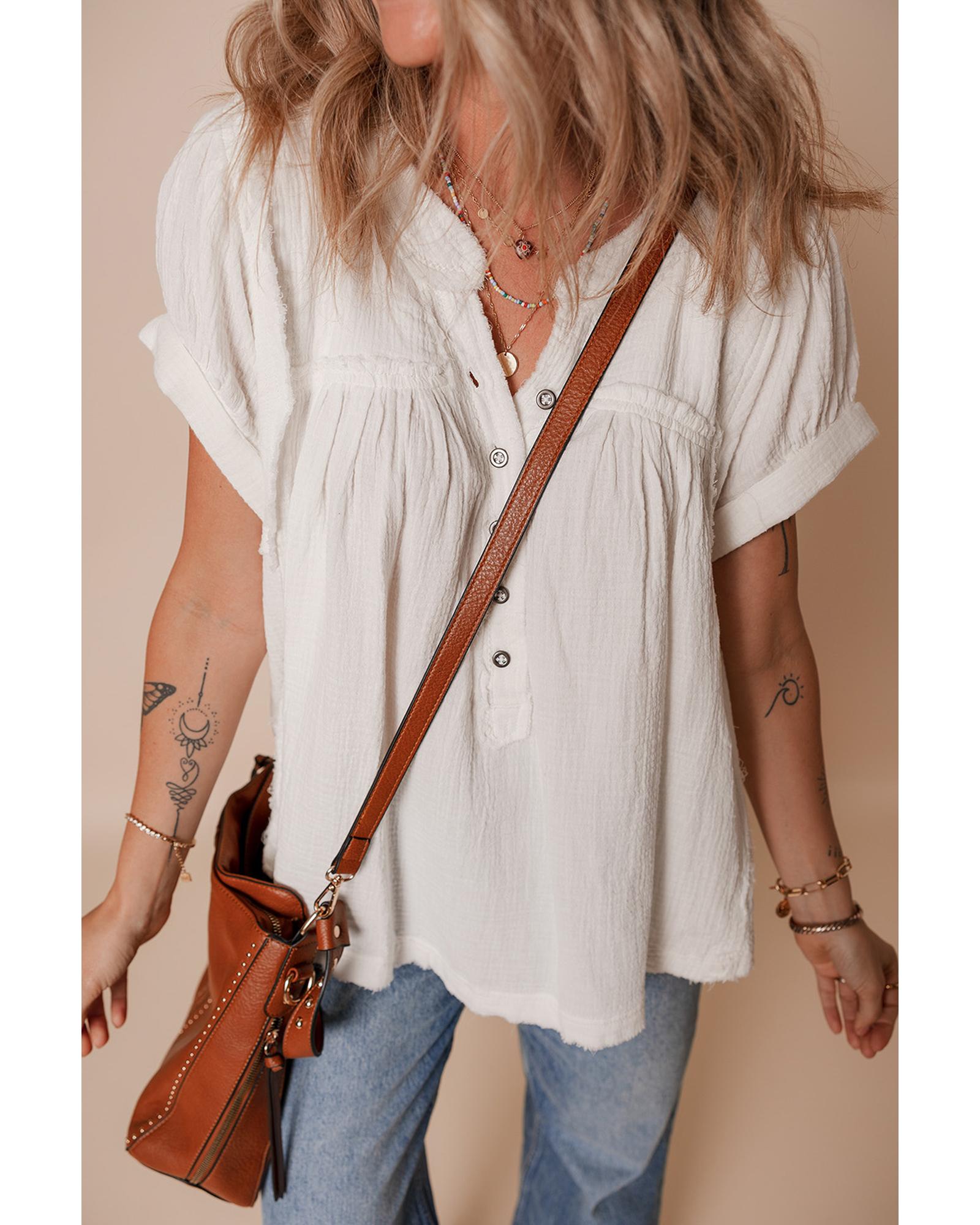 White Textured Short Sleeve Buttons Frayed Blouse – XL