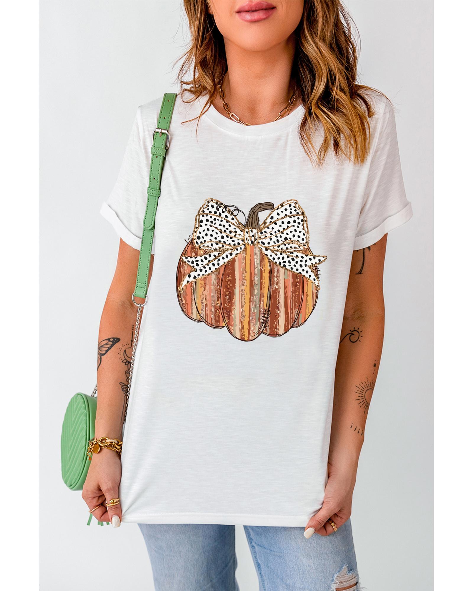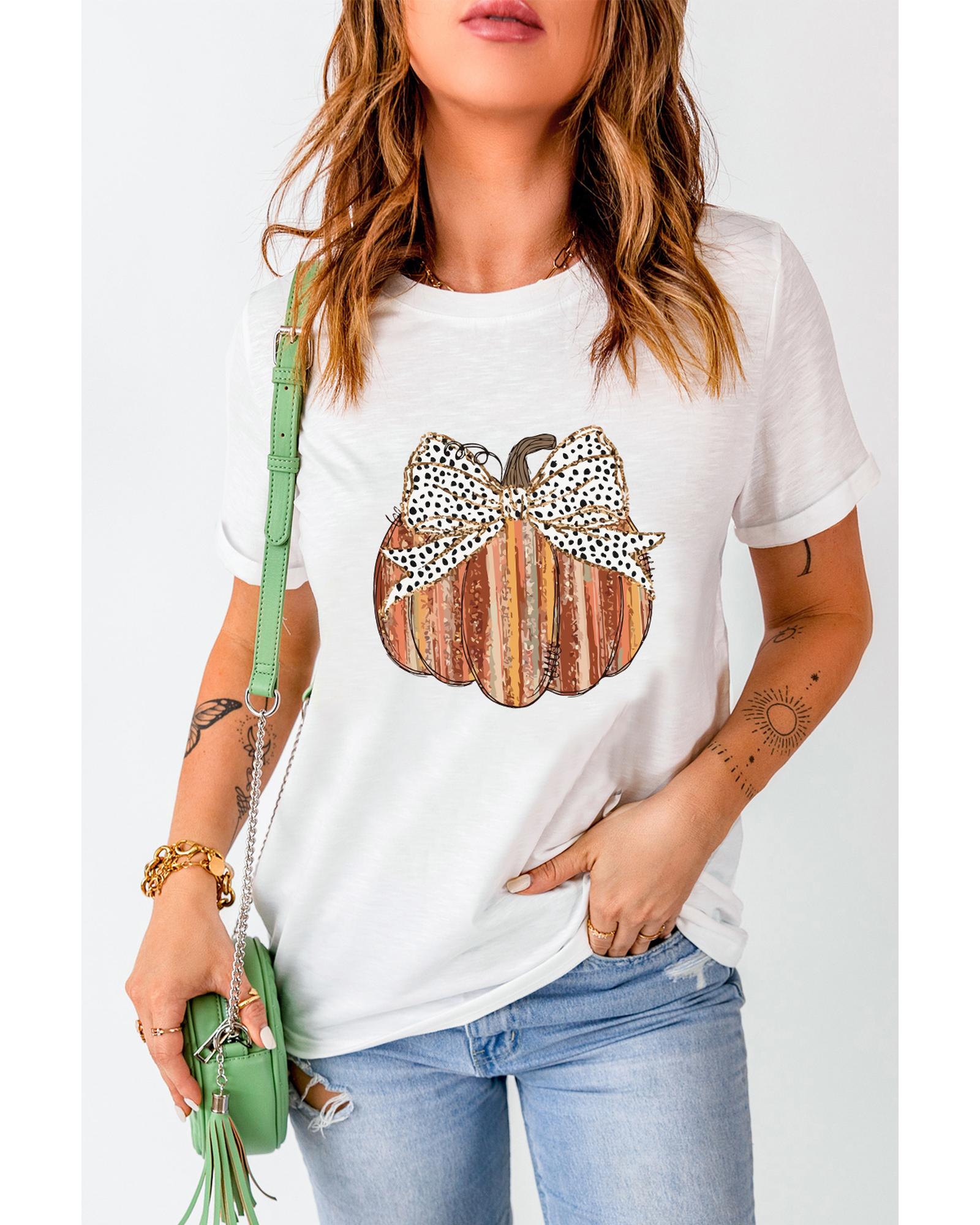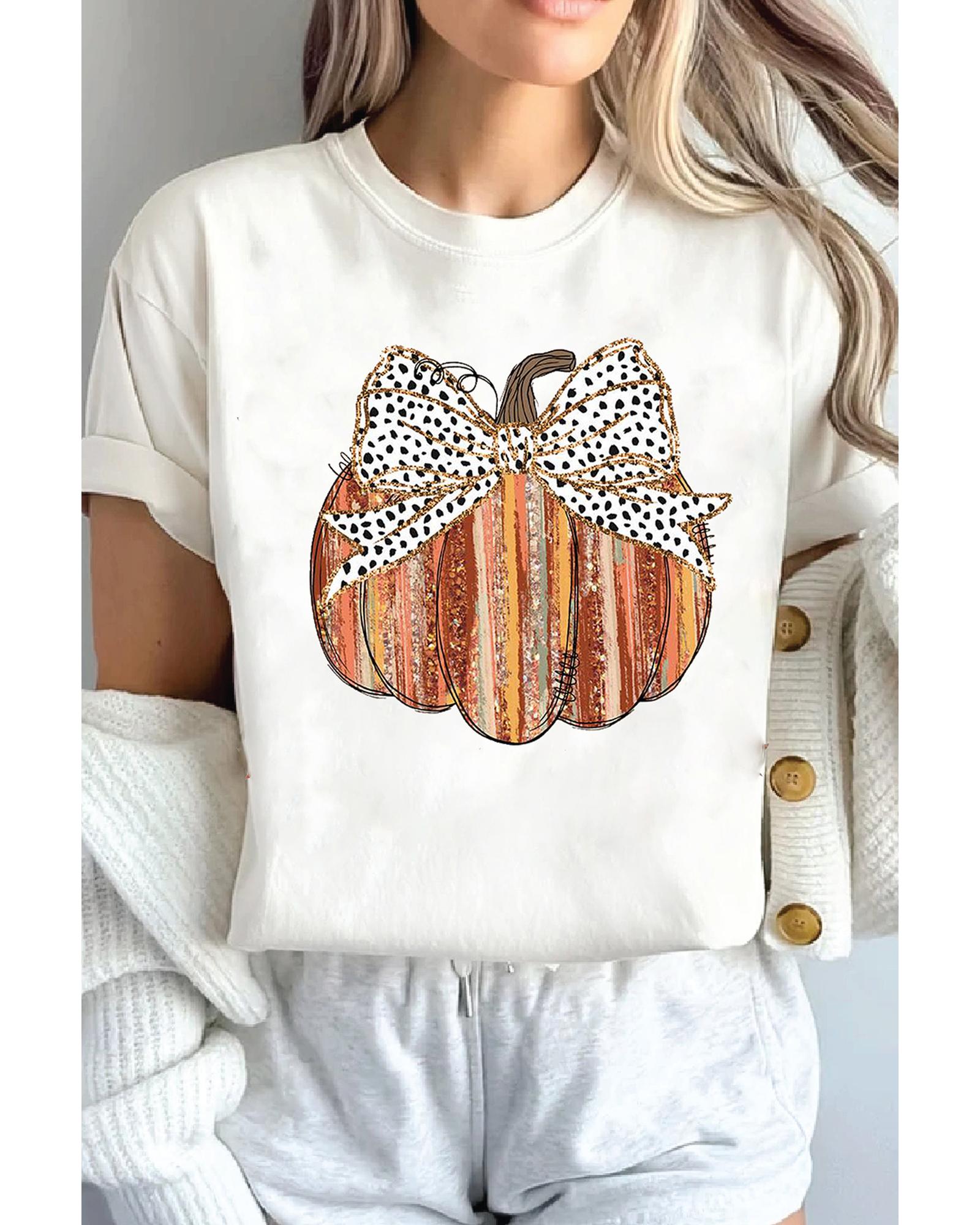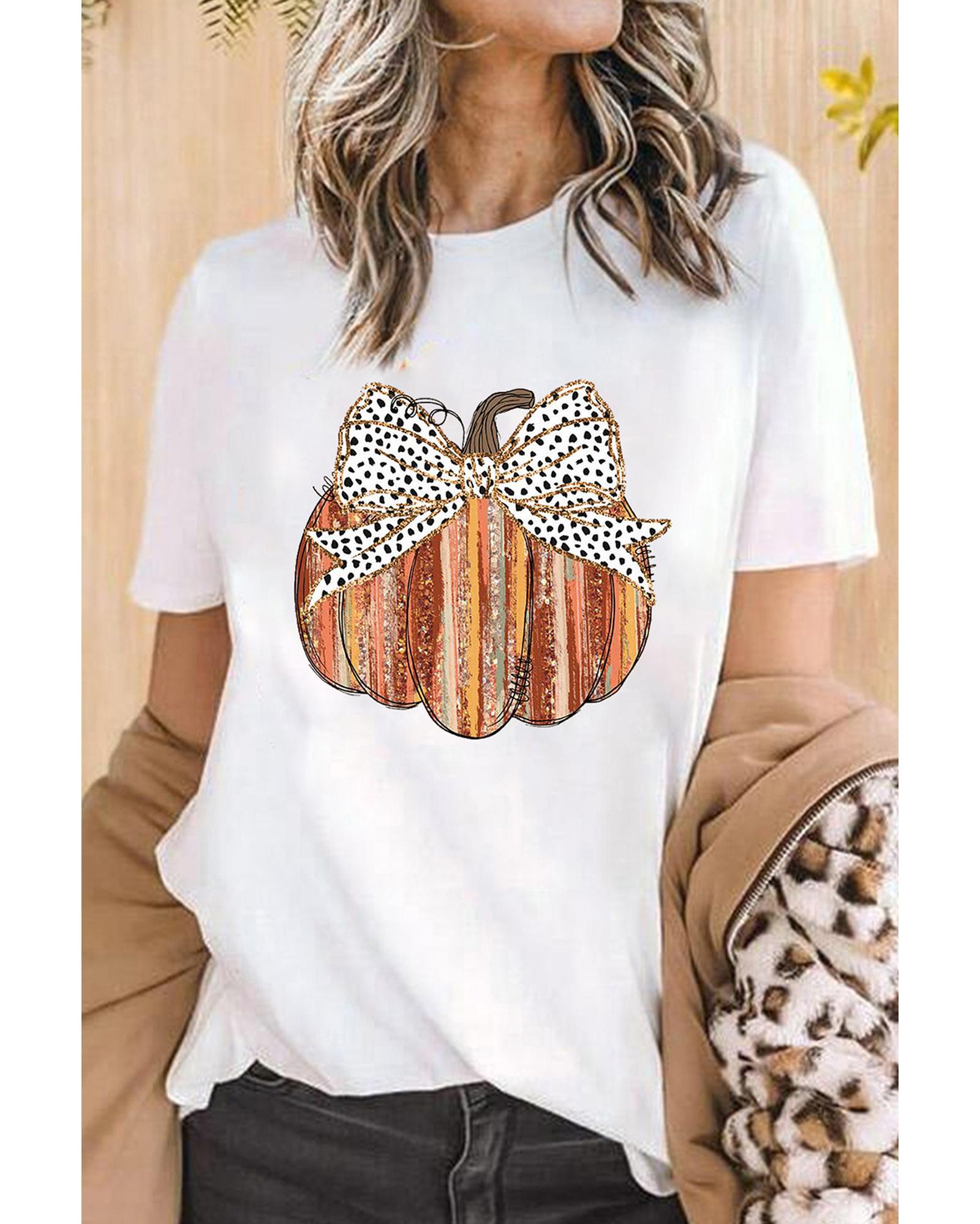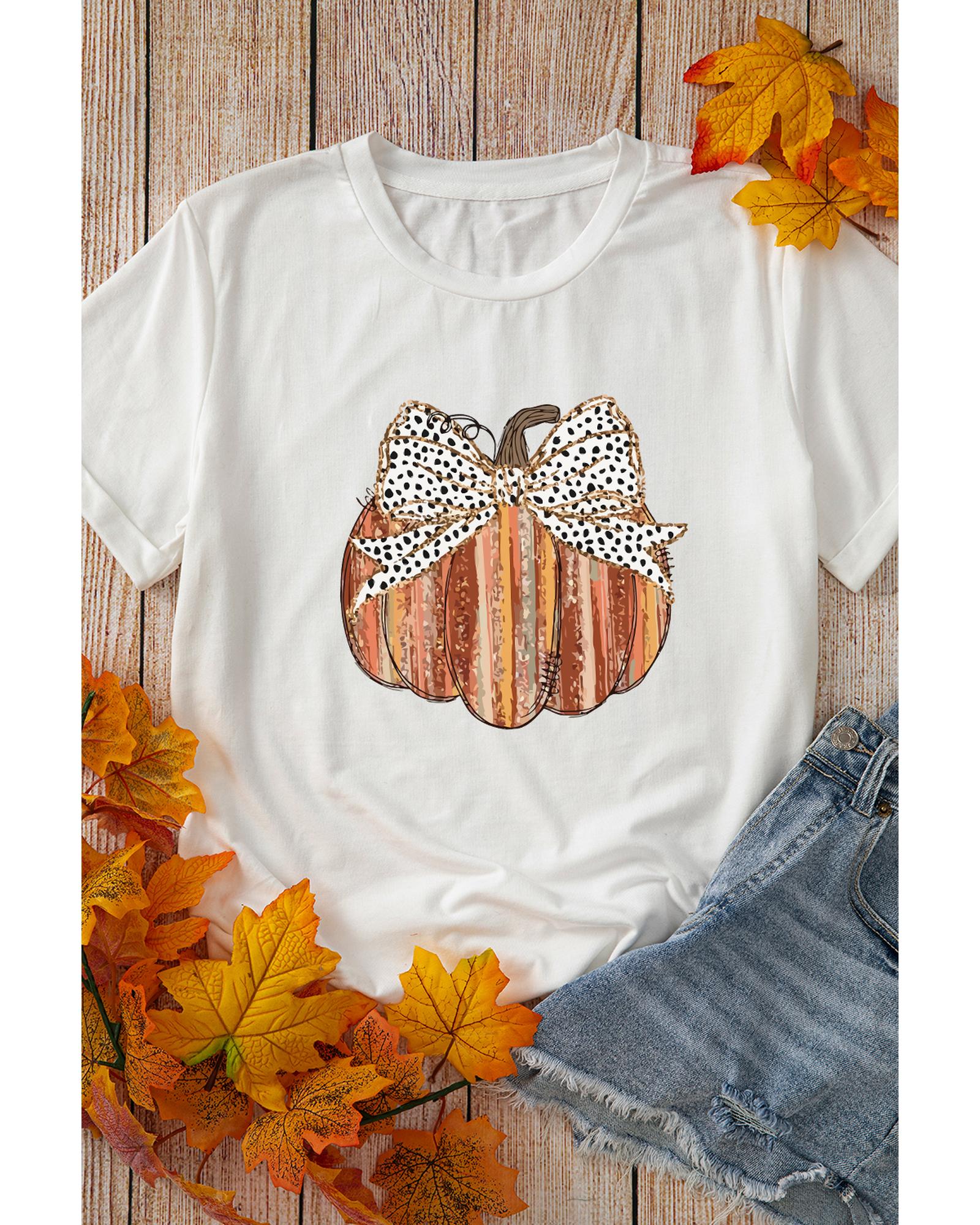 White Thanksgiving Bow Knot Pumpkin Print Round Neck T Shirt – 2XL