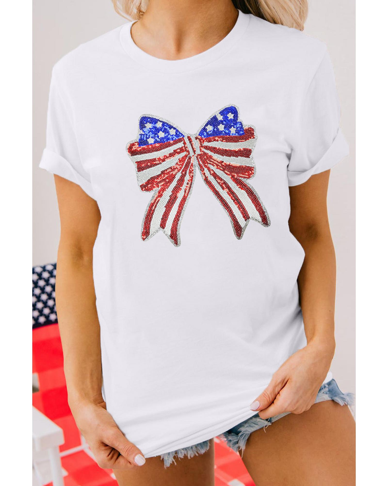 White USA Flag Bow Knot Patched Crew Neck T Shirt – M