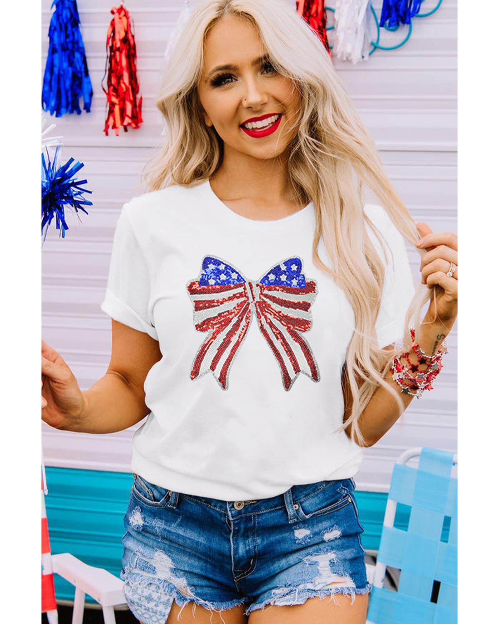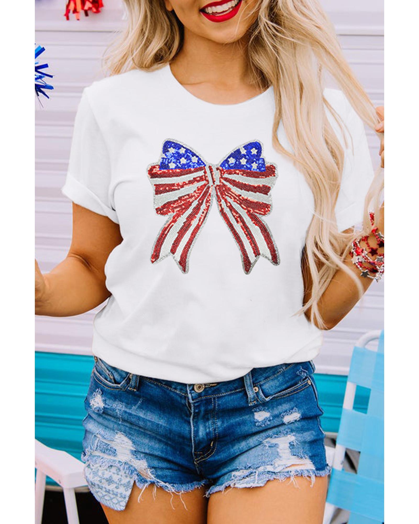 White USA Flag Bow Knot Patched Crew Neck T Shirt – XL